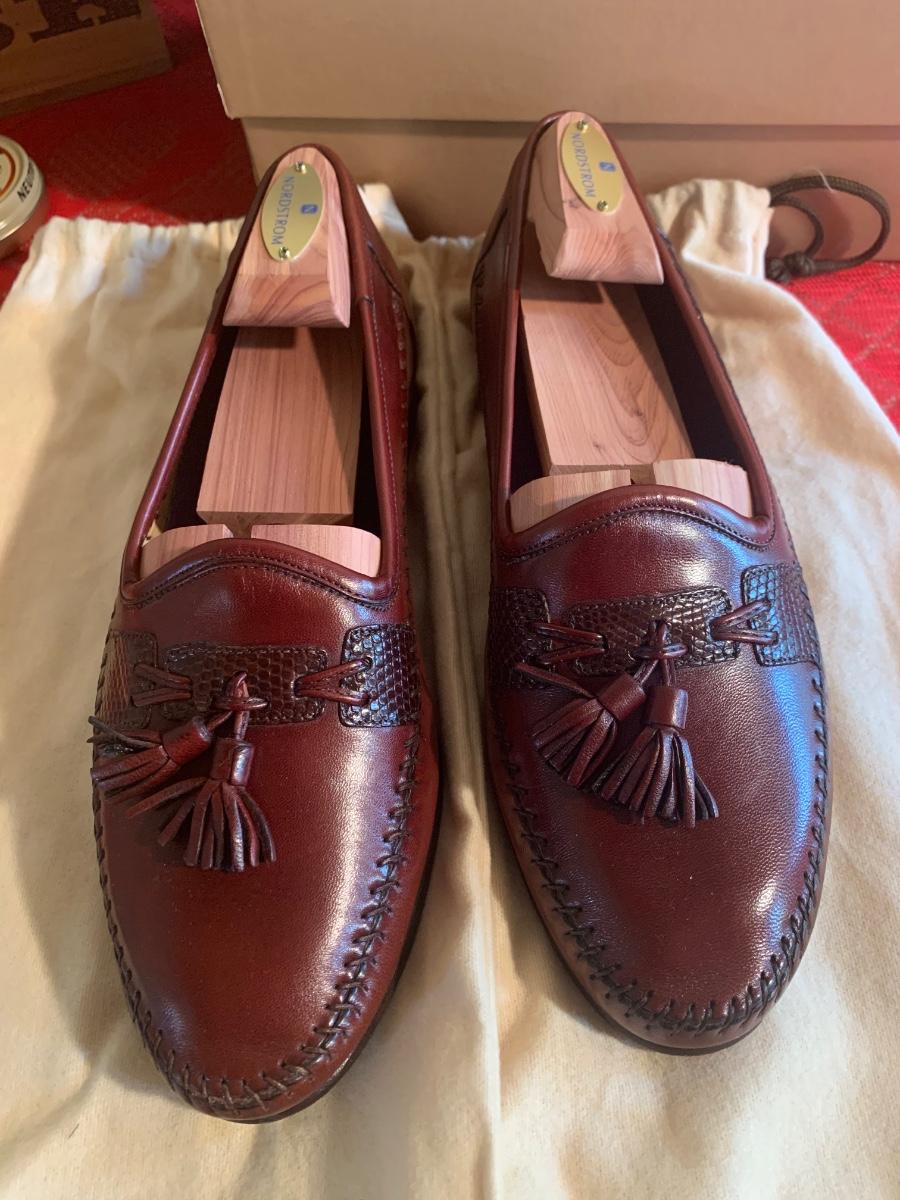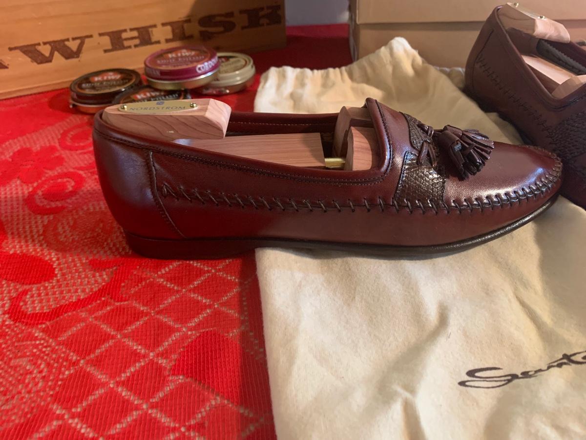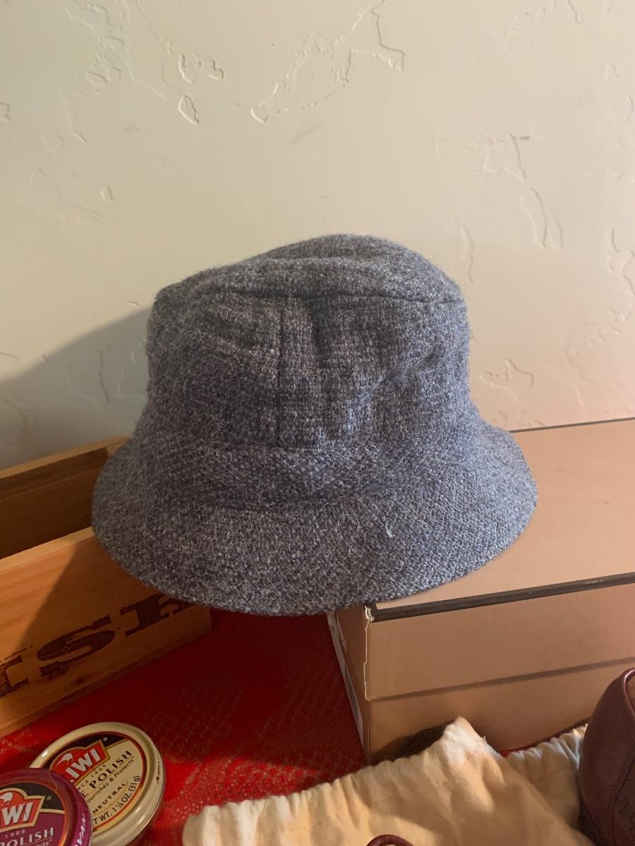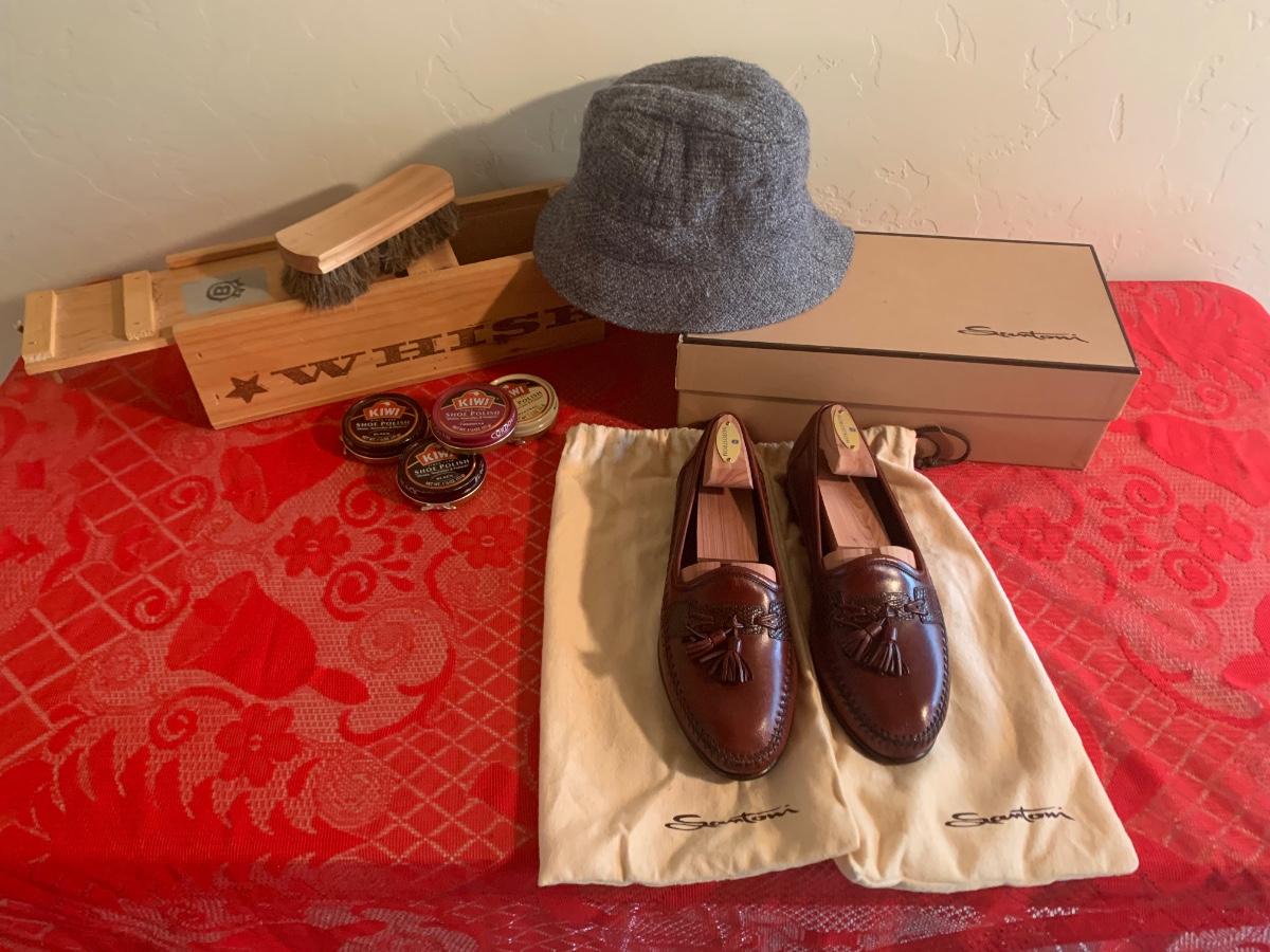 Mens leather loafer shoes in great condition with box Santoni brand, men’s vintage wool Millars hat from Connemara, Ireland in great condition and more
