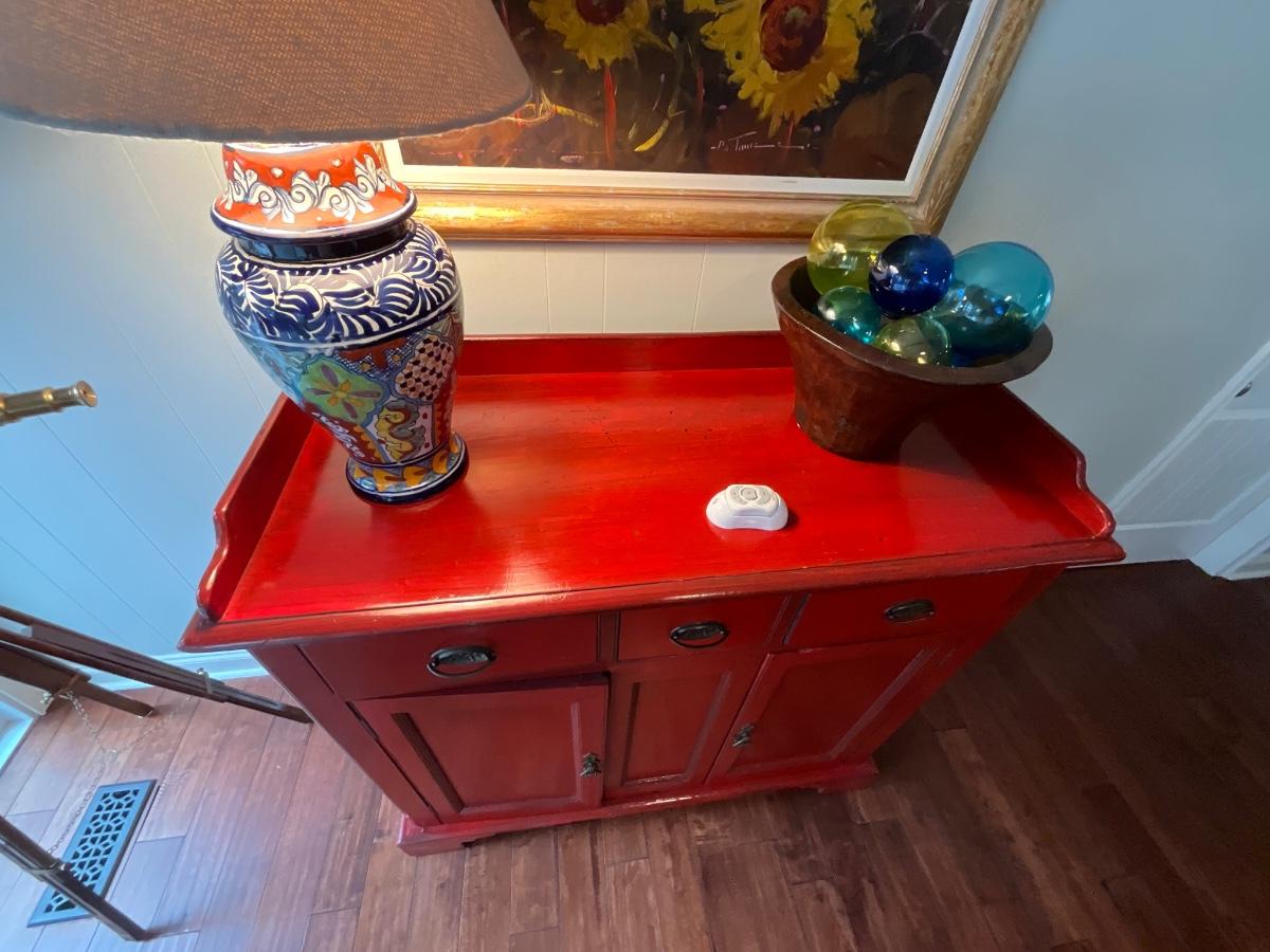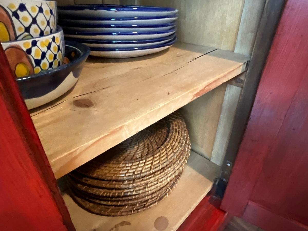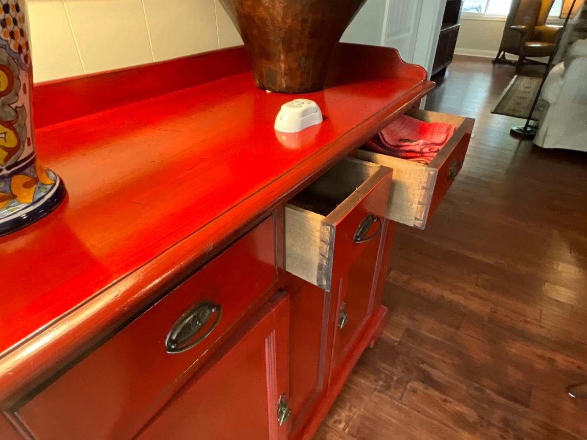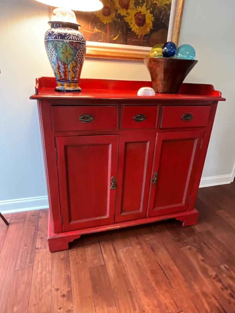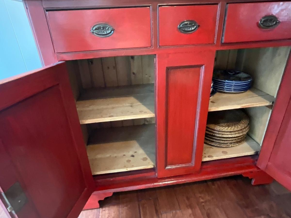Red distressed storage cabinets 48 inches wide, 21 inches deep, 46 inches tall.