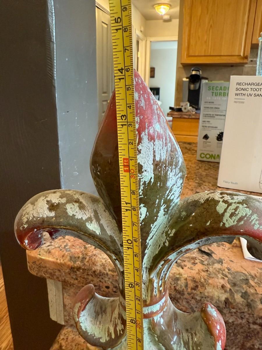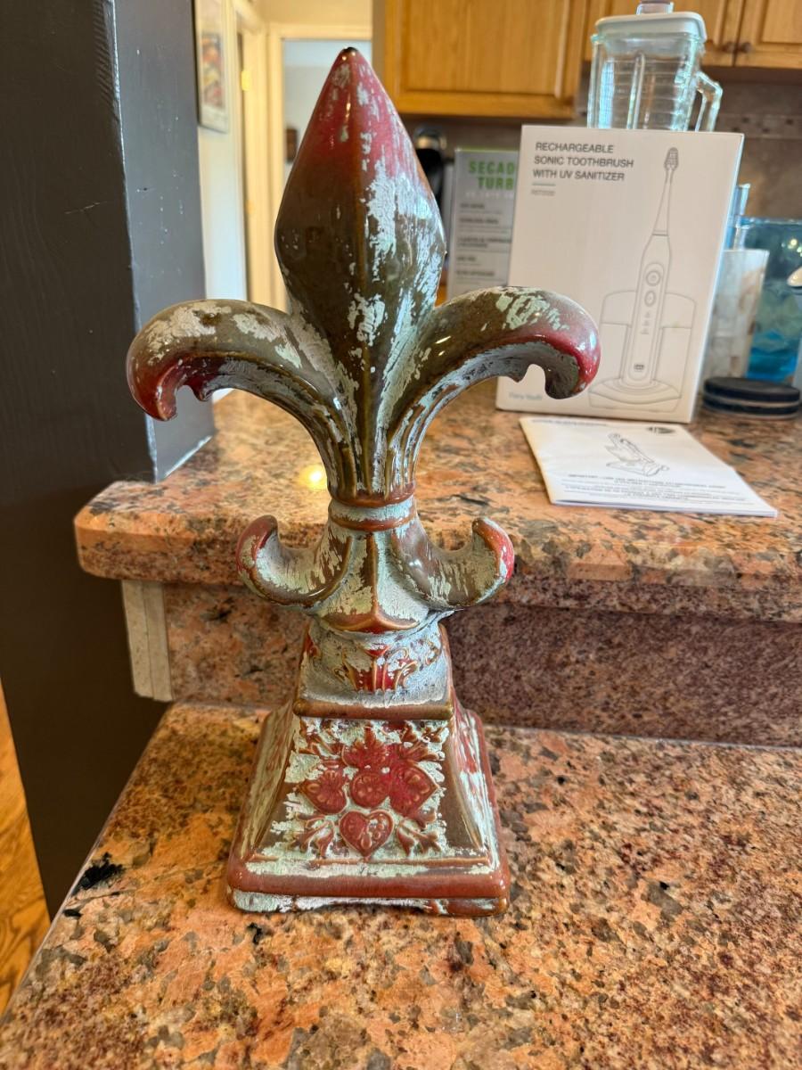 Add a touch of French charm to your home or garden with this distressed fleur-de-lis finial. Heavy cast resin with worn red and sage green finish gives it a rustic, vintage look.