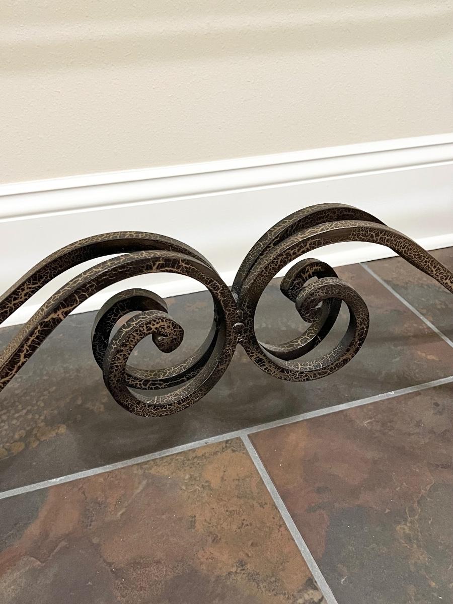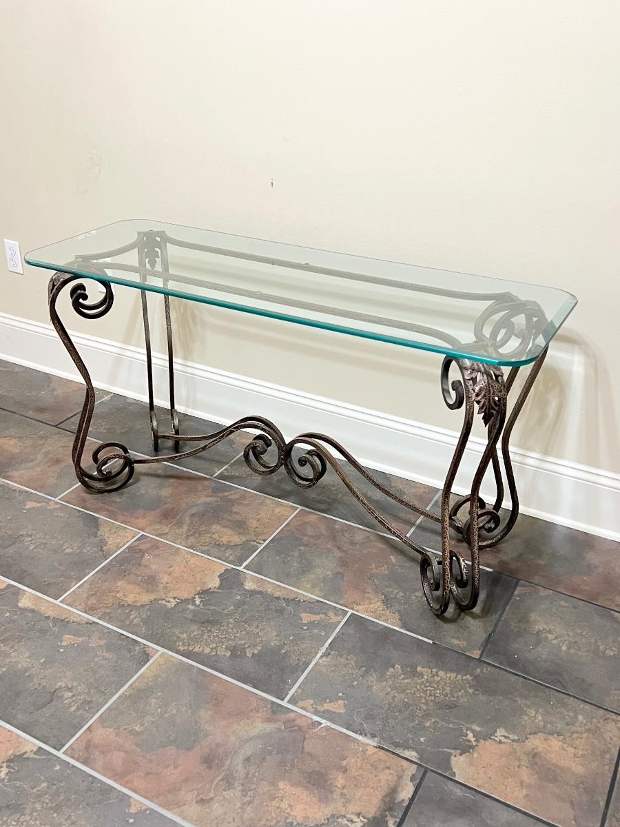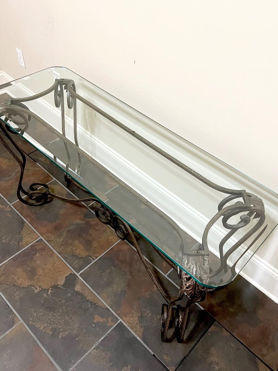 Glass has minor surface scratches ~ Metal base is medium weight ~ No brand ~ 27” H x 50” W x 18” D