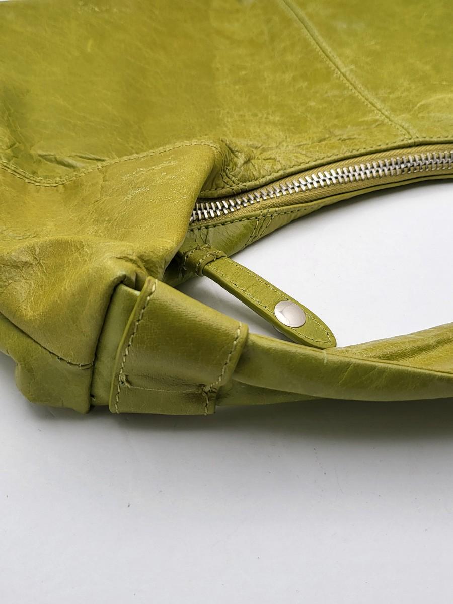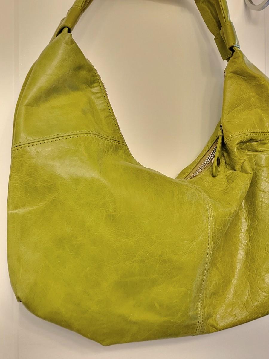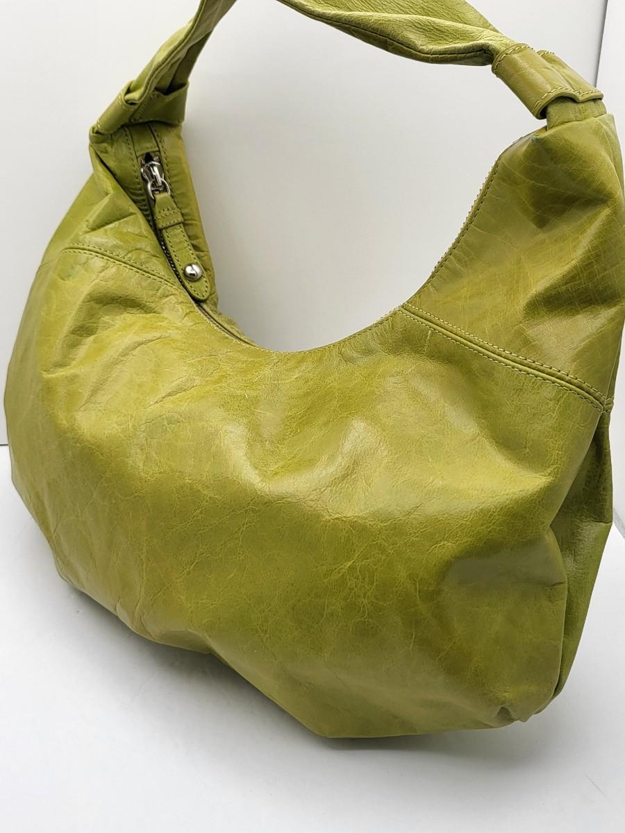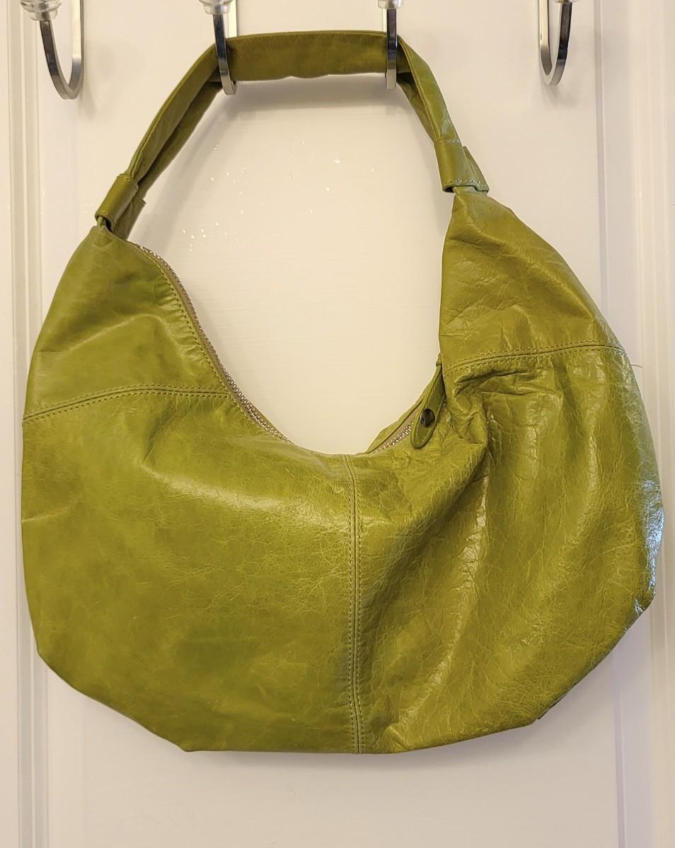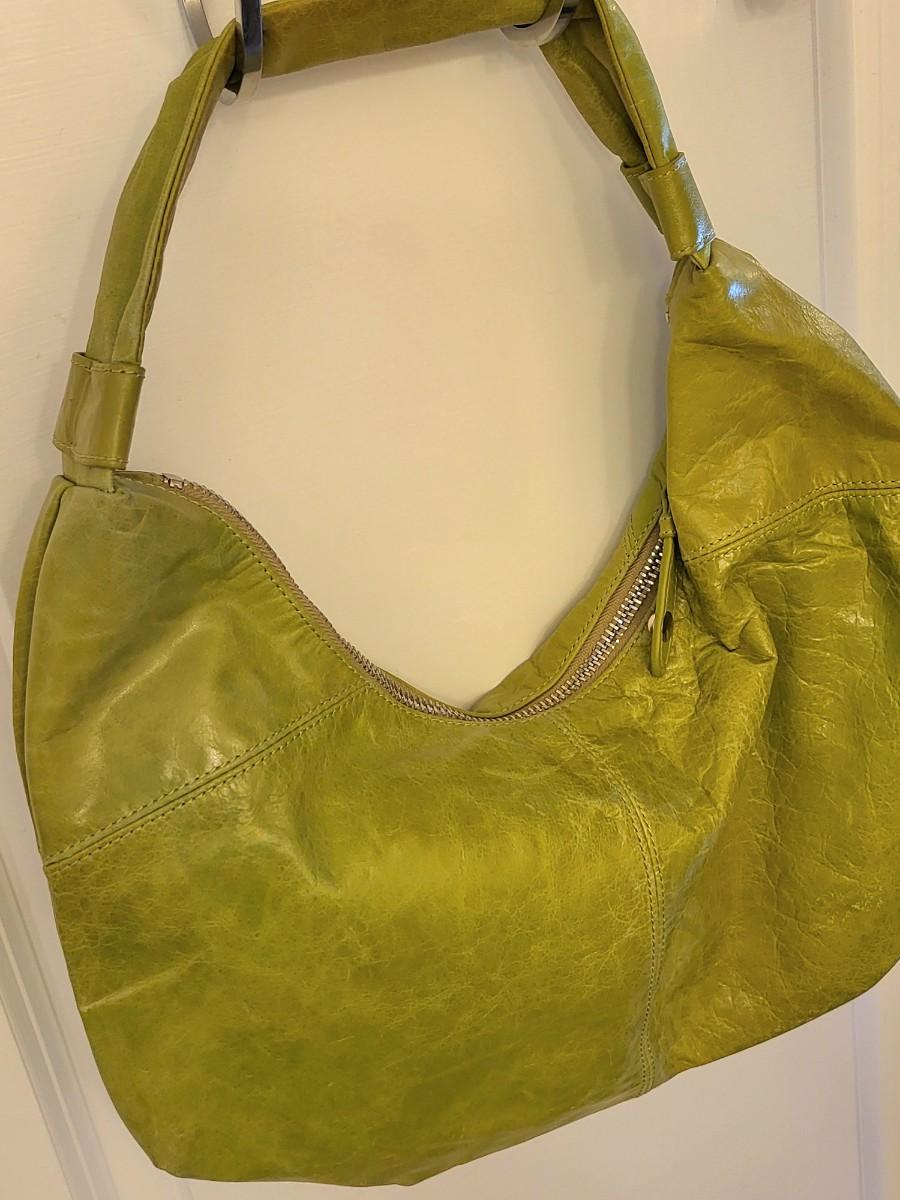Distressed green leather Hobo International shoulder bag. Measures 17" x 8.5". Zipper top. Small side zipper pocket. Very clean interior. Wide shoulder strap.