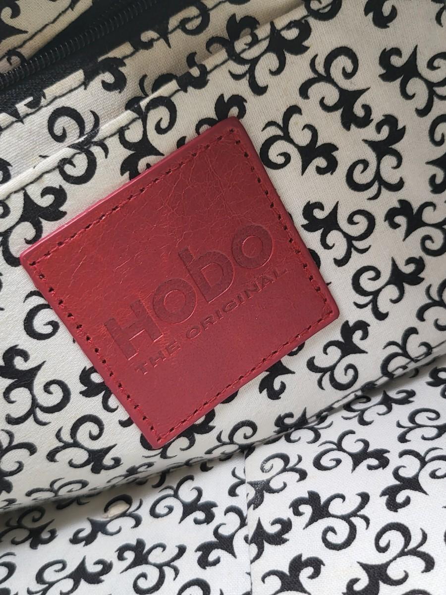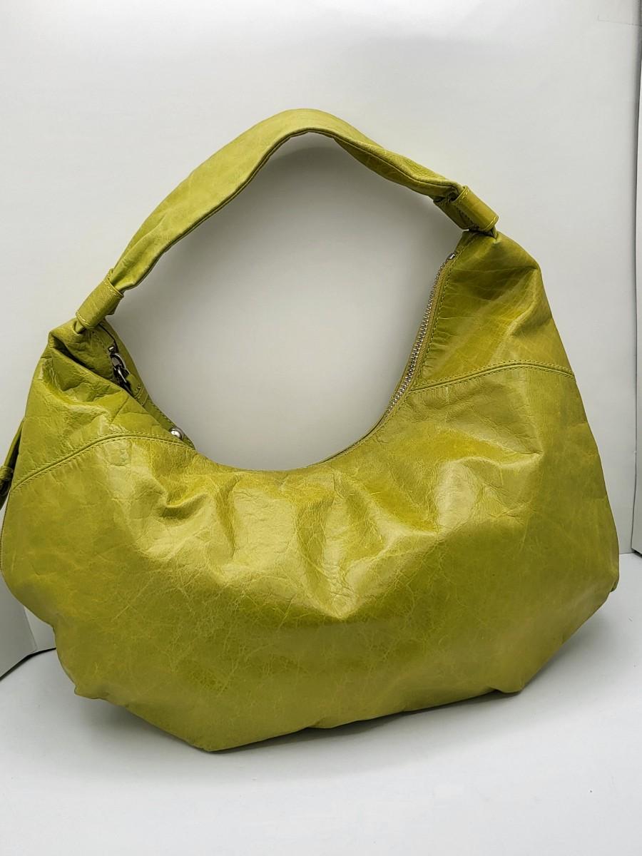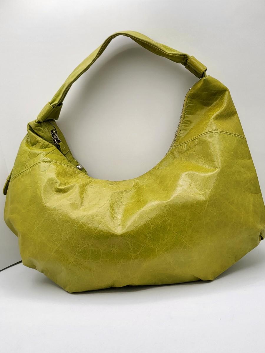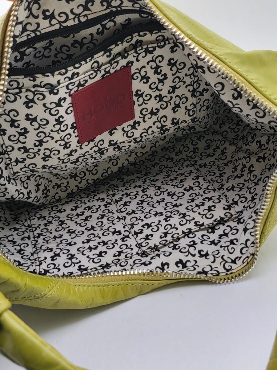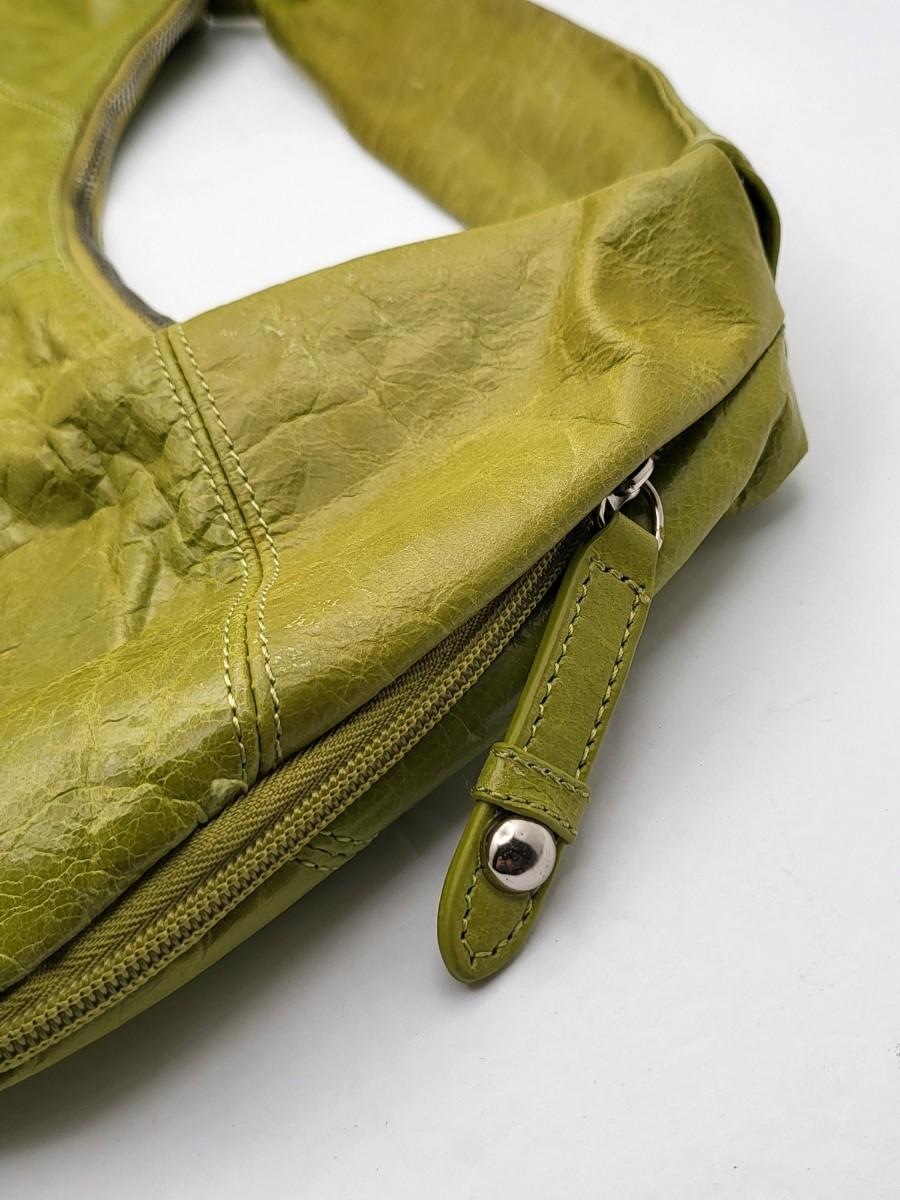 Distressed green leather Hobo International shoulder bag. Measures 17" x 8.5". Zipper top. Small side zipper pocket. Very clean interior. Wide shoulder strap.