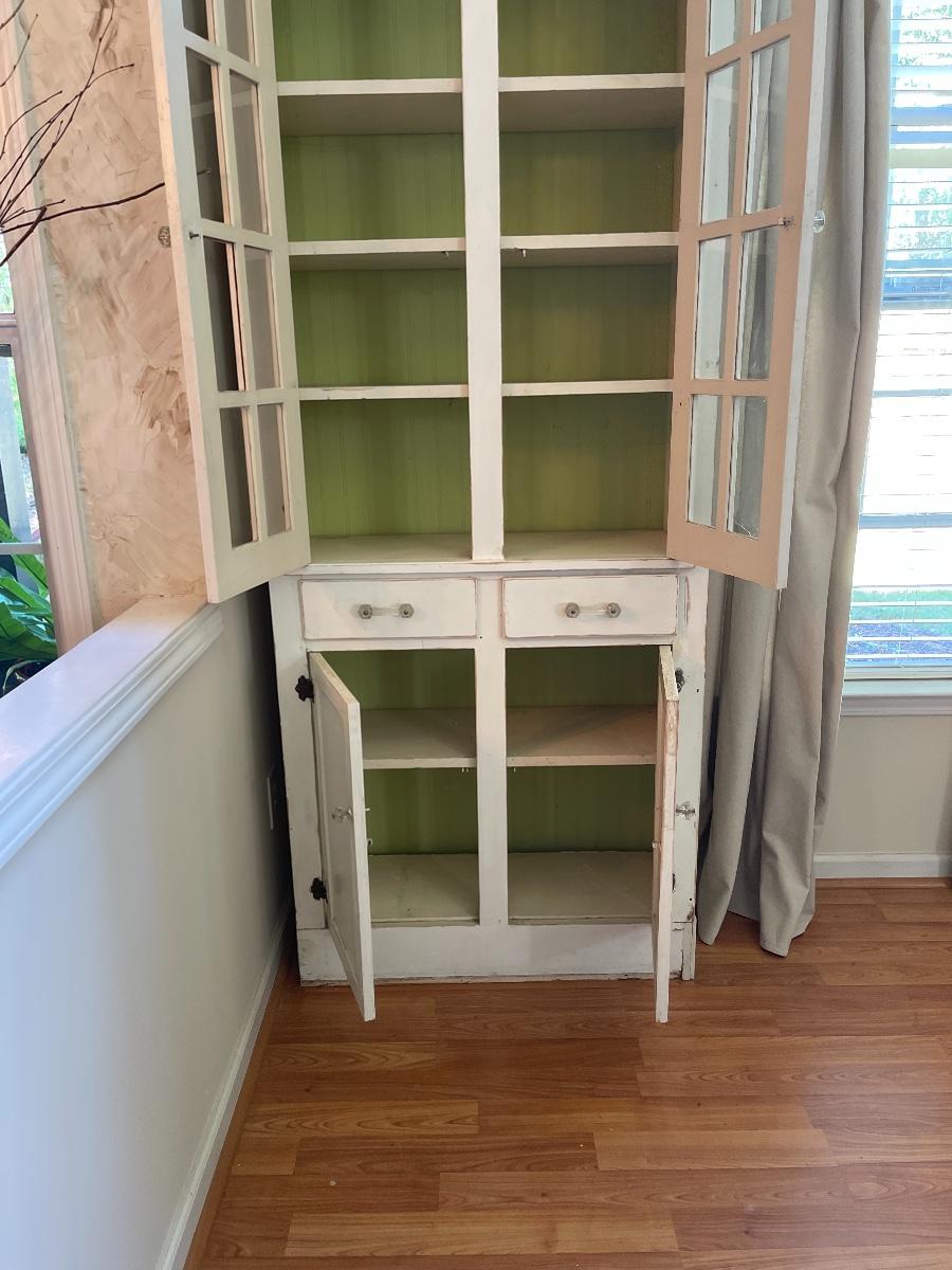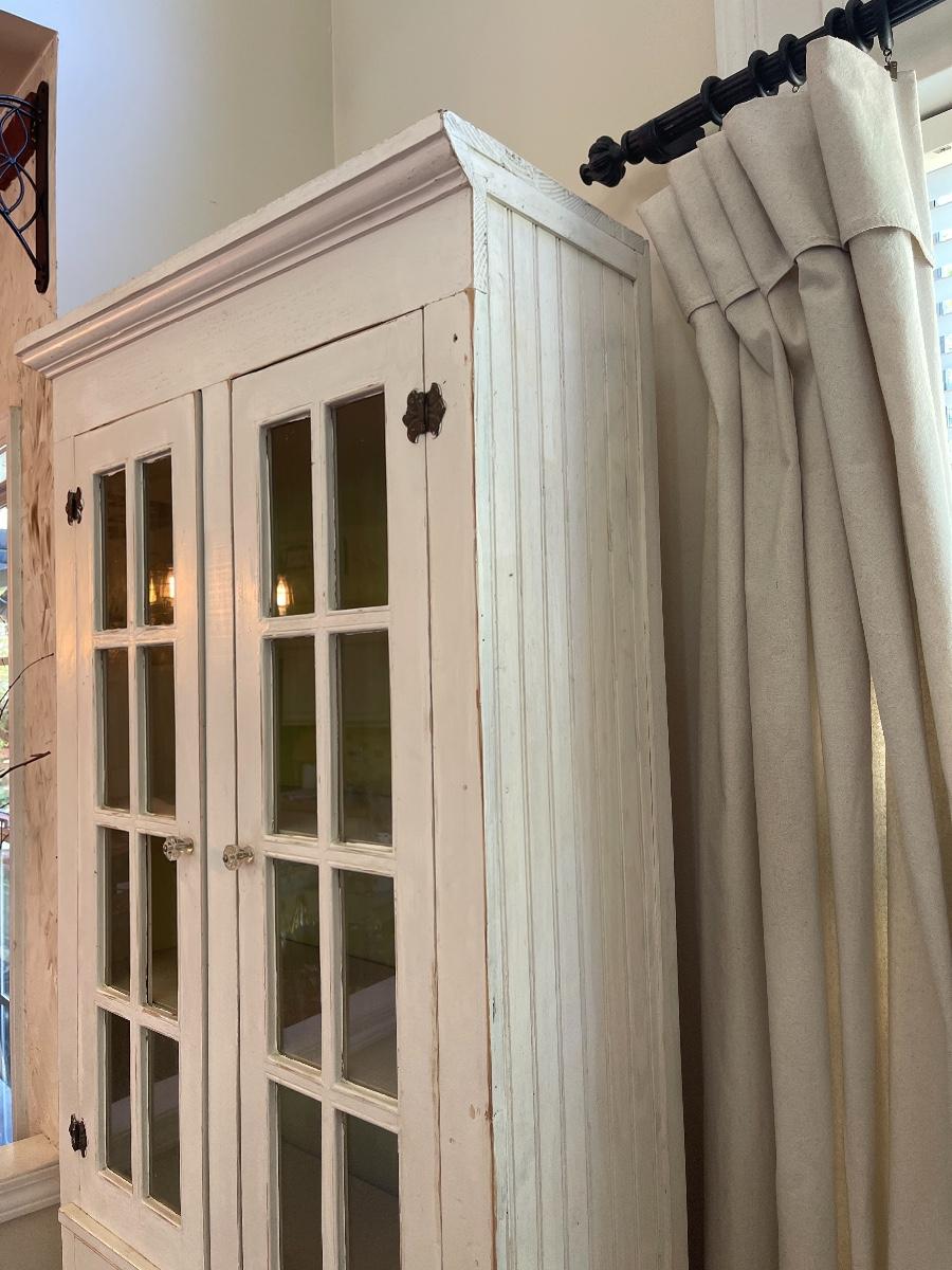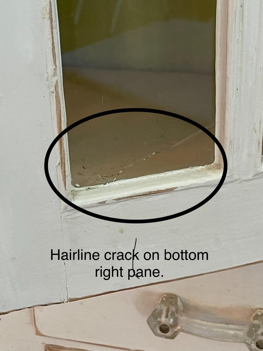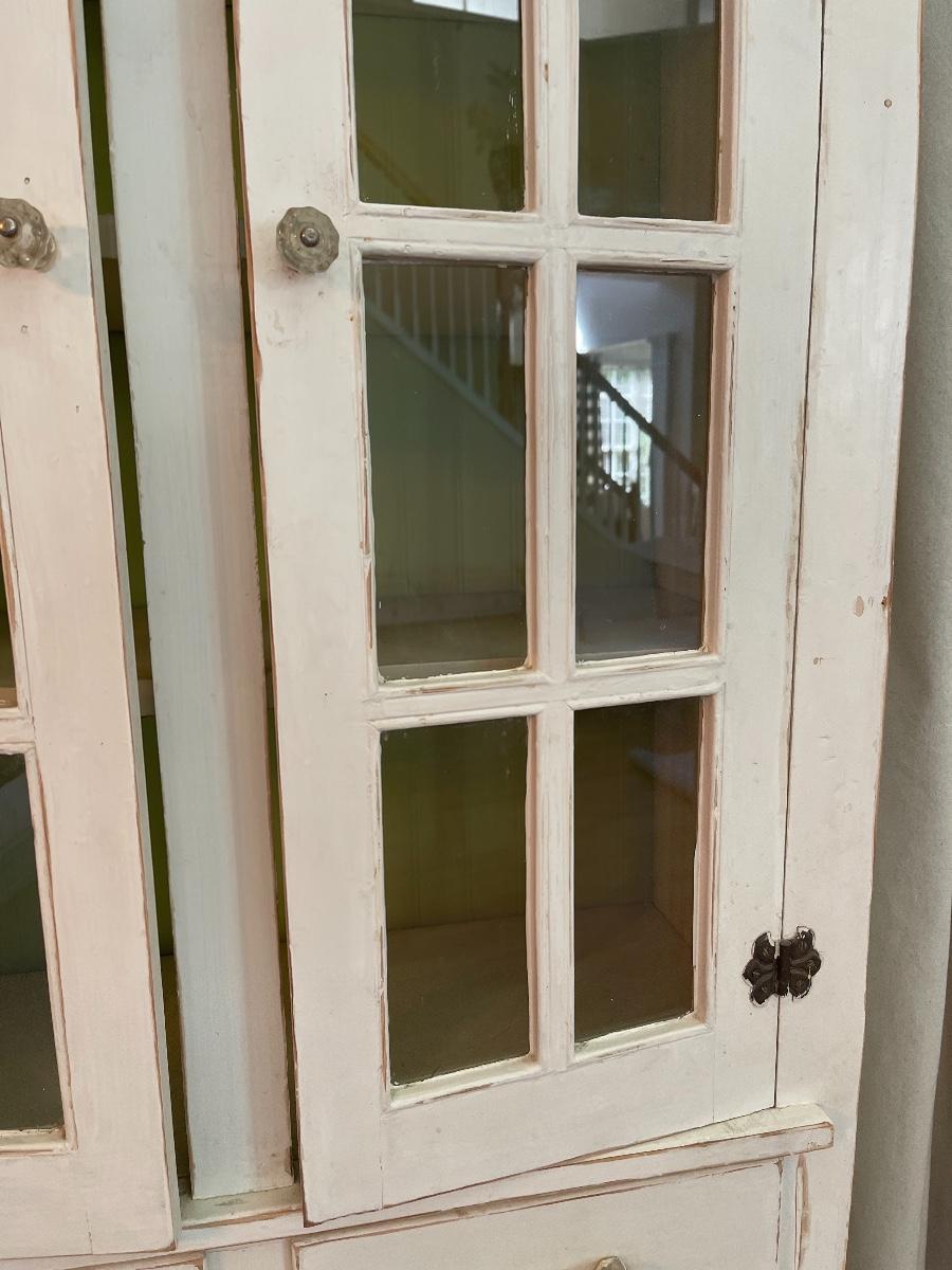 Great Condition with just a few minor repairs needed. Bead board interior. One of the glass panes on the bottom right has a hairline crack, please see photo. Note that the right side does not have a top molding and has a bead board side, as the other side has the top molding but not the bead board.