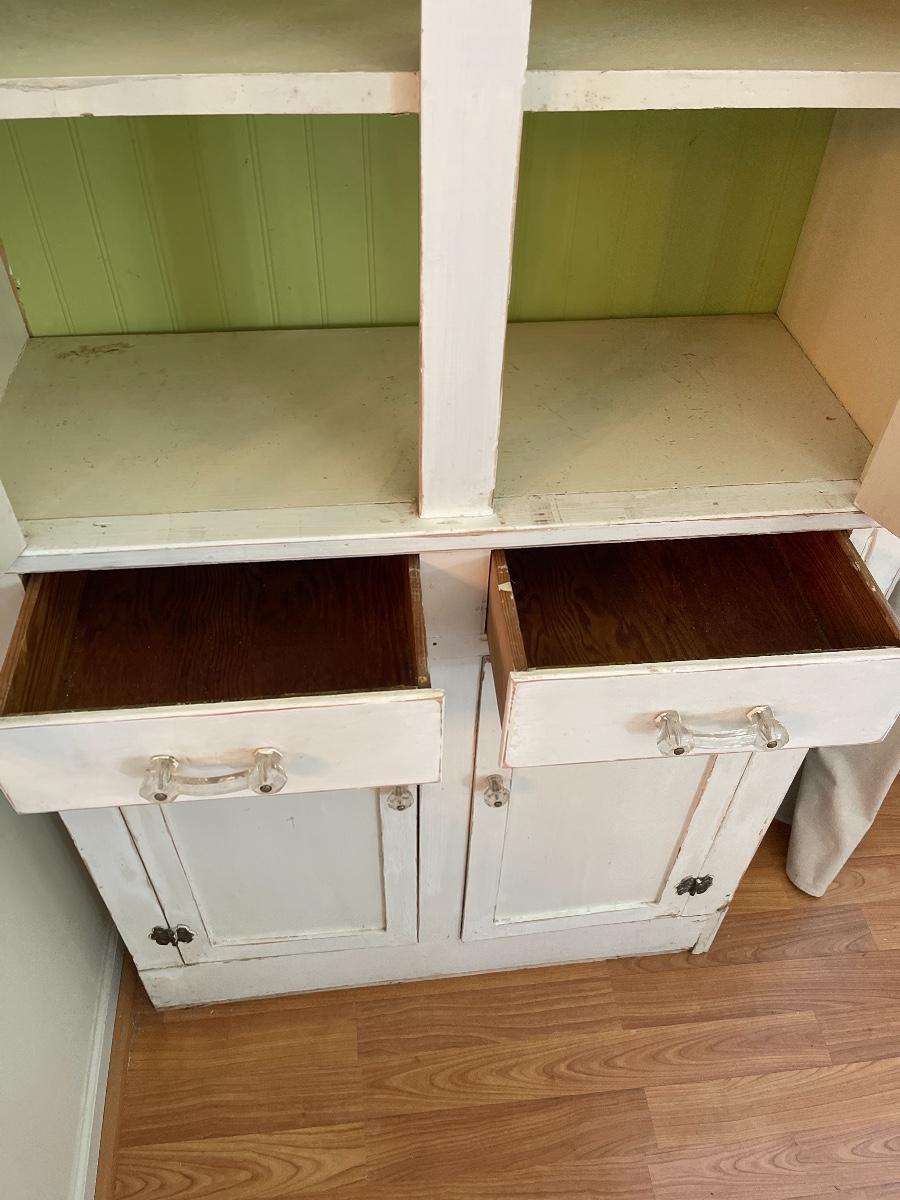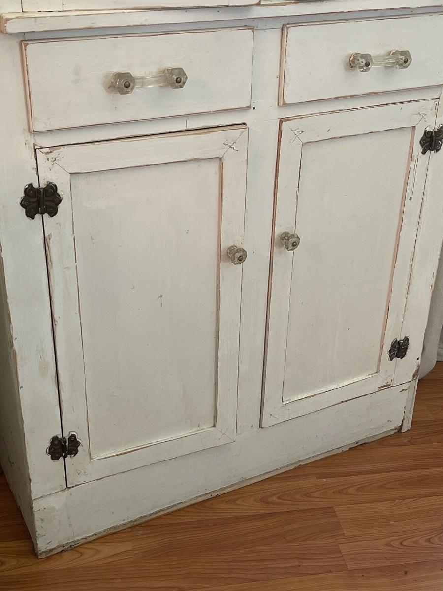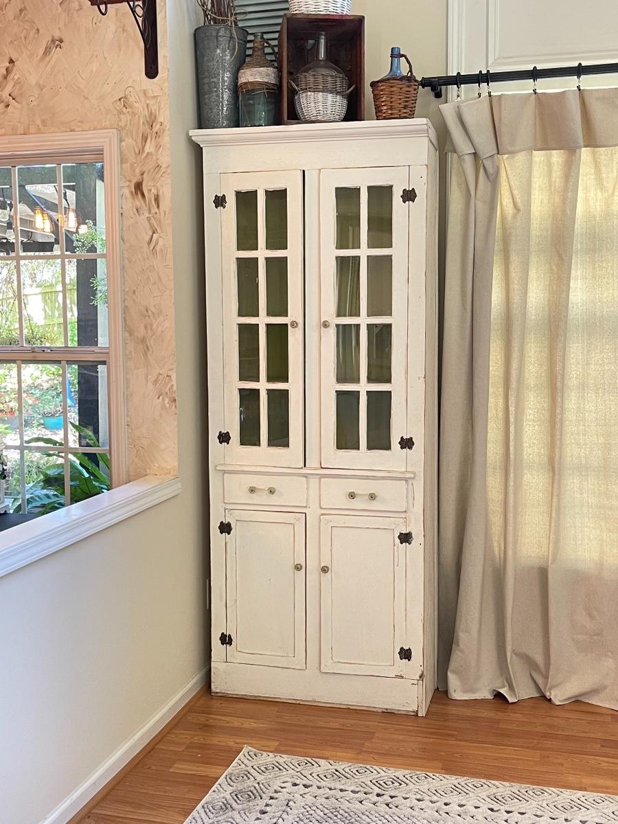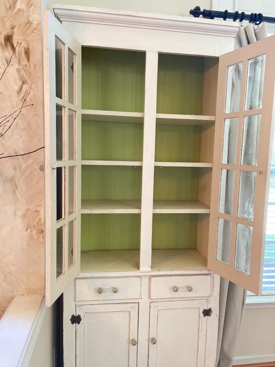 Great Condition with just a few minor repairs needed. Bead board interior. One of the glass panes on the bottom right has a hairline crack, please see photo. Note that the right side does not have a top molding and has a bead board side, as the other side has the top molding but not the bead board.