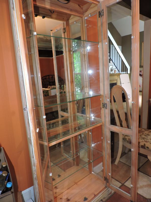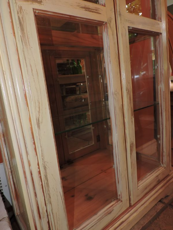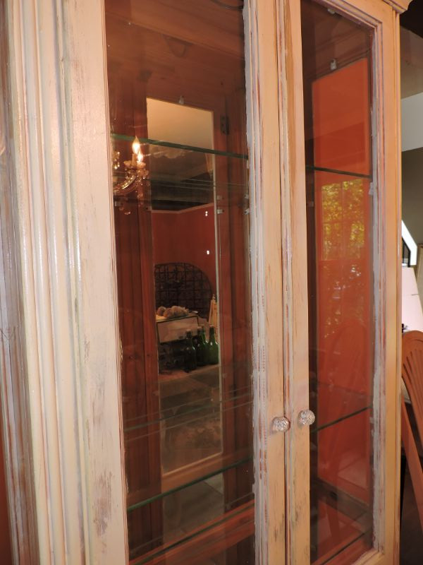 Distressed mirrored back curio cabinet with 4 shelves. Display your collections in a beautiful way! With three adjustable shelves and one stationary, you’ll be able to display all your treasures in here! 28”x76”x10”.