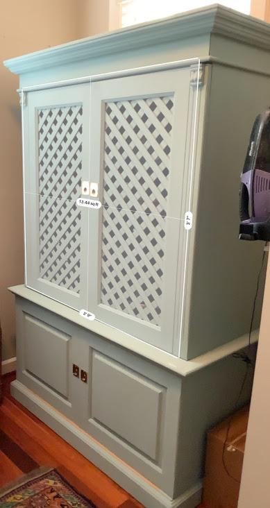 Distressed hand painted armoire with open lattice work details with excellent storage capacity. Perfect for kitchen, bedroom, TV armoire.