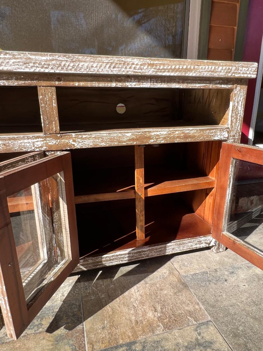 This console has been outside under porch. No brand name found. 32.5” H x 59.5 L x 18.5” D.