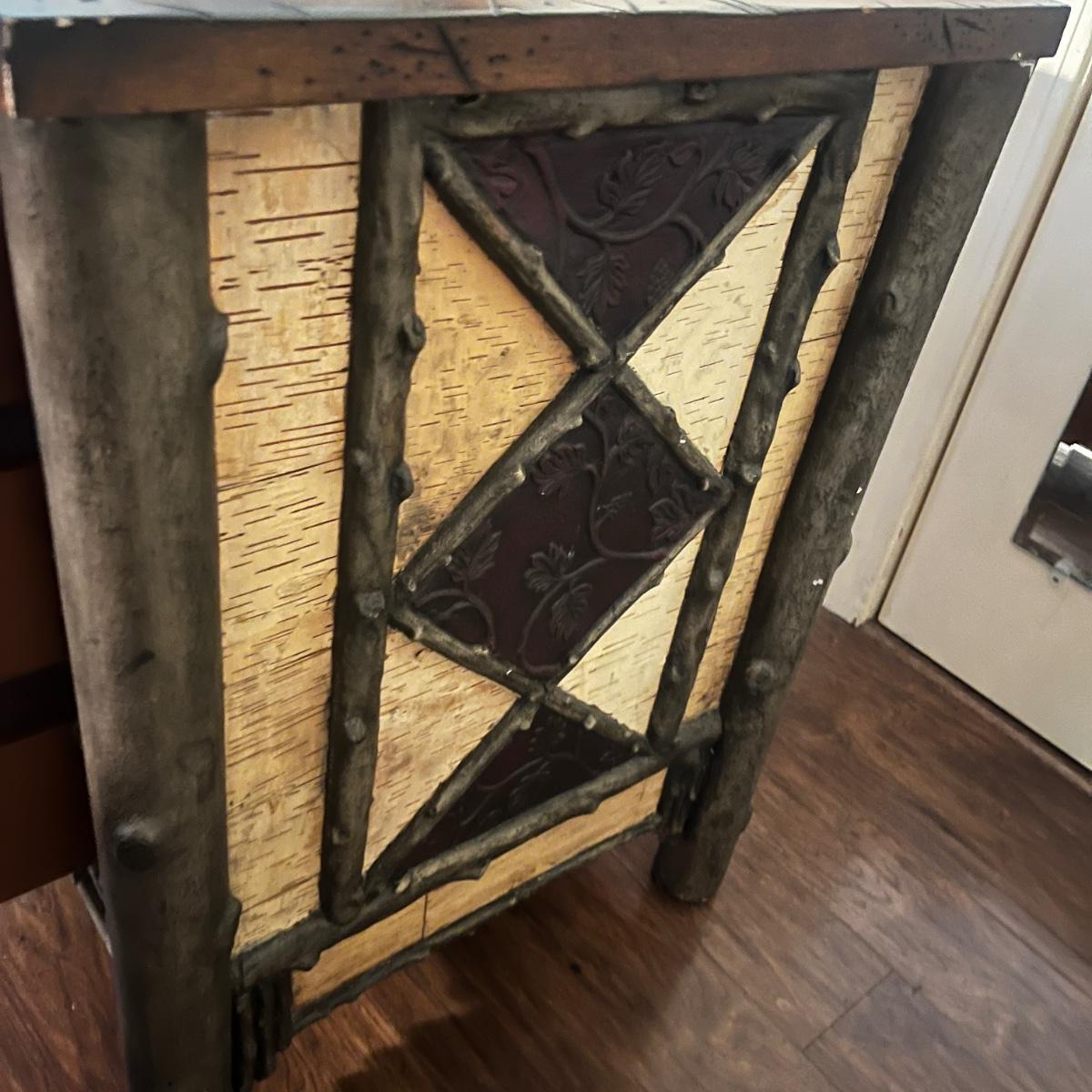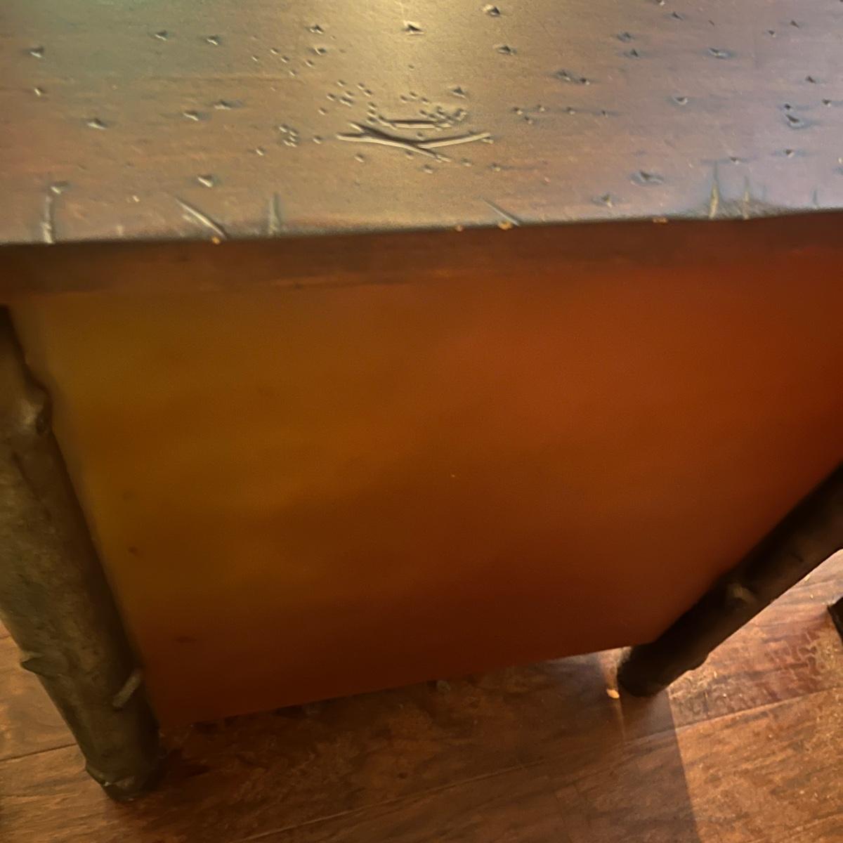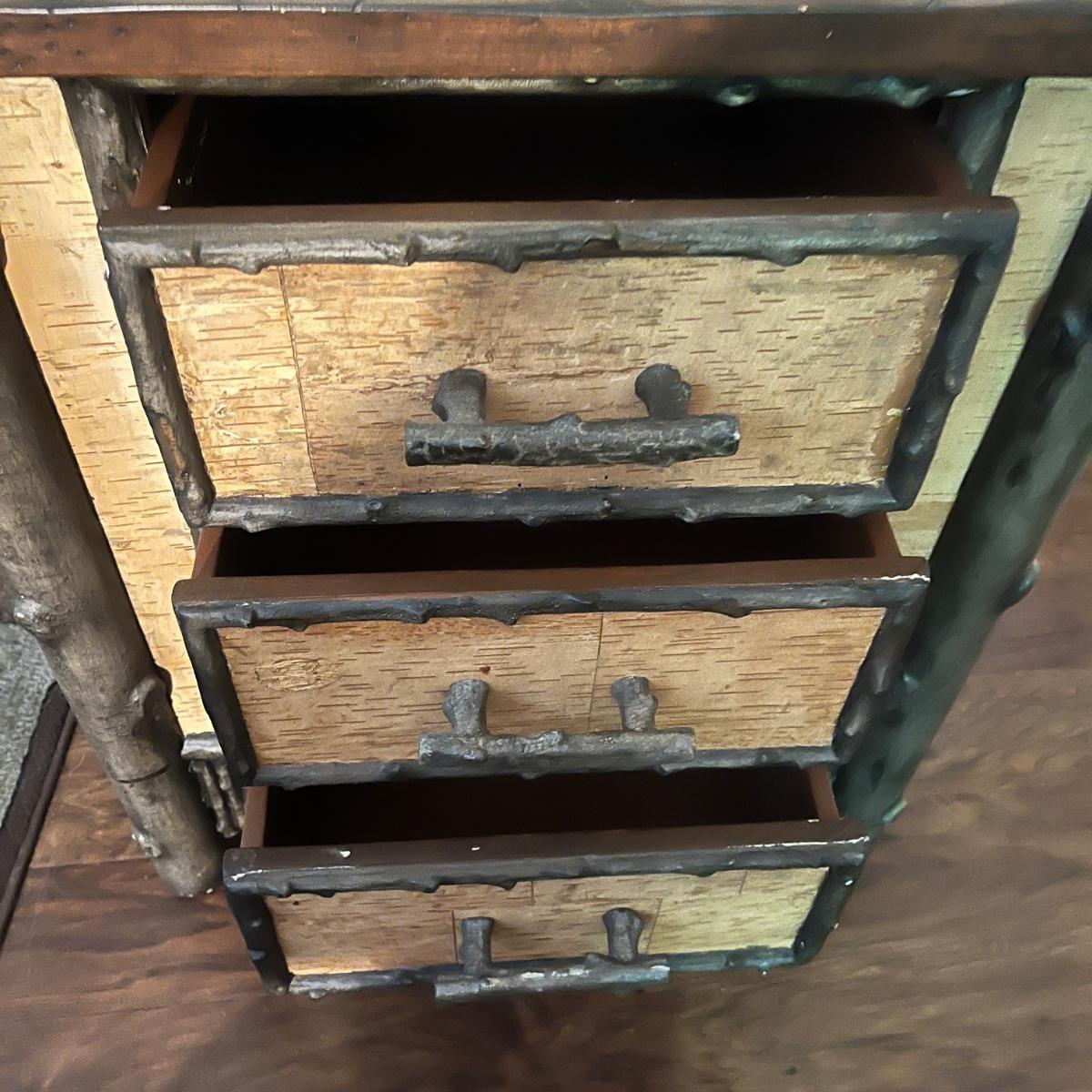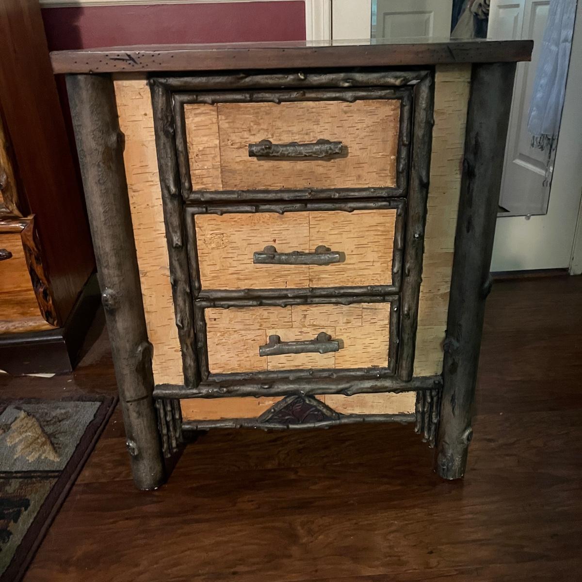 This end table has a distressed wood top with three drawers with what appears to be bark and faux wood front and sides. Piece measures 24” x 20” x 28”H. There is a chip on one drawer, see pictures.