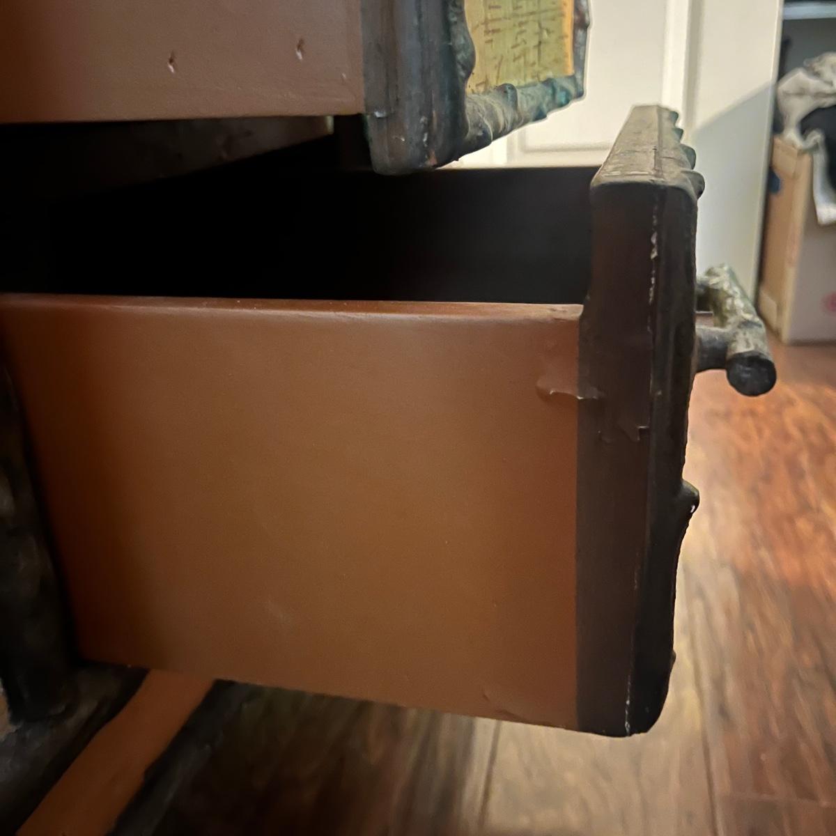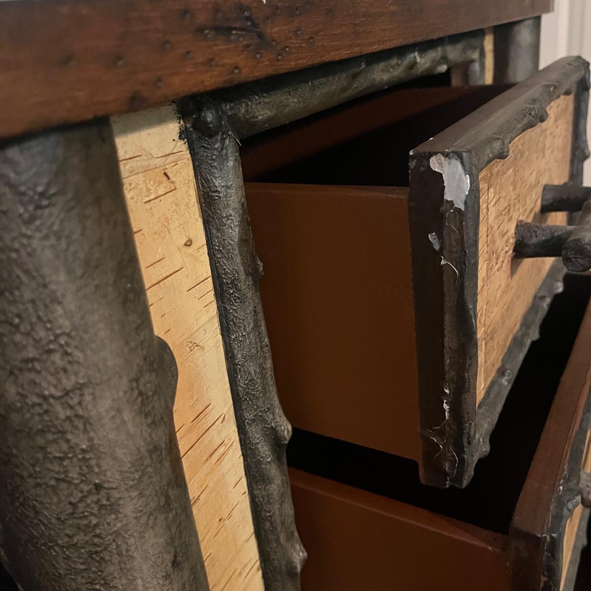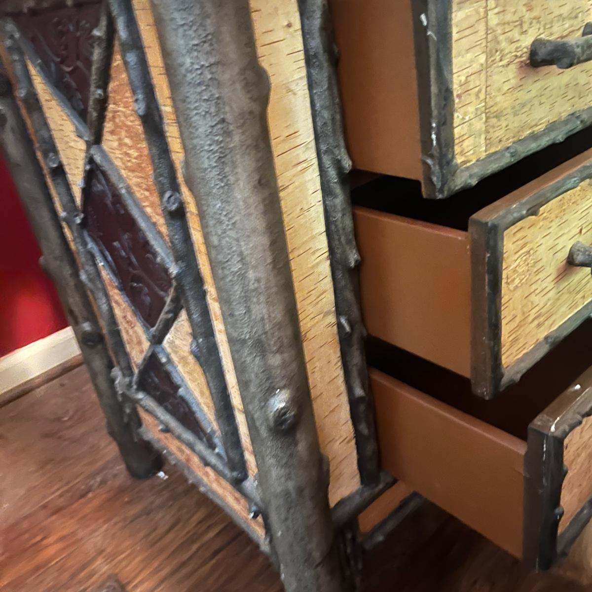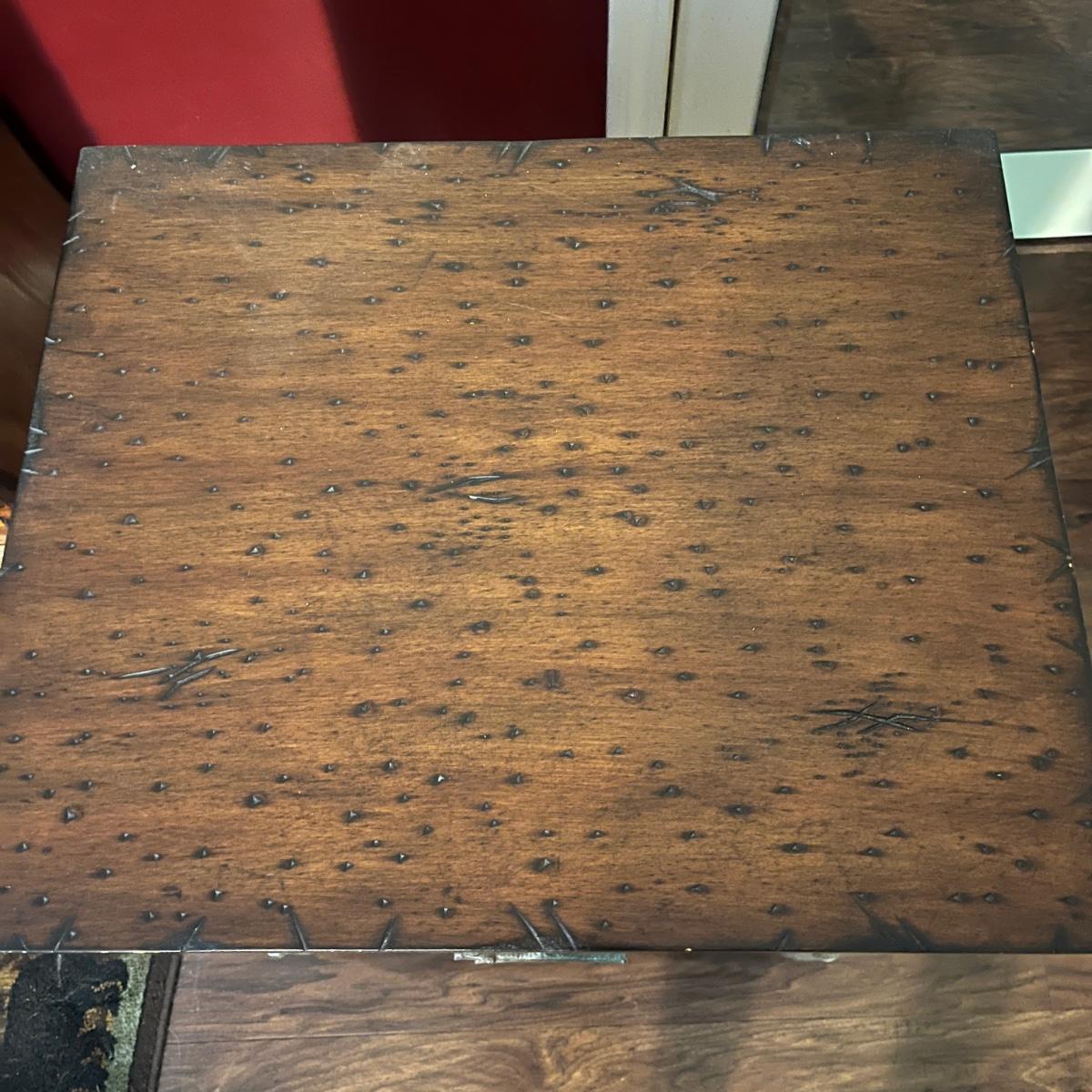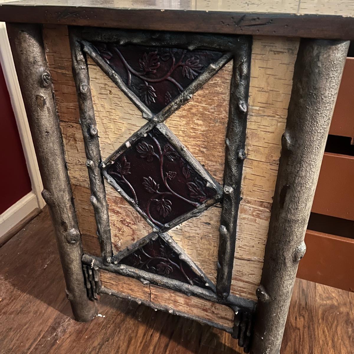 This end table has a distressed wood top with three drawers with what appears to be bark and faux wood front and sides. Piece measures 24” x 20” x 28”H. There is a chip on one drawer, see pictures.