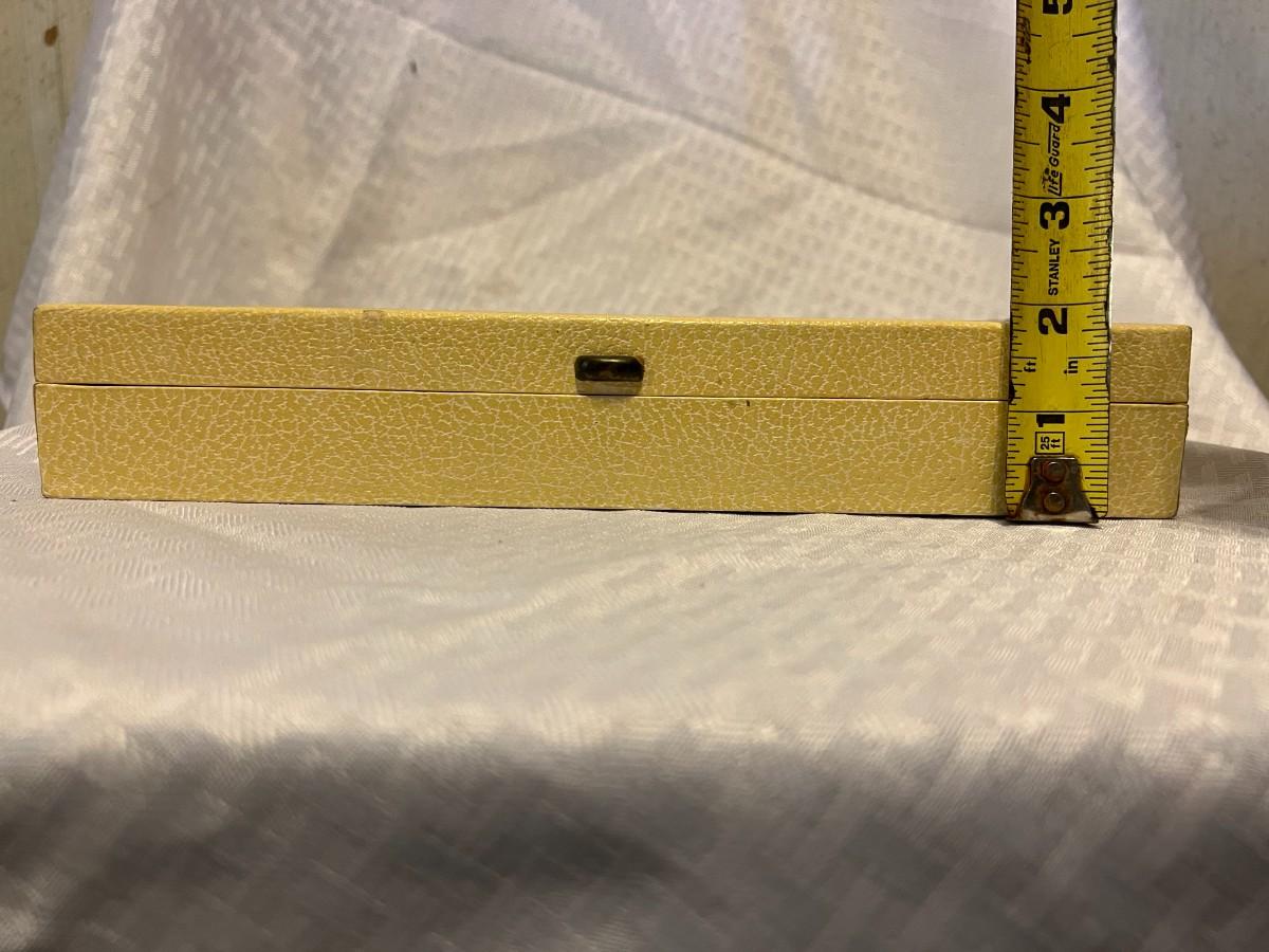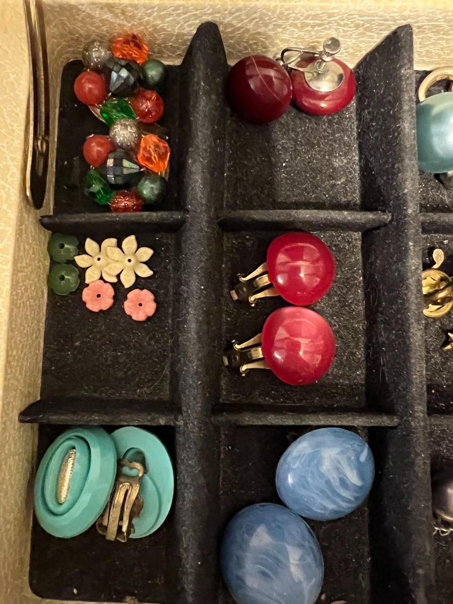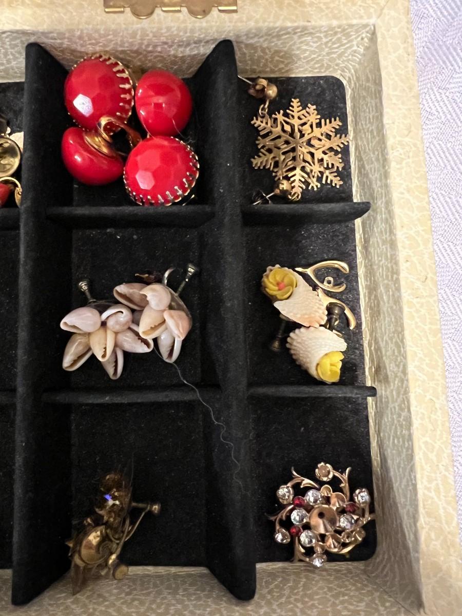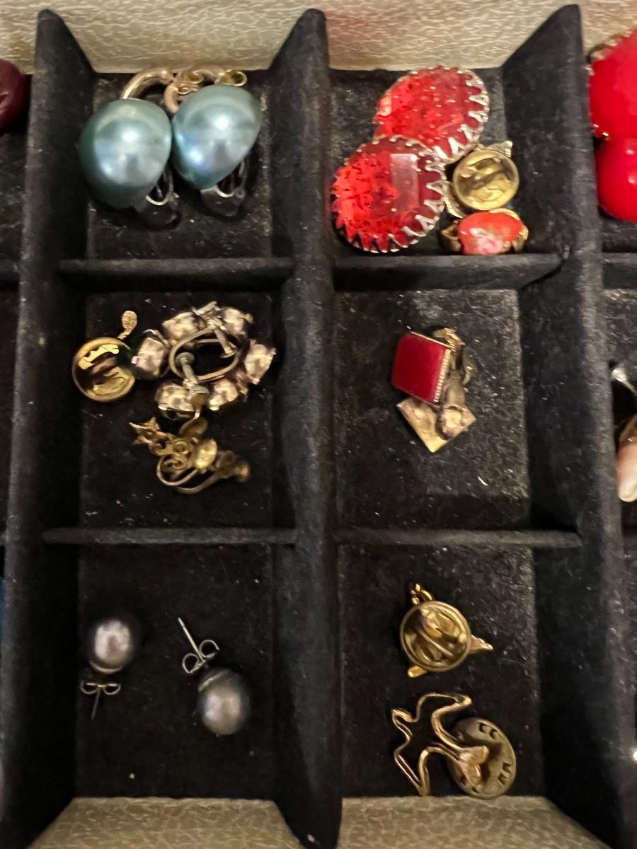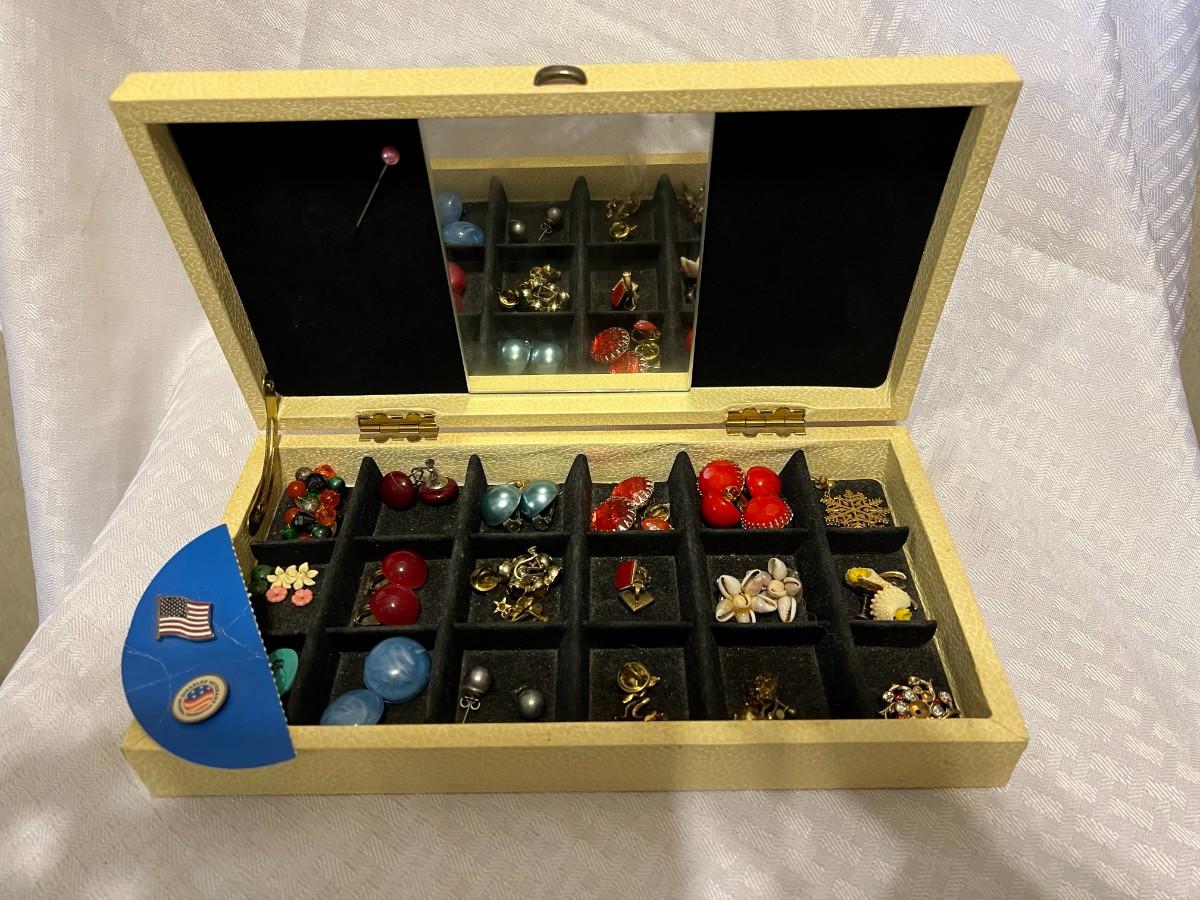 DIVIDED JEWELRY BOX WITH EARRINGS, POST AND CLIP ONS.
