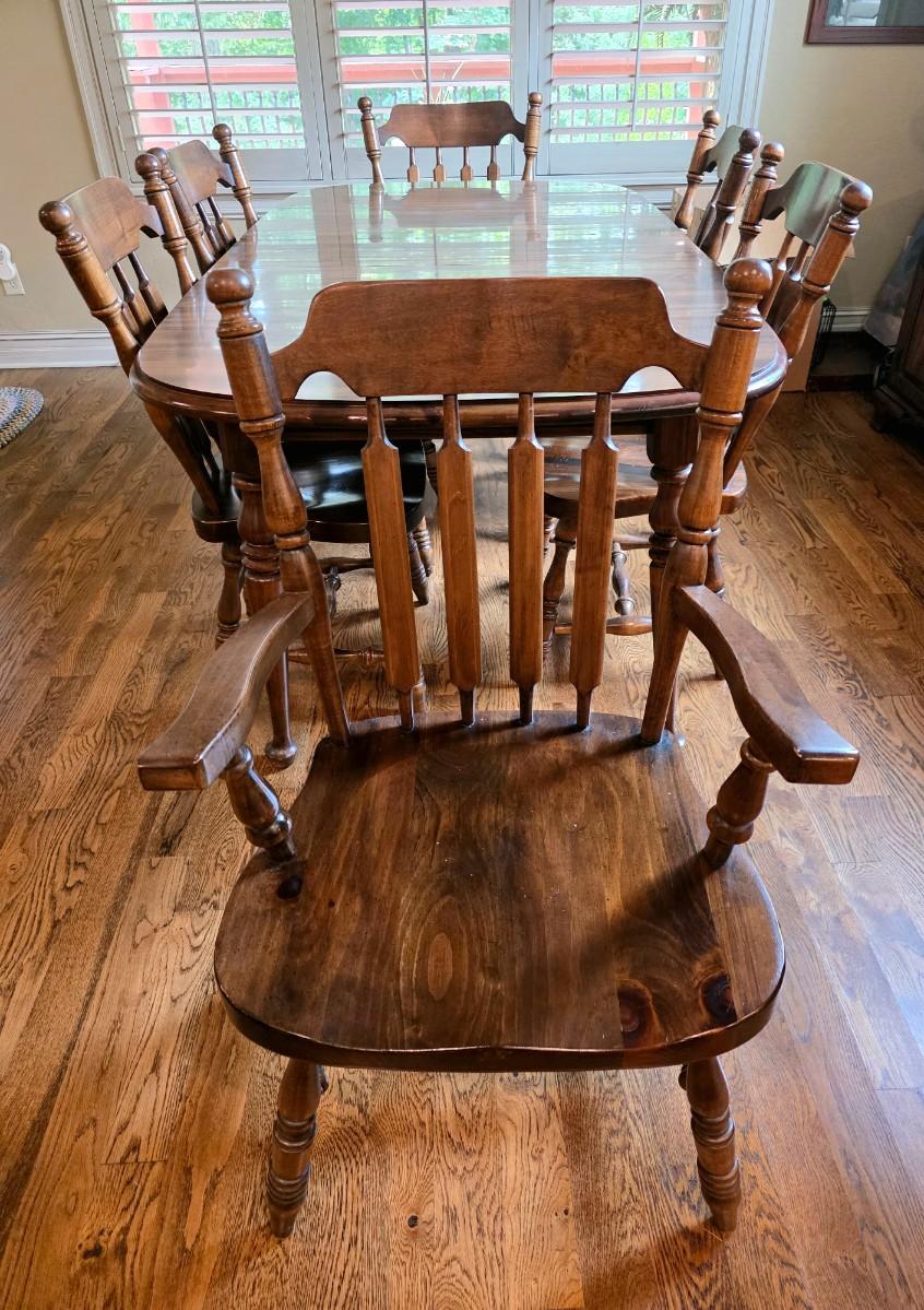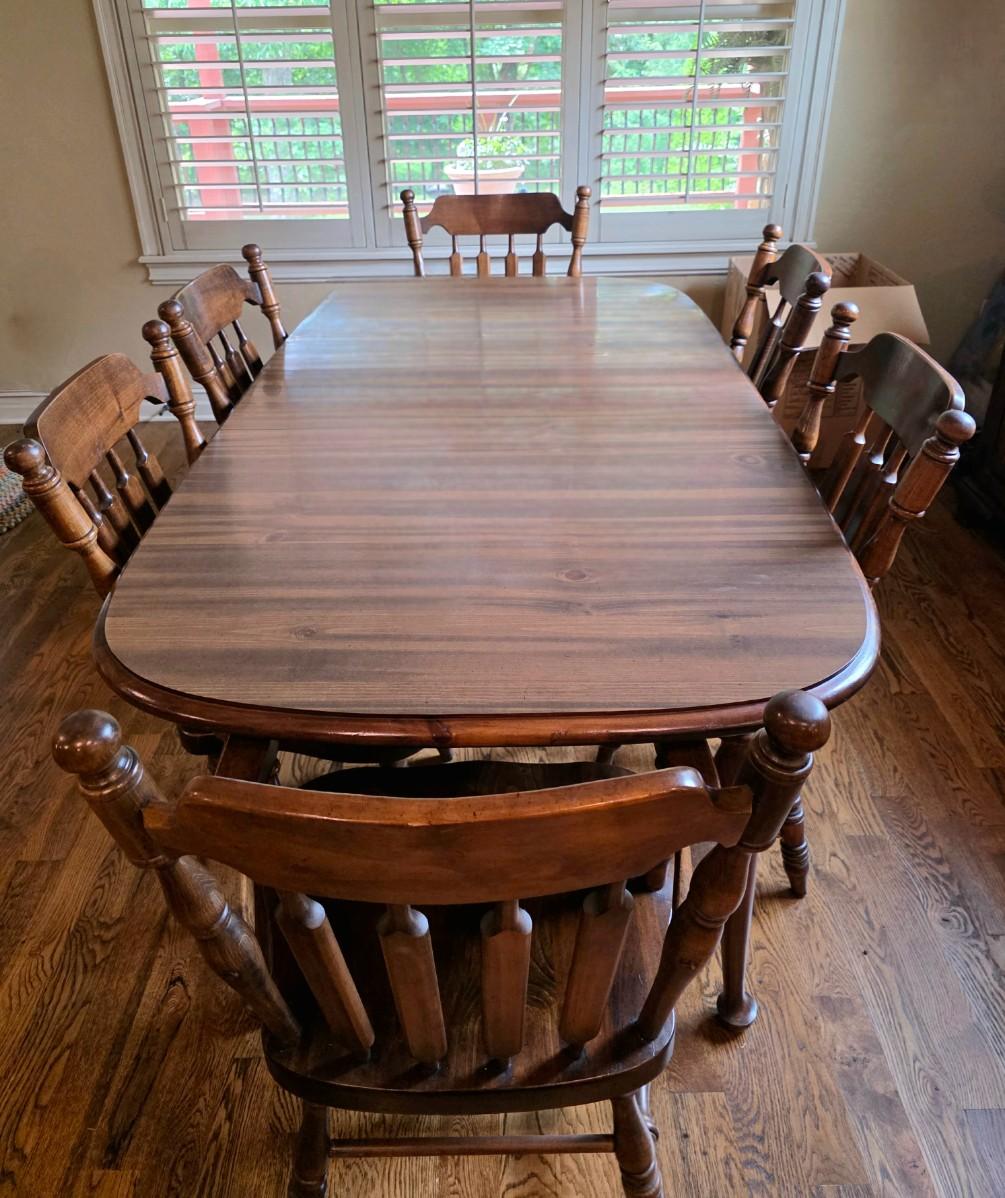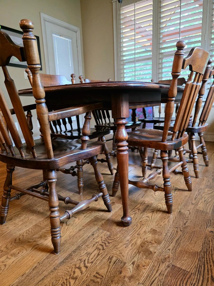 Vintage Dining table set with 6 chairs, 2 are Captain chairs with arms, and 1 leaf by Dixie.