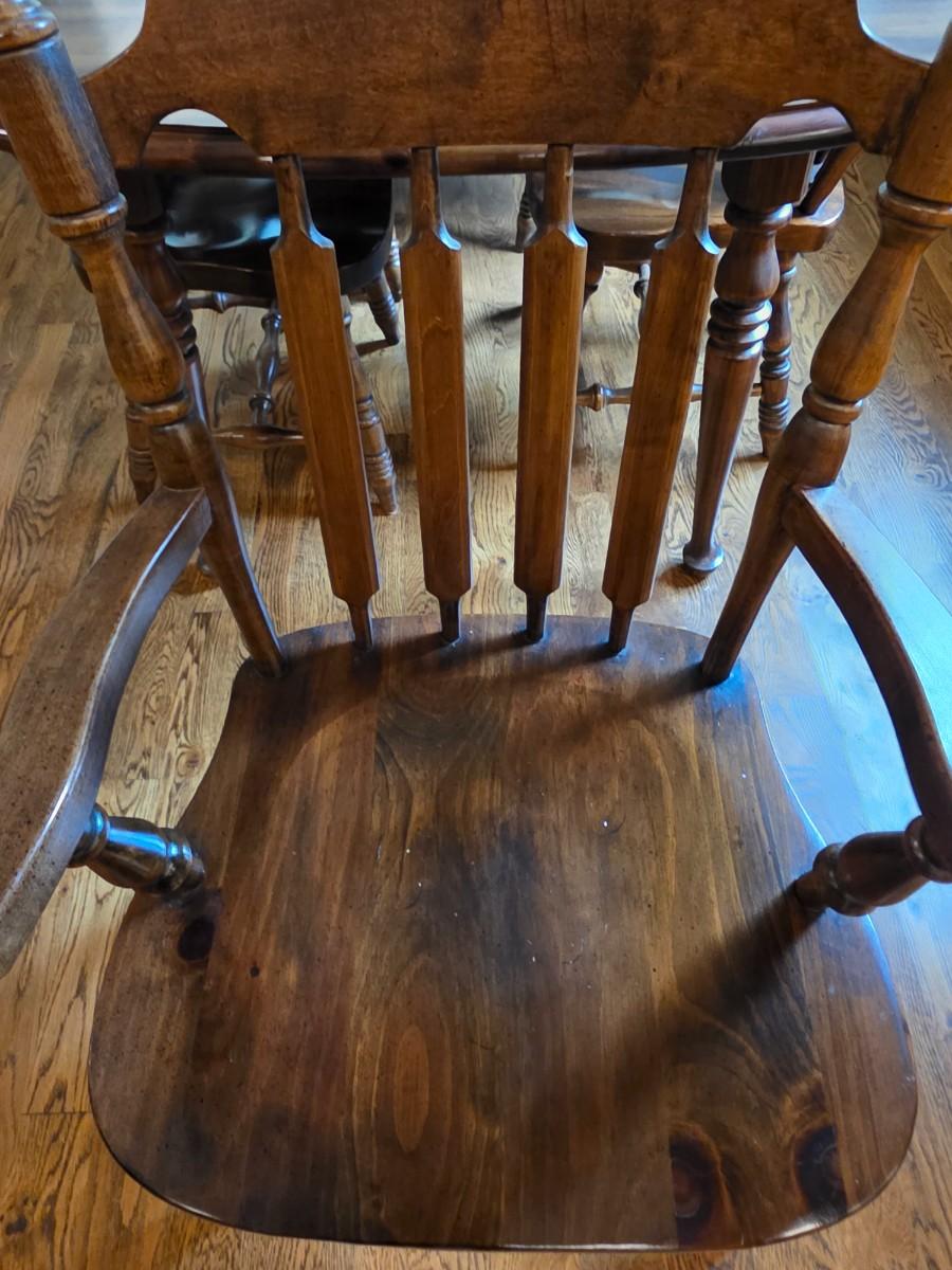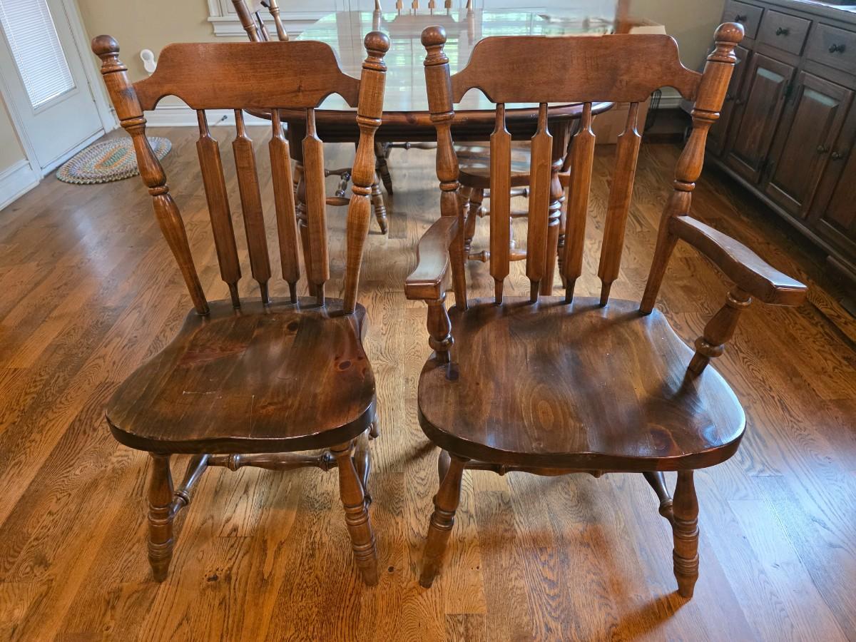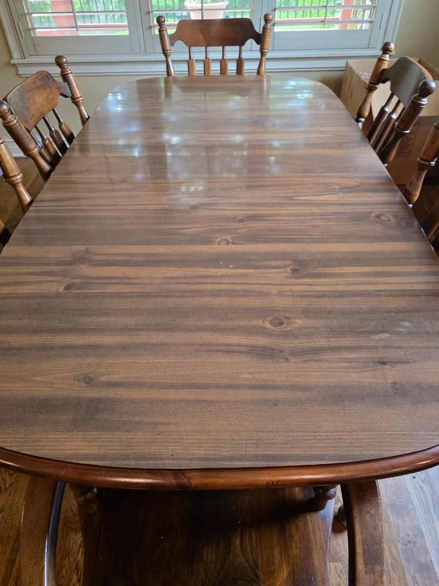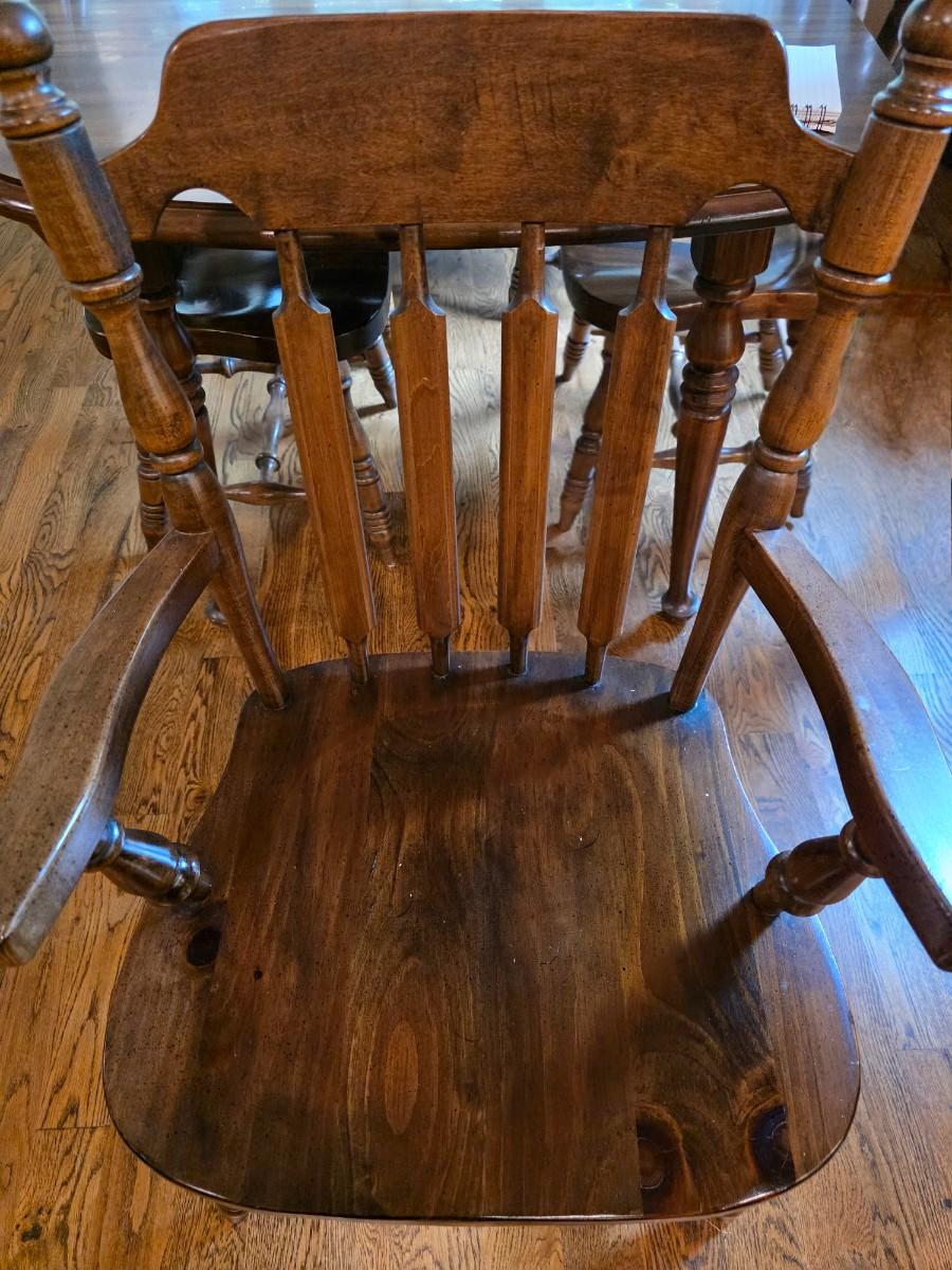 Vintage Dining table set with 6 chairs, 2 are Captain chairs with arms, and 1 leaf by Dixie.