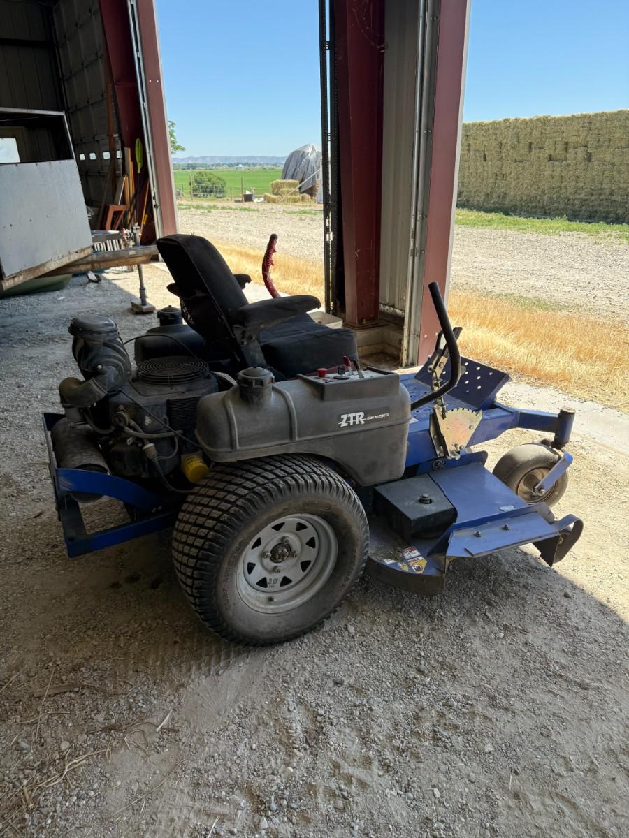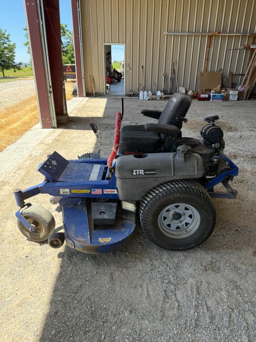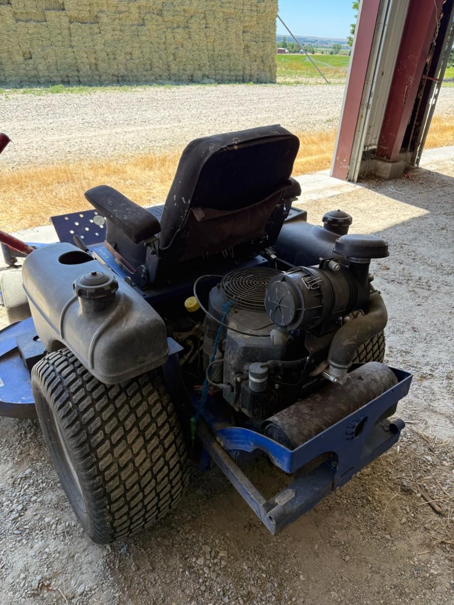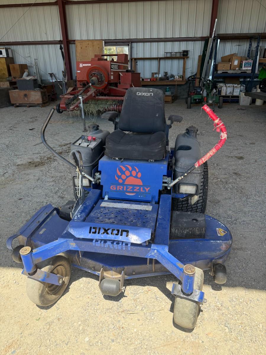 This heavy-duty Dixon Grizzly mower features a commercial-grade zero-turn radius design, making it ideal for large property maintenance or landscaping use. It has dual lever steering, a wide cutting deck, and a comfortable padded seat. The controls are easy to use and designed for efficiency. Some signs of wear from regular use, including cosmetic scuffing and tape on the right handlebar, but functions as intended.