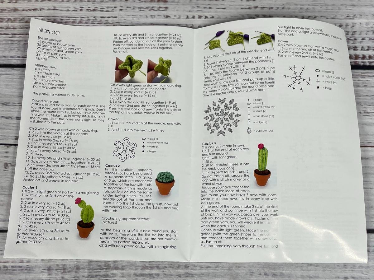 Kit contains: instructions, 4 different colored yarn, stuffing material, and 3 flower pots. Crochet hook is not included. Items are in perfect condition and come in it’s original package.