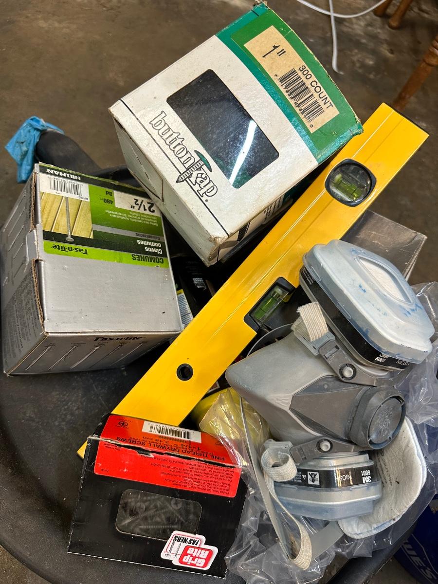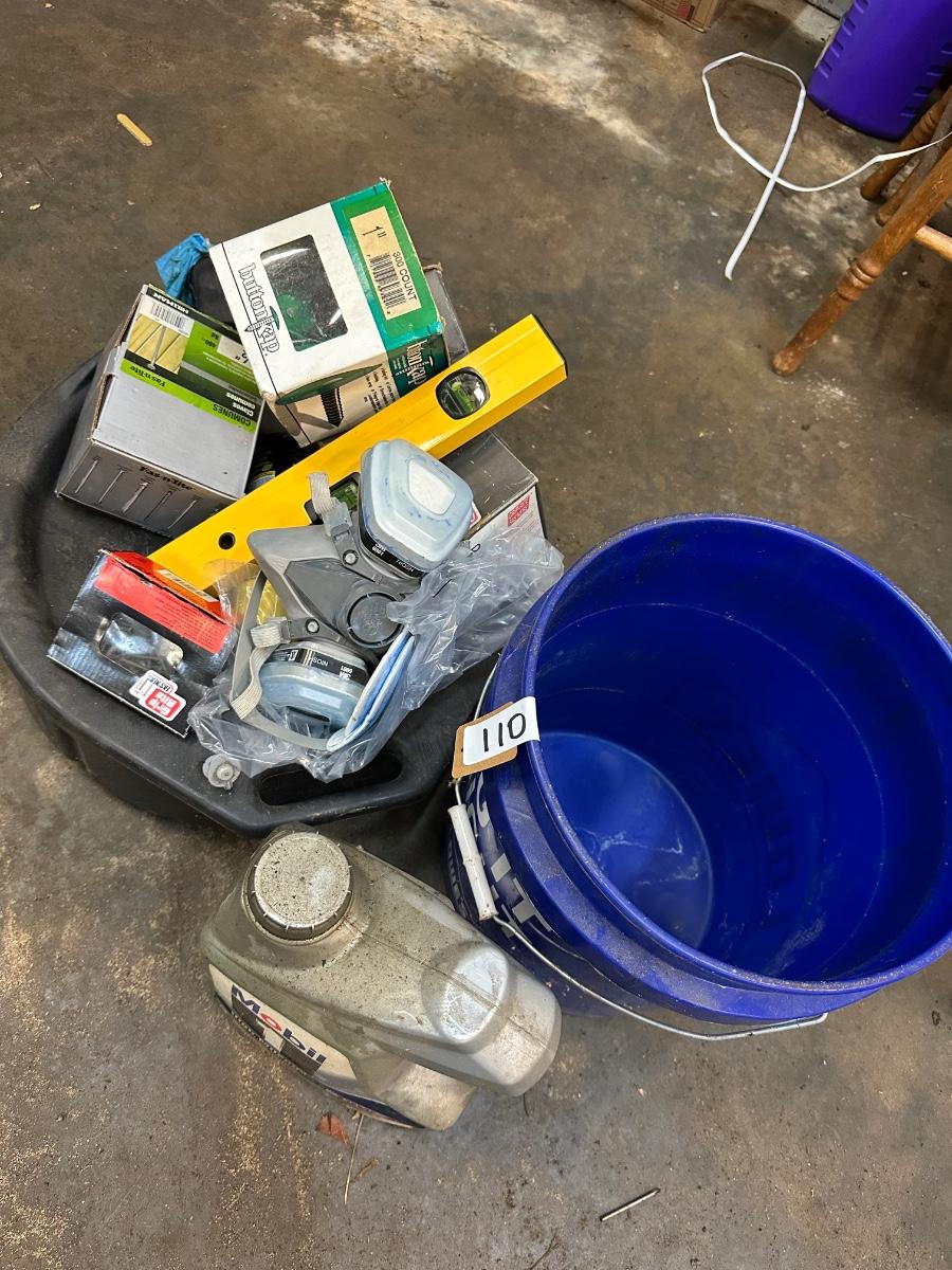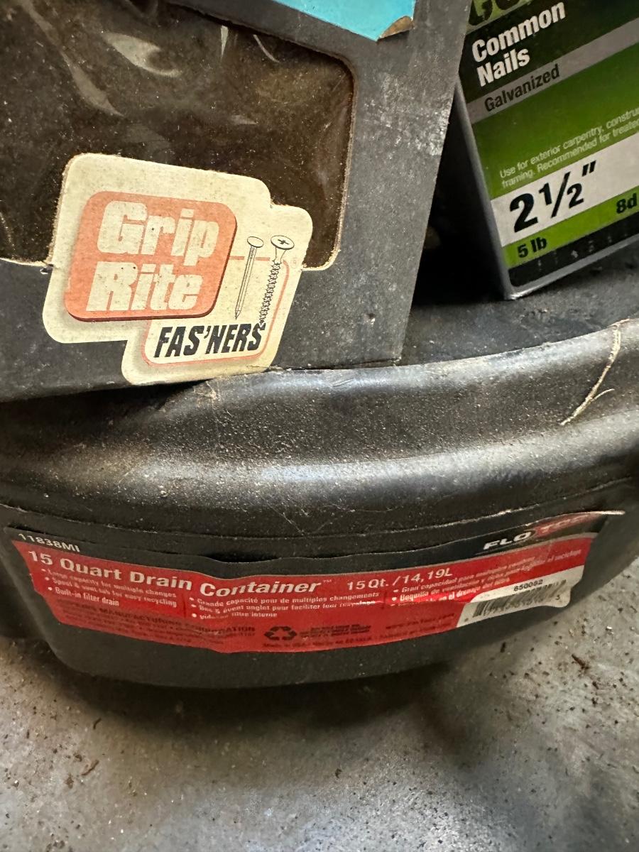 DIY OIL CHANGE LOT INCLUDES DRAIN CONTAINER, 10W40 OIL, RESPIRATOR MASK, LEVEL, MISC FASTENERS