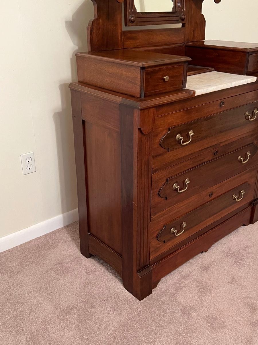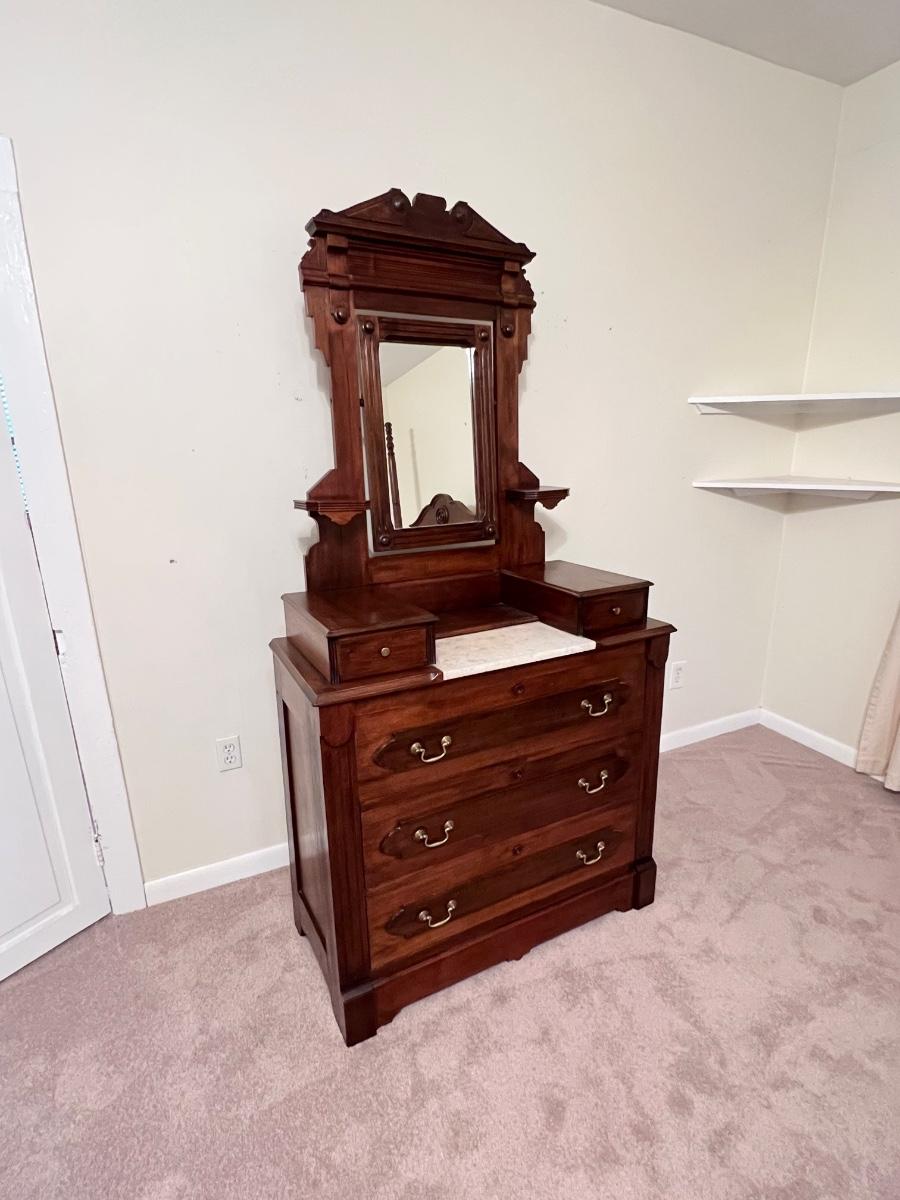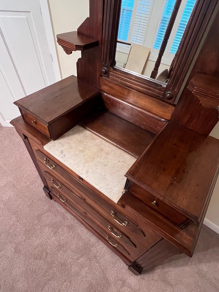 Drawers slide in & out easily ~ 2 pieces ~ Has a marble piece on top ~ No brand name found ~ Bottom piece = 39.5” H x 40” W x 18” D ~ Top piece with swivel mirror = 39” H