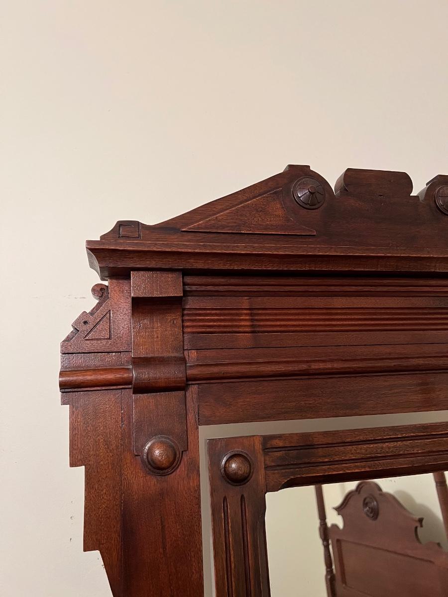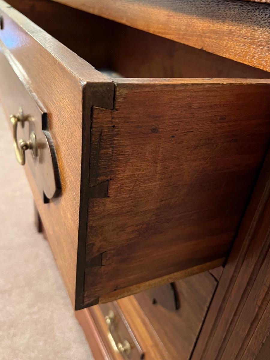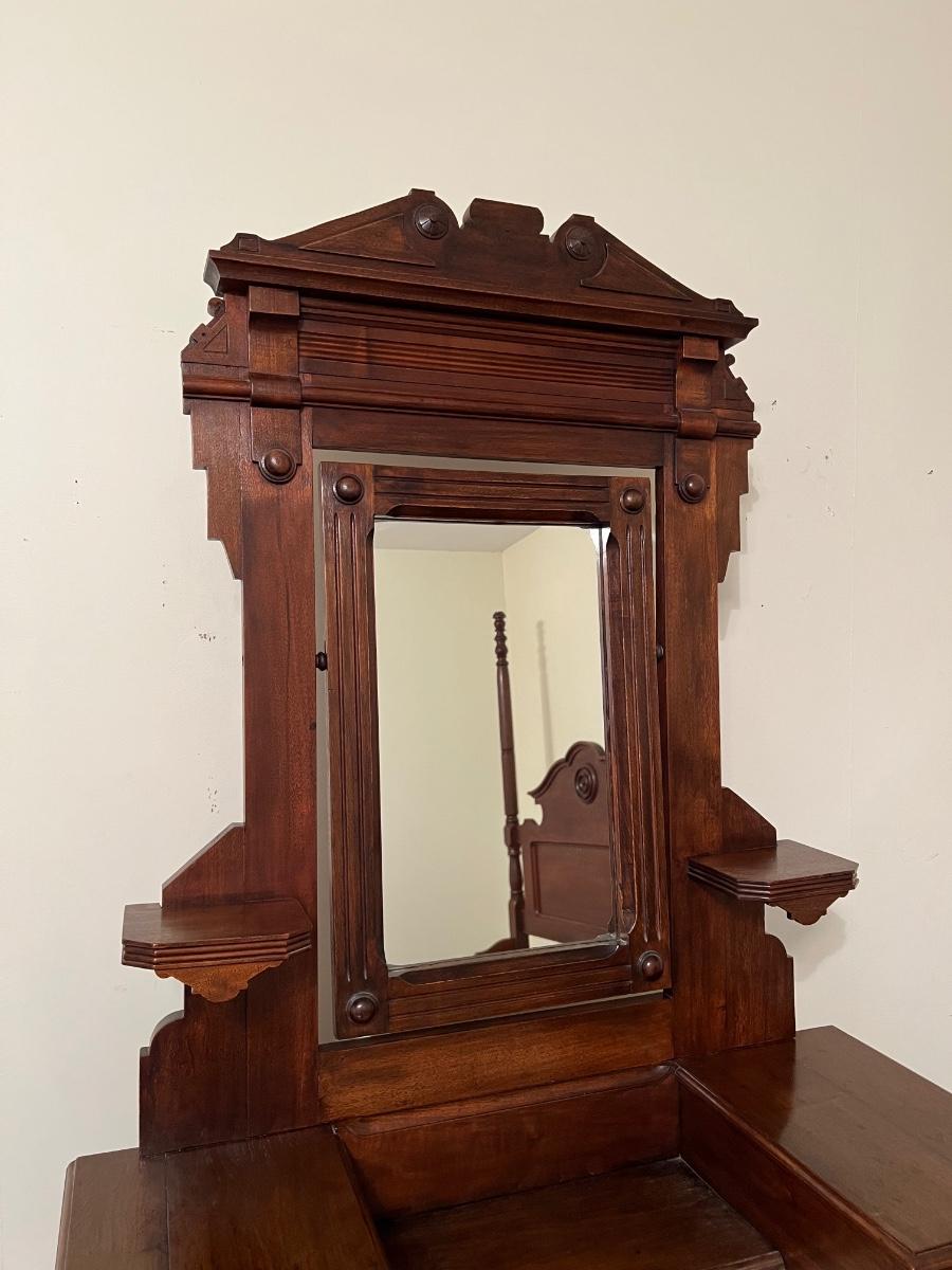 Drawers slide in & out easily ~ 2 pieces ~ Has a marble piece on top ~ No brand name found ~ Bottom piece = 39.5” H x 40” W x 18” D ~ Top piece with swivel mirror = 39” H