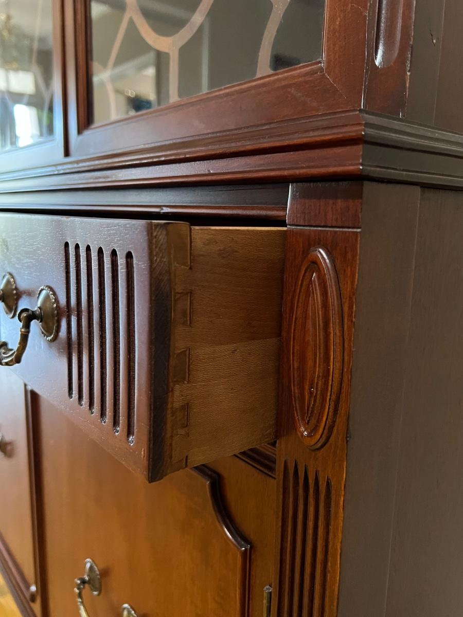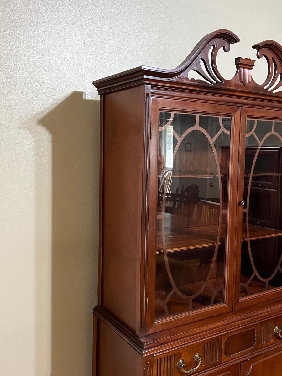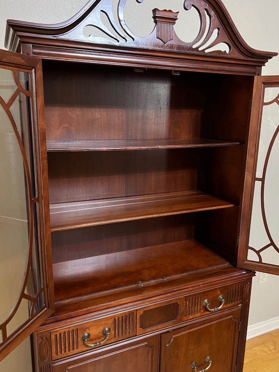 Drawer slides easily ~ It is in excellent condition with one minor repair that was made at the top, see photos ~ It does match the sideboard/ buffet table that is being sold separately ~ Entire unit = 75” H x 37” W x 16” D ~ Shelves are 33” W x 11” D ~ Shelving is not adjustable ~ Shelves are approximately 10” - 11” apart