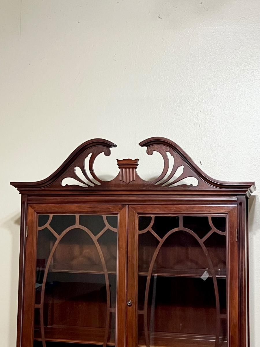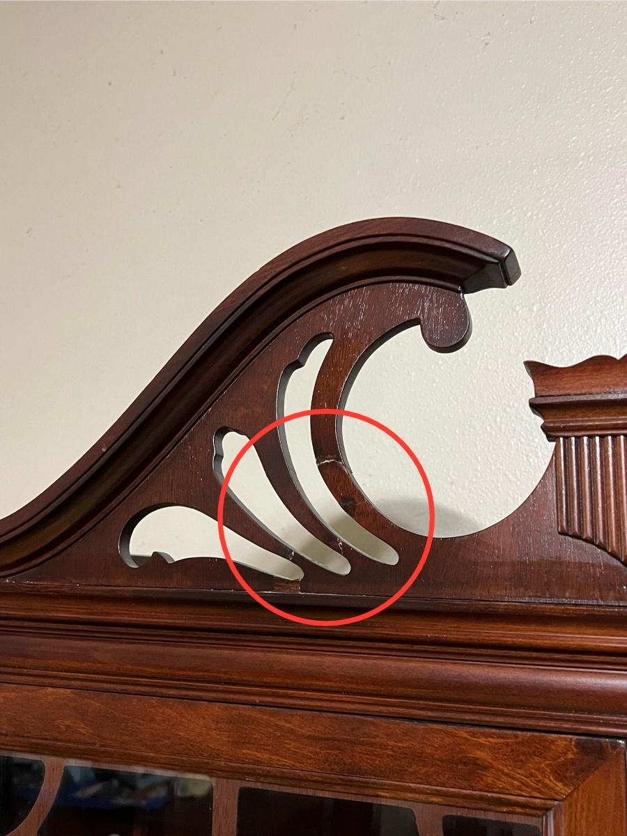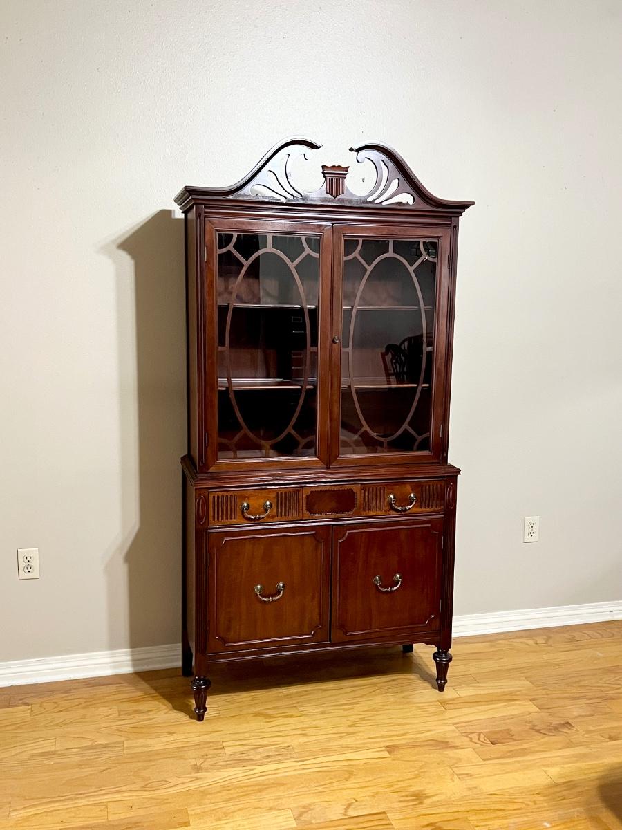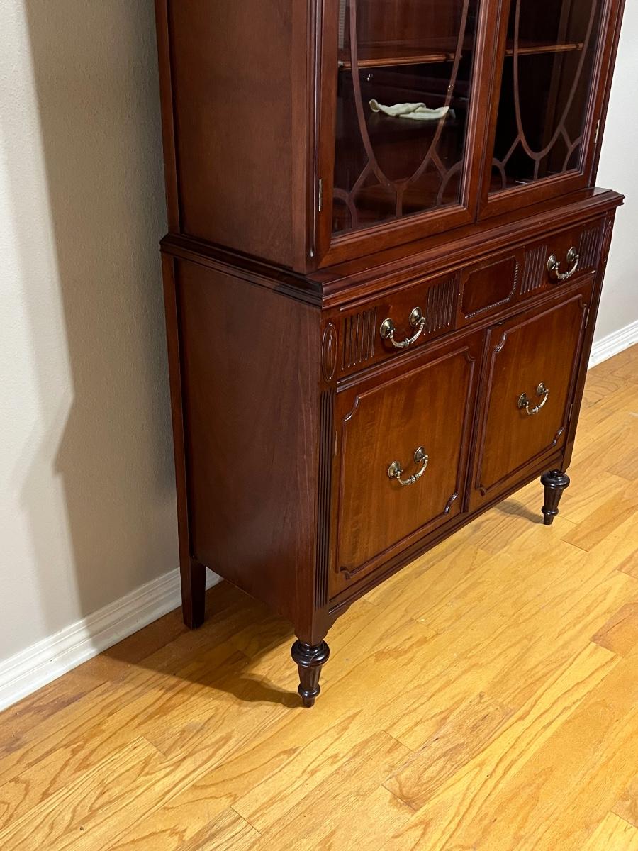 Drawer slides easily ~ It is in excellent condition with one minor repair that was made at the top, see photos ~ It does match the sideboard/ buffet table that is being sold separately ~ Entire unit = 75” H x 37” W x 16” D ~ Shelves are 33” W x 11” D ~ Shelving is not adjustable ~ Shelves are approximately 10” - 11” apart