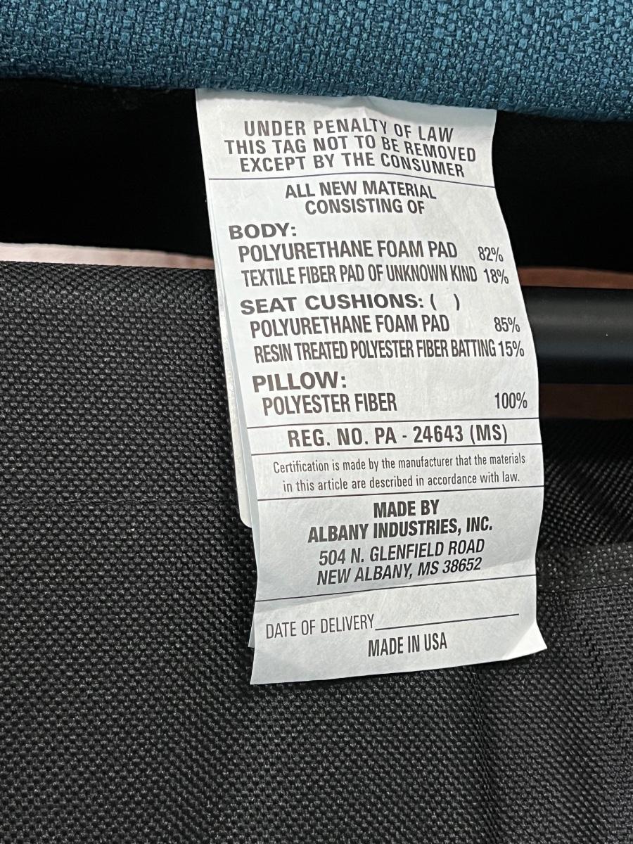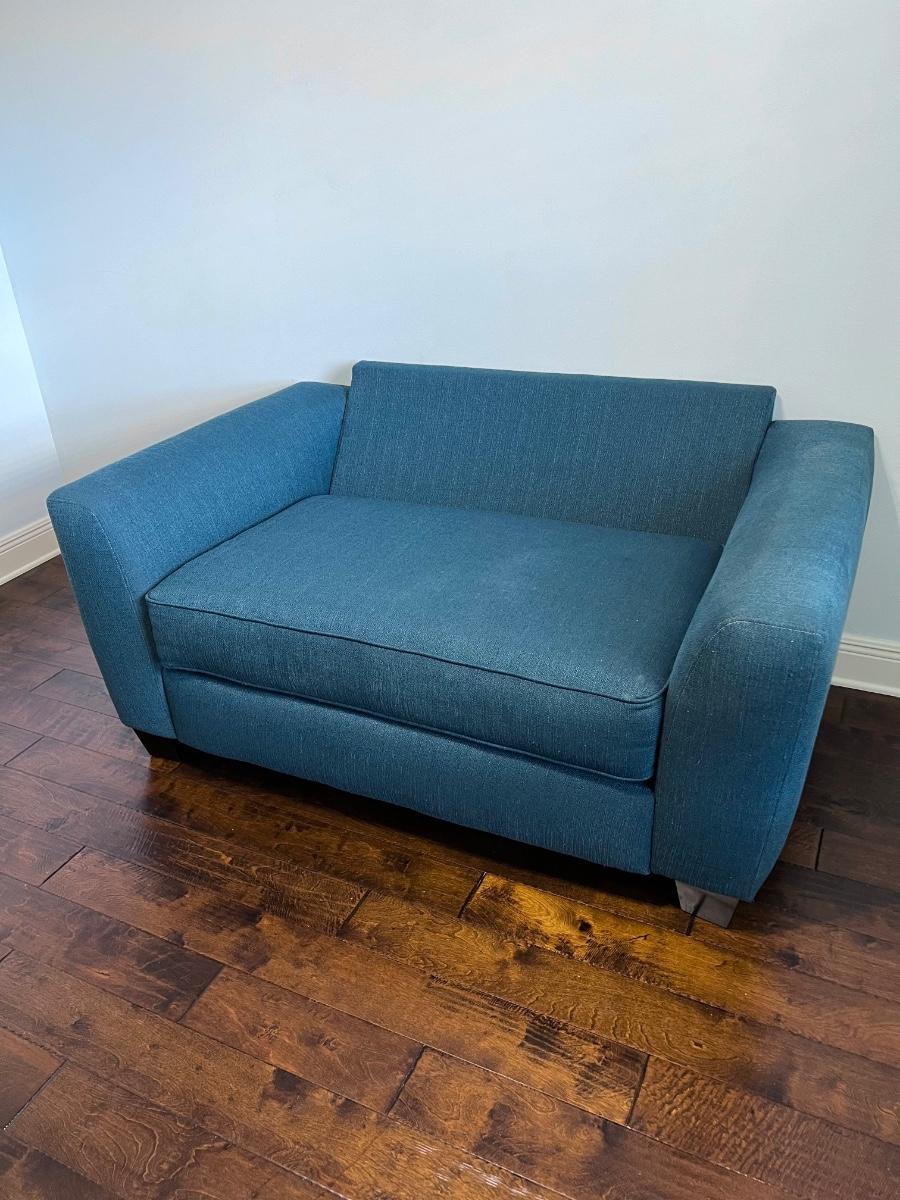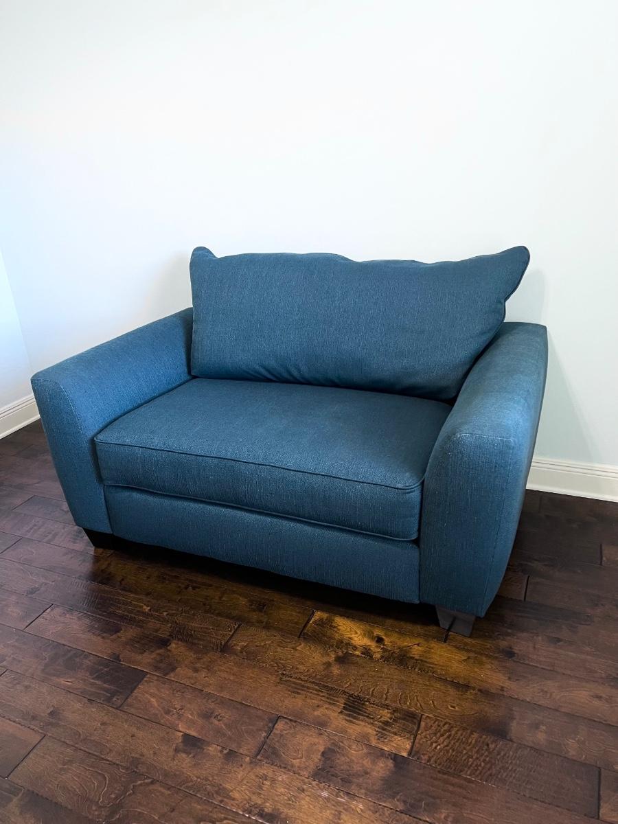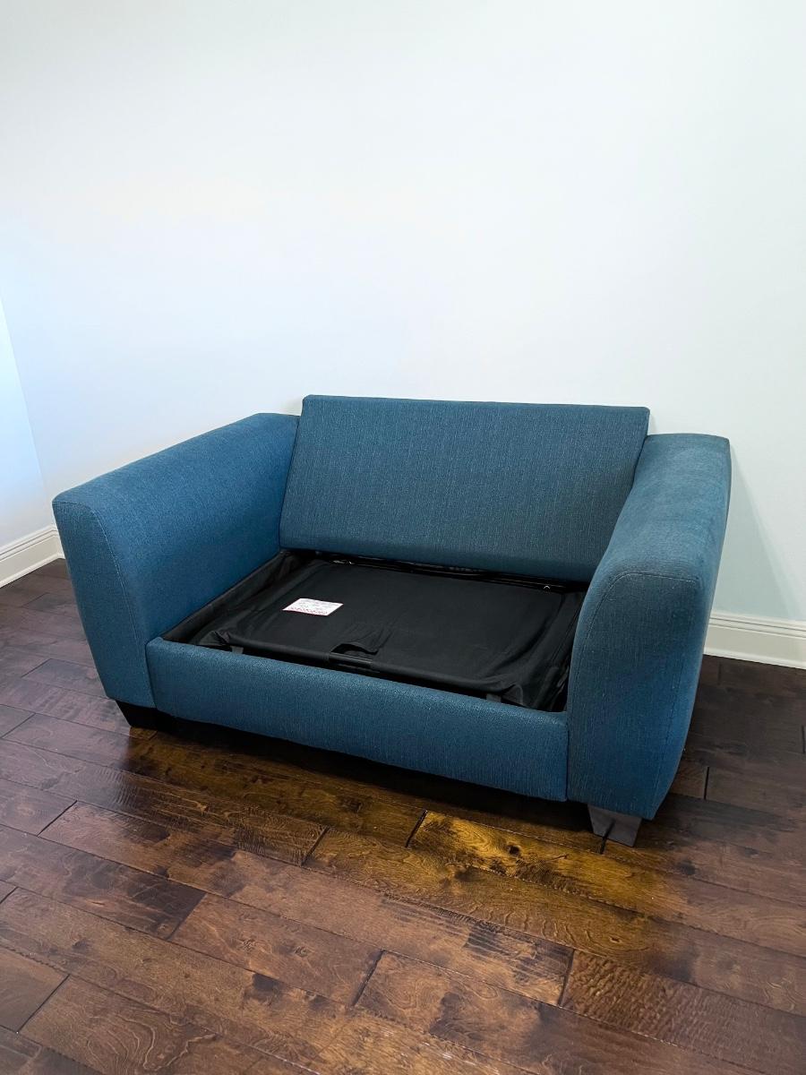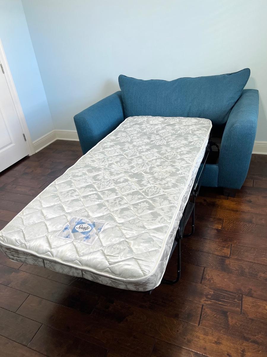 Has been disinfected, deodorized, & sanitized ~ SEALY mattress is a little smaller than a twin ~ Chair = 30” H x 60” W x 38” D ~ Sealy mattress = 33” W x 71” D ~ No Pets, No Smoking