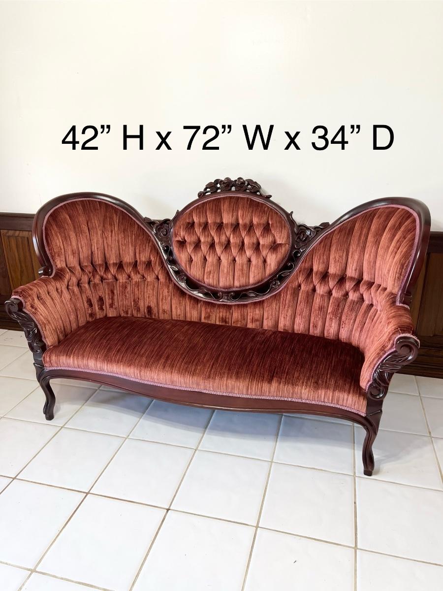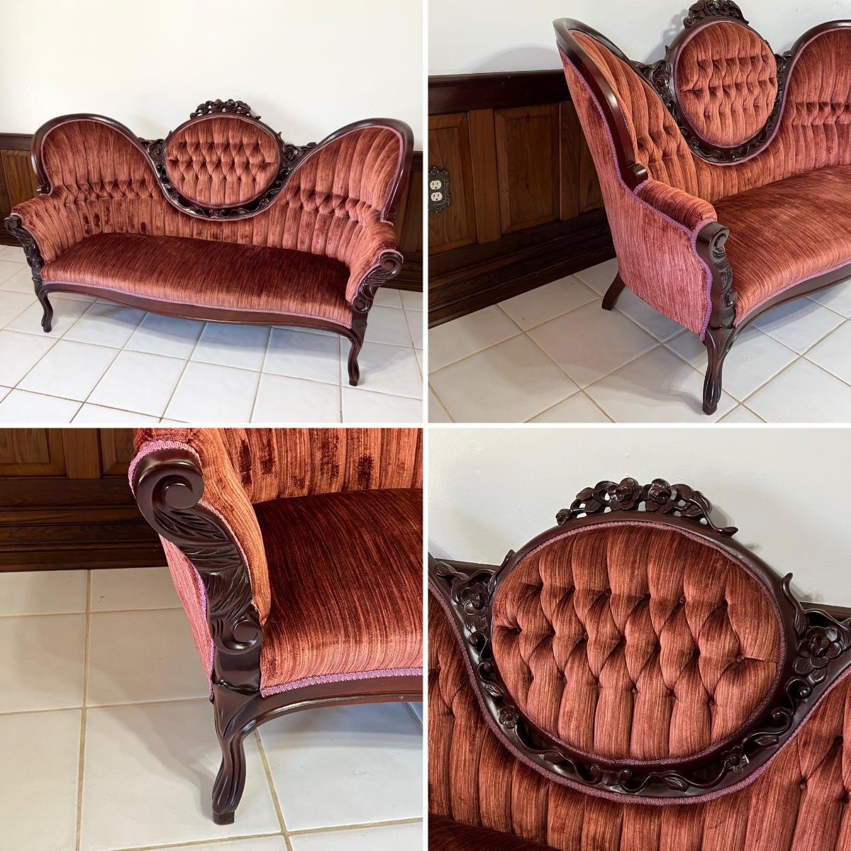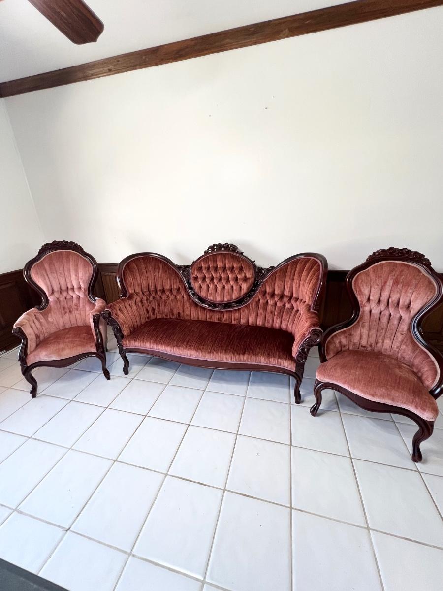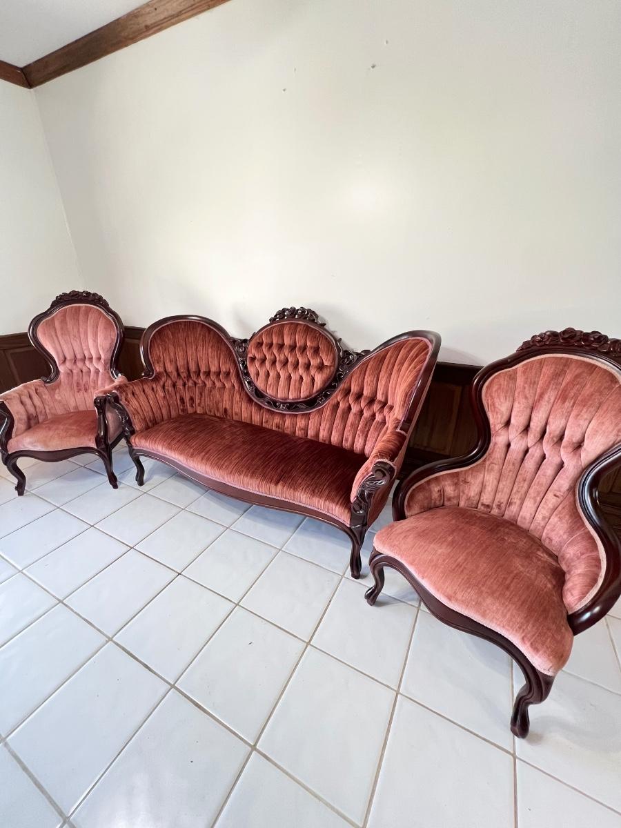 AMERICAN FURNITURE GALLERIES ~ Three (3) Piece Mahogany Floral Upholstered Victorian Style Tufted Set