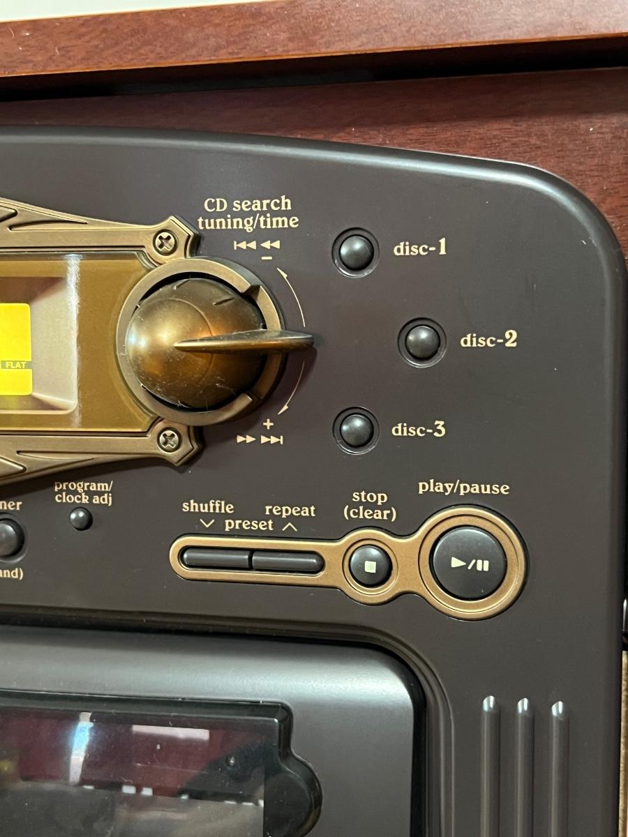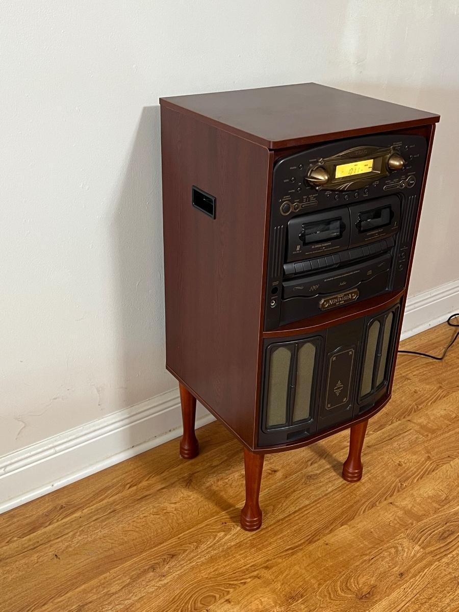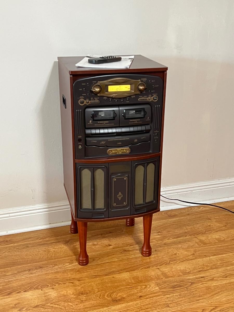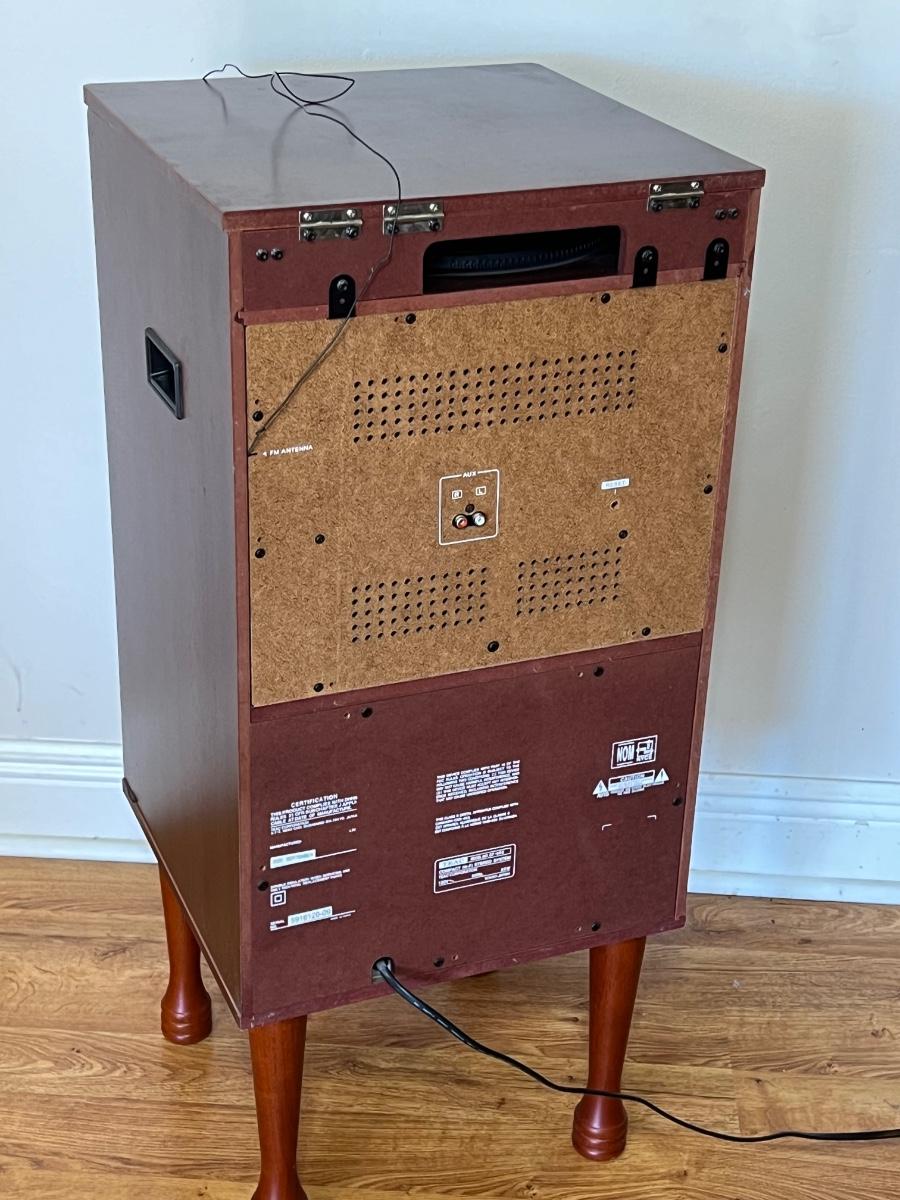Radio, CD player, record player works ~ Was unable to test cassette player due to not having any cassettes ~ **45 RPM adaptor for the record player is missing, see photos ~ **Remote is broken, needs to be replaced ~ Does work without remote ~ 35” H x 15.5” W x 16” D