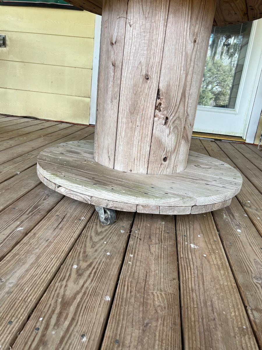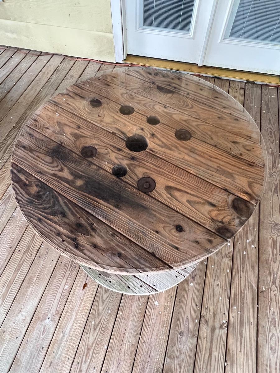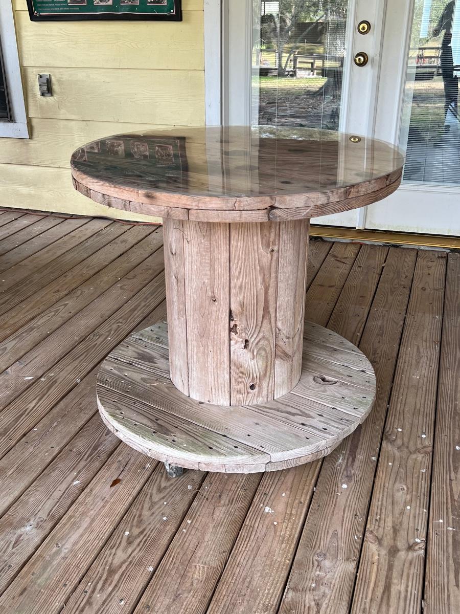 Repurposed cable spool into table ~ Has cut out plexiglass piece for the top ~ Rolls easy ~ 32” H x 34” Round