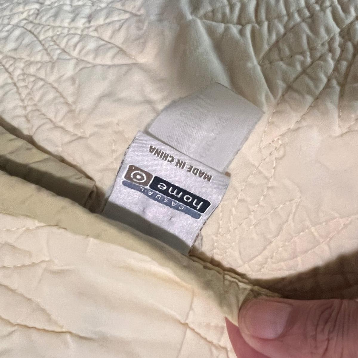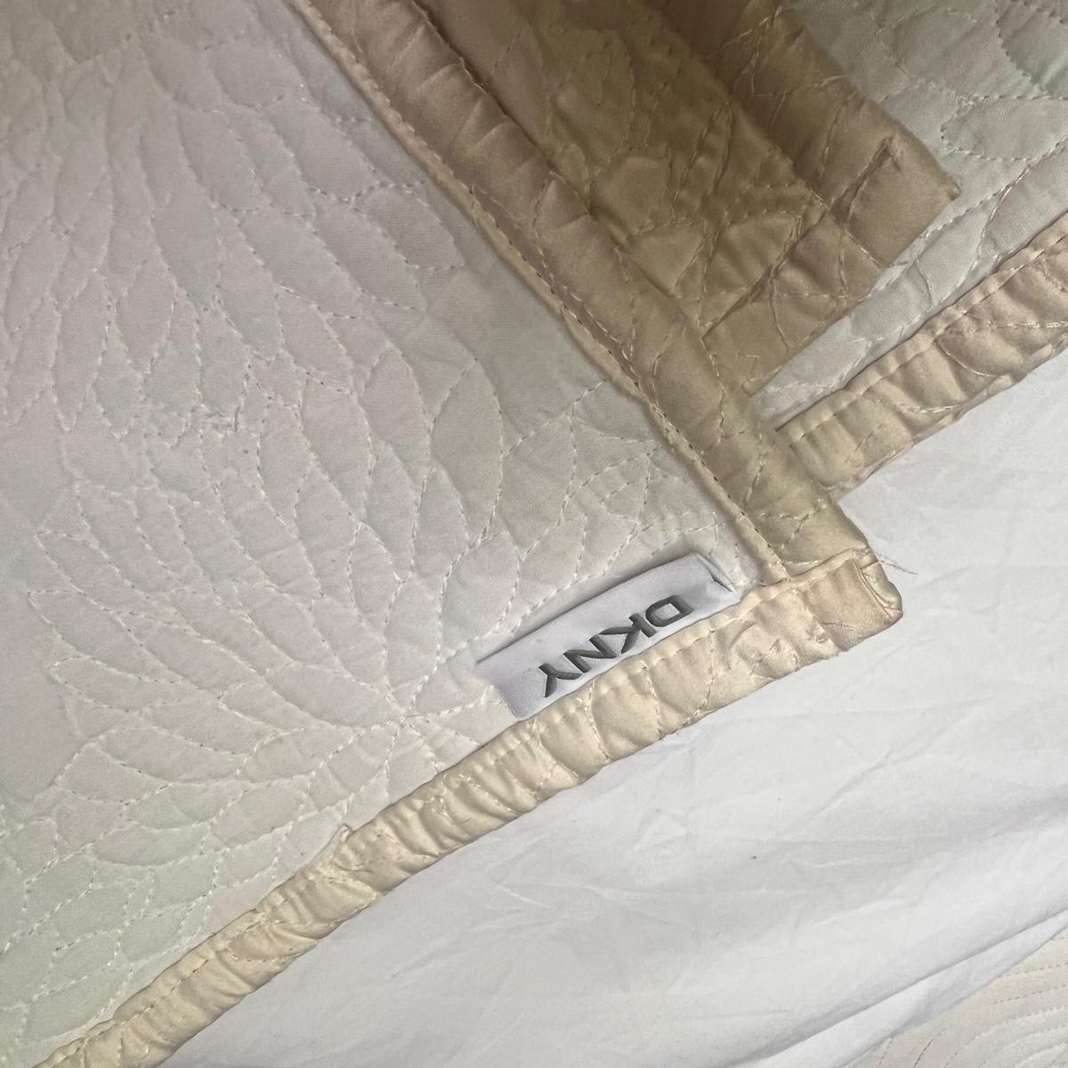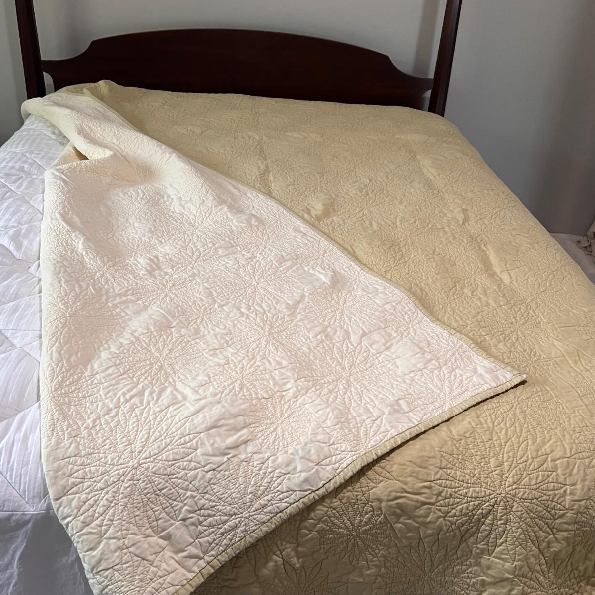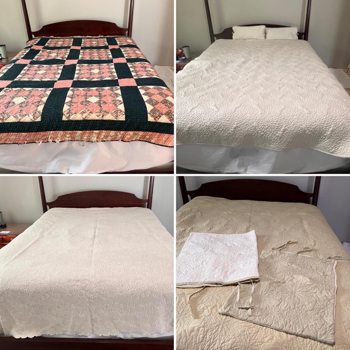 Four bedspreads includes an ivory DKNY (has two small accent pillows), a reversible chartreuse or cream Casual Home (two matching pillowcases), a dark cream jacquard design cotton/linen blend bedspread by Options and a multi colored quilt; this last quilt has some fraying shown in pics and is slightly smaller measuring 74” x 80”. Green bedspread measures 82” x 87”, Options bedspread measures 85” x 80” and the DKNY measures 82 x 80”. Photos taken on a king sized bed available in another lot in this sale. Note one of the ivory pillowcases has three small stains.