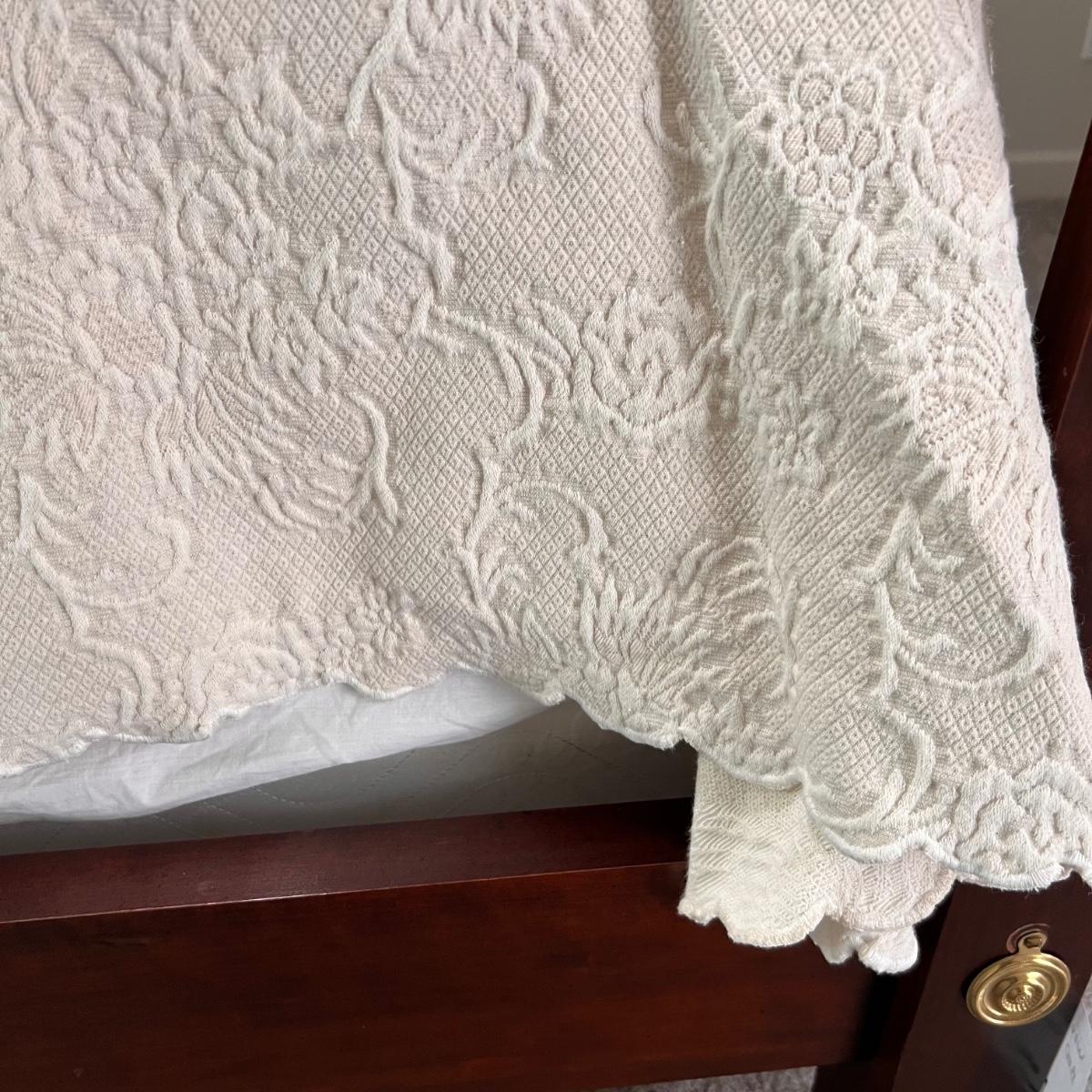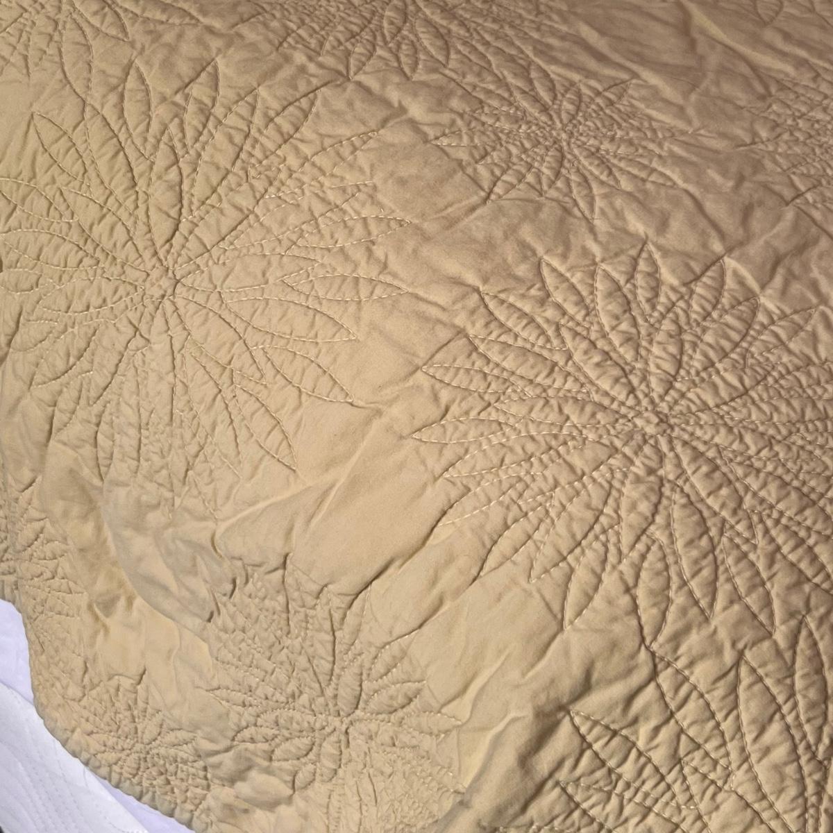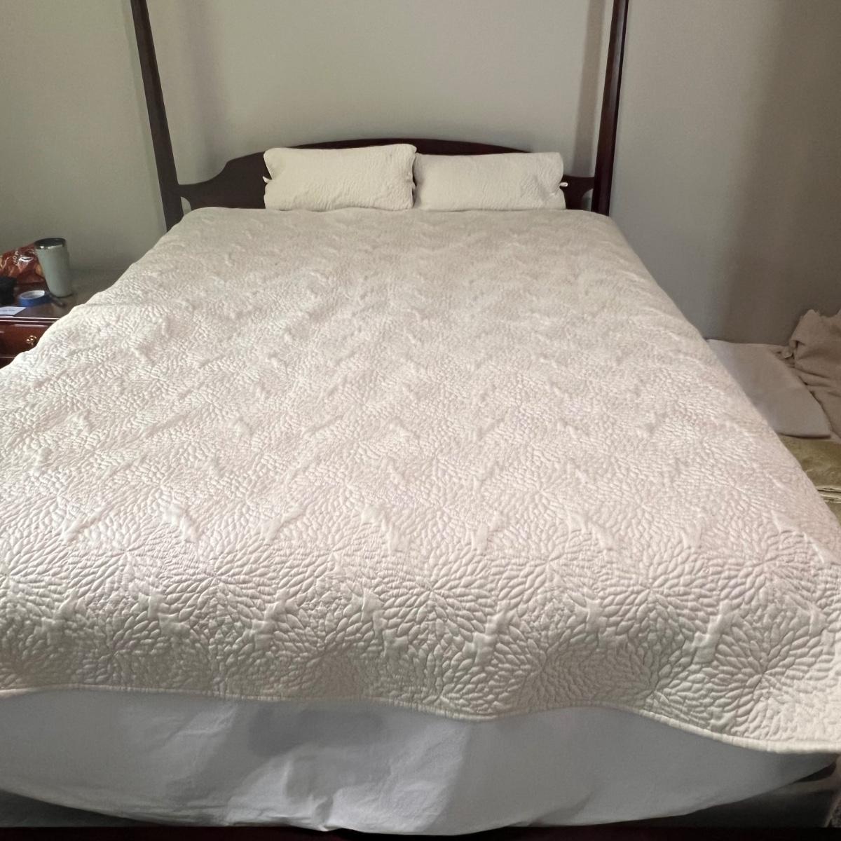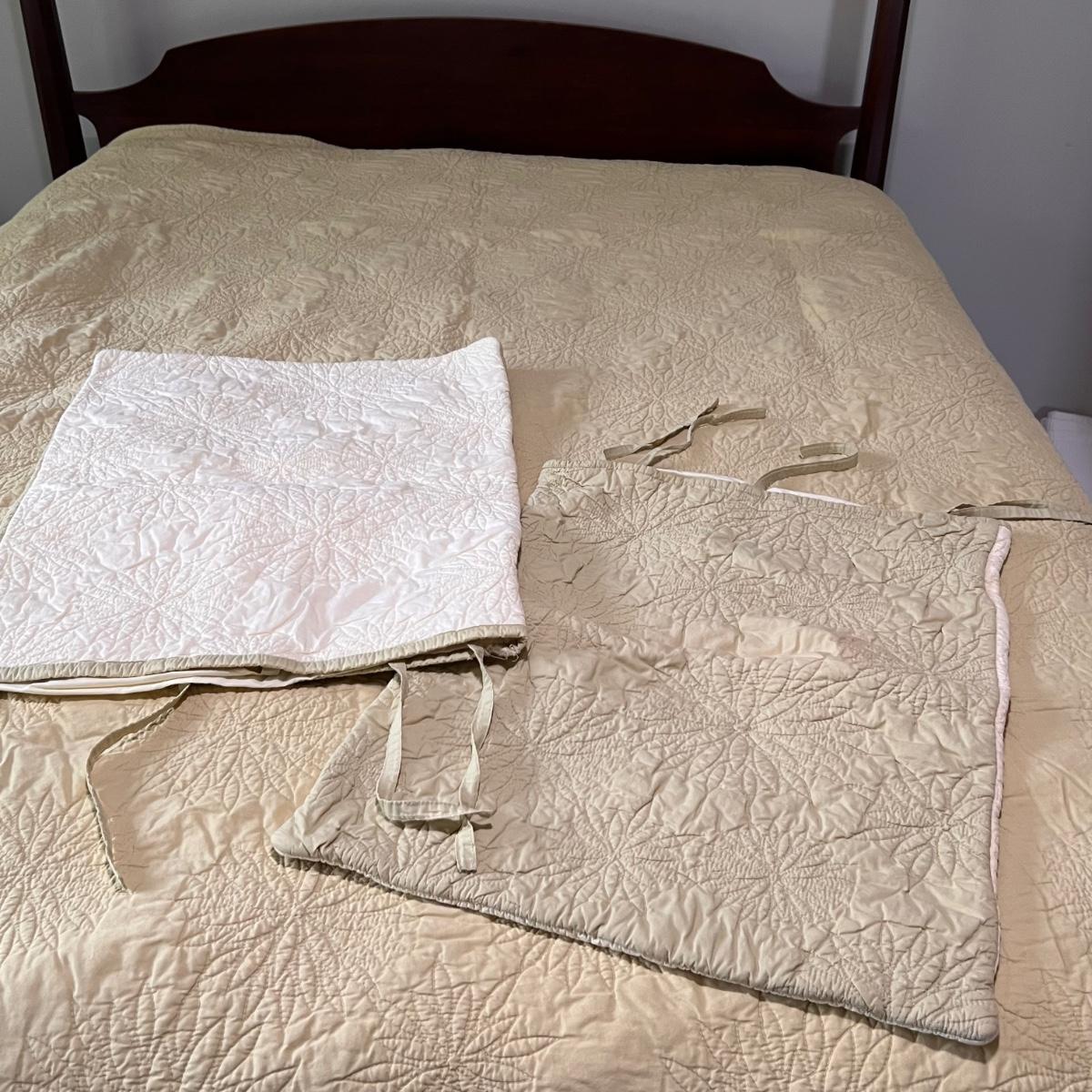 Four bedspreads includes an ivory DKNY (has two small accent pillows), a reversible chartreuse or cream Casual Home (two matching pillowcases), a dark cream jacquard design cotton/linen blend bedspread by Options and a multi colored quilt; this last quilt has some fraying shown in pics and is slightly smaller measuring 74” x 80”. Green bedspread measures 82” x 87”, Options bedspread measures 85” x 80” and the DKNY measures 82 x 80”. Photos taken on a king sized bed available in another lot in this sale. Note one of the ivory pillowcases has three small stains.