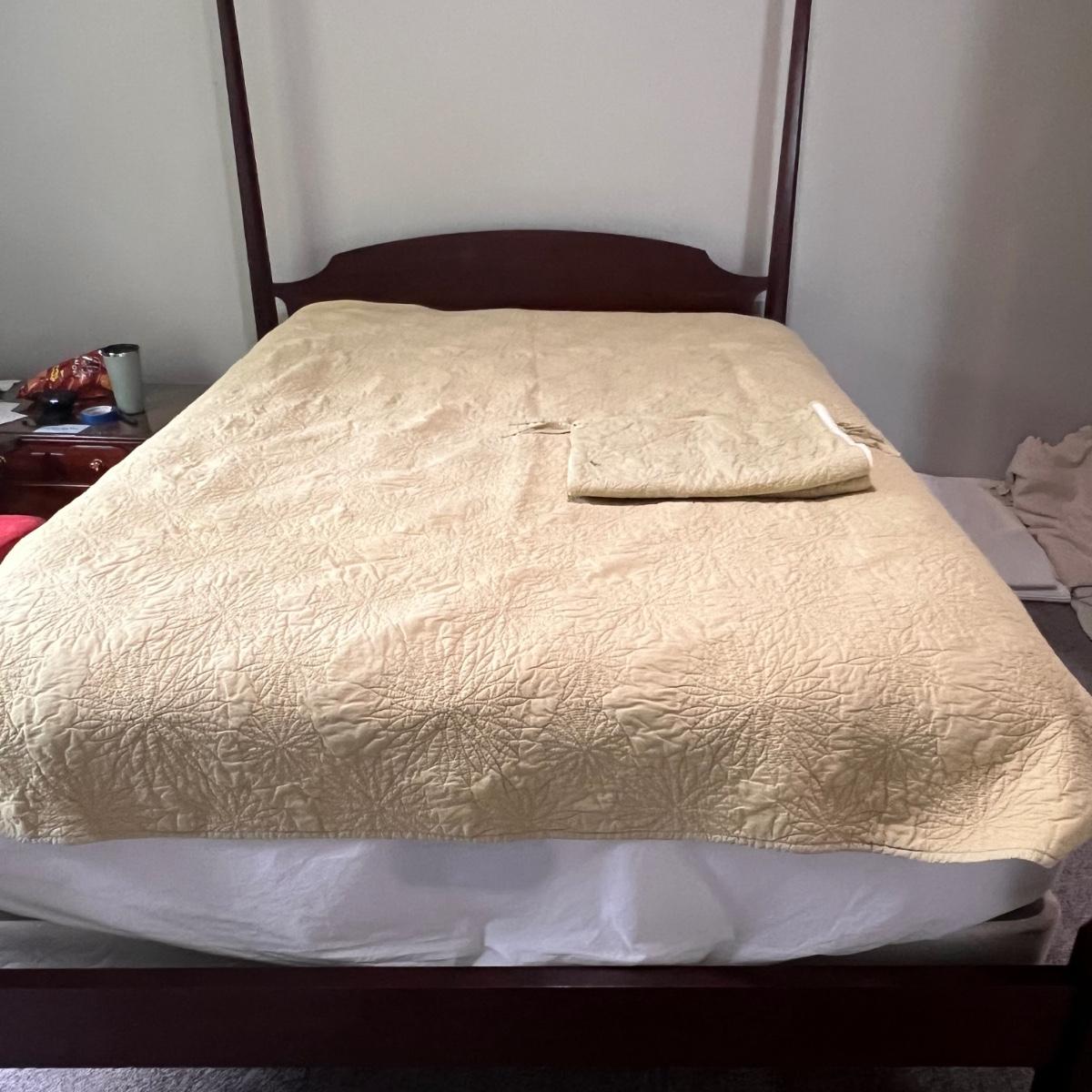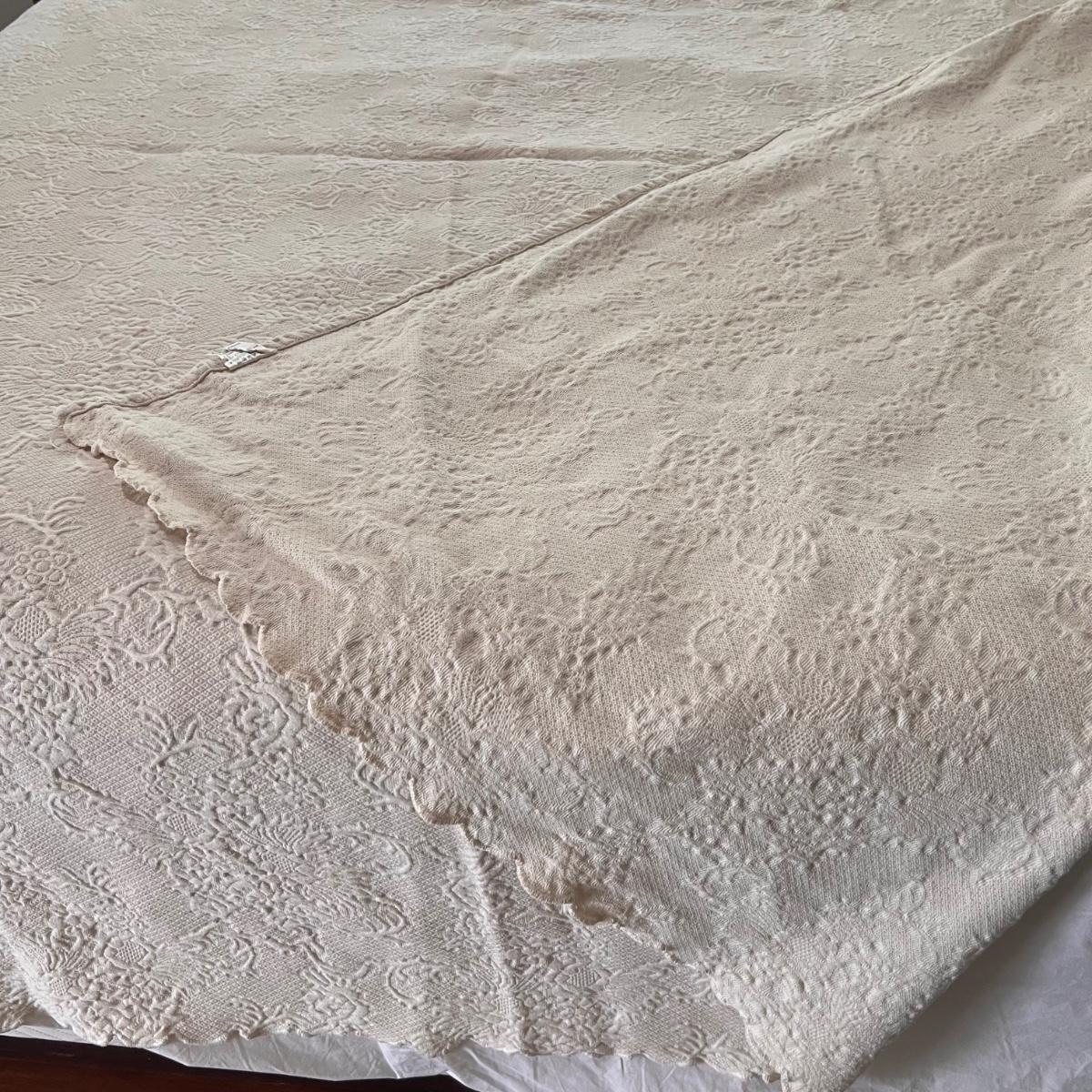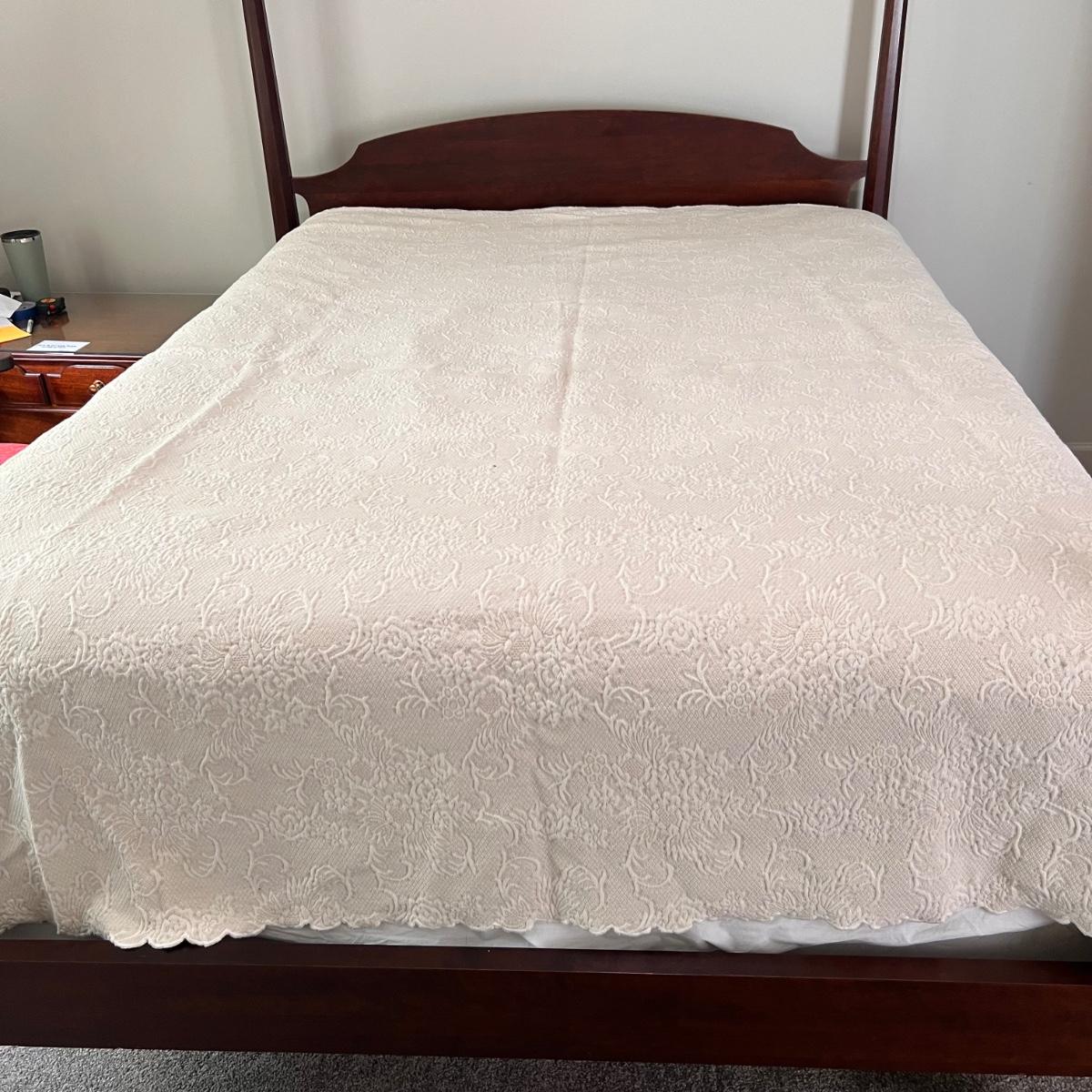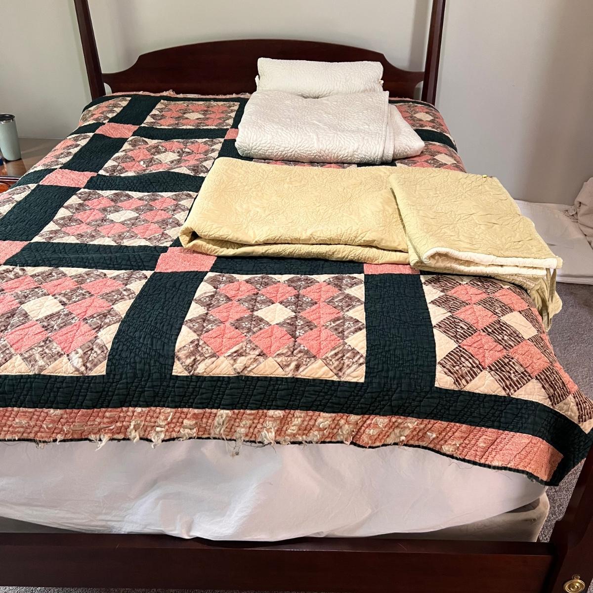 Four bedspreads includes an ivory DKNY (has two small accent pillows), a reversible chartreuse or cream Casual Home (two matching pillowcases), a dark cream jacquard design cotton/linen blend bedspread by Options and a multi colored quilt; this last quilt has some fraying shown in pics and is slightly smaller measuring 74” x 80”. Green bedspread measures 82” x 87”, Options bedspread measures 85” x 80” and the DKNY measures 82 x 80”. Photos taken on a king sized bed available in another lot in this sale. Note one of the ivory pillowcases has three small stains.