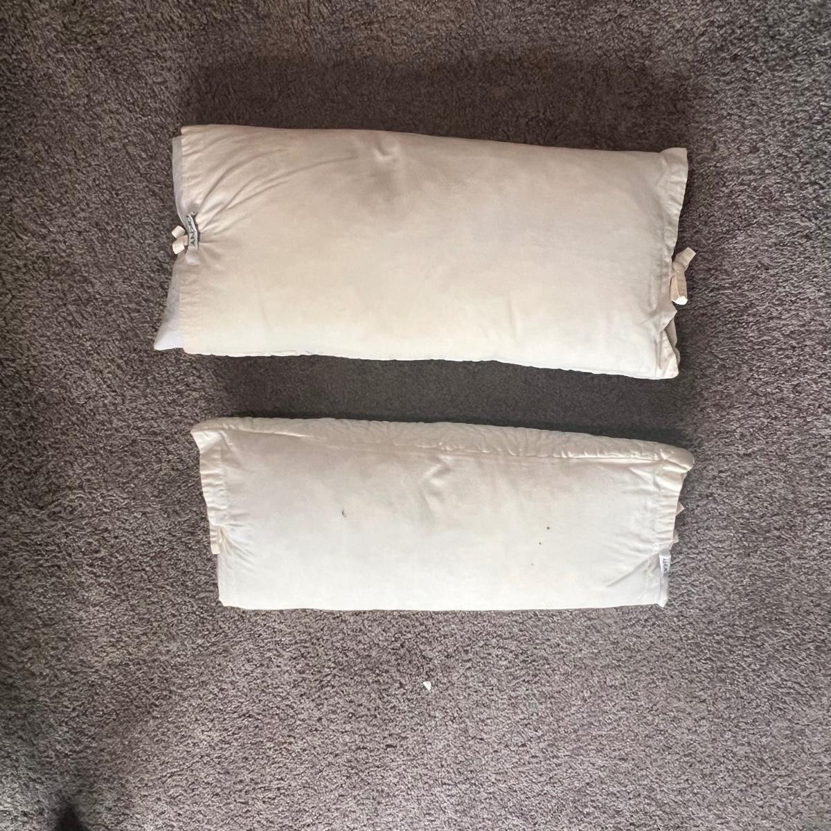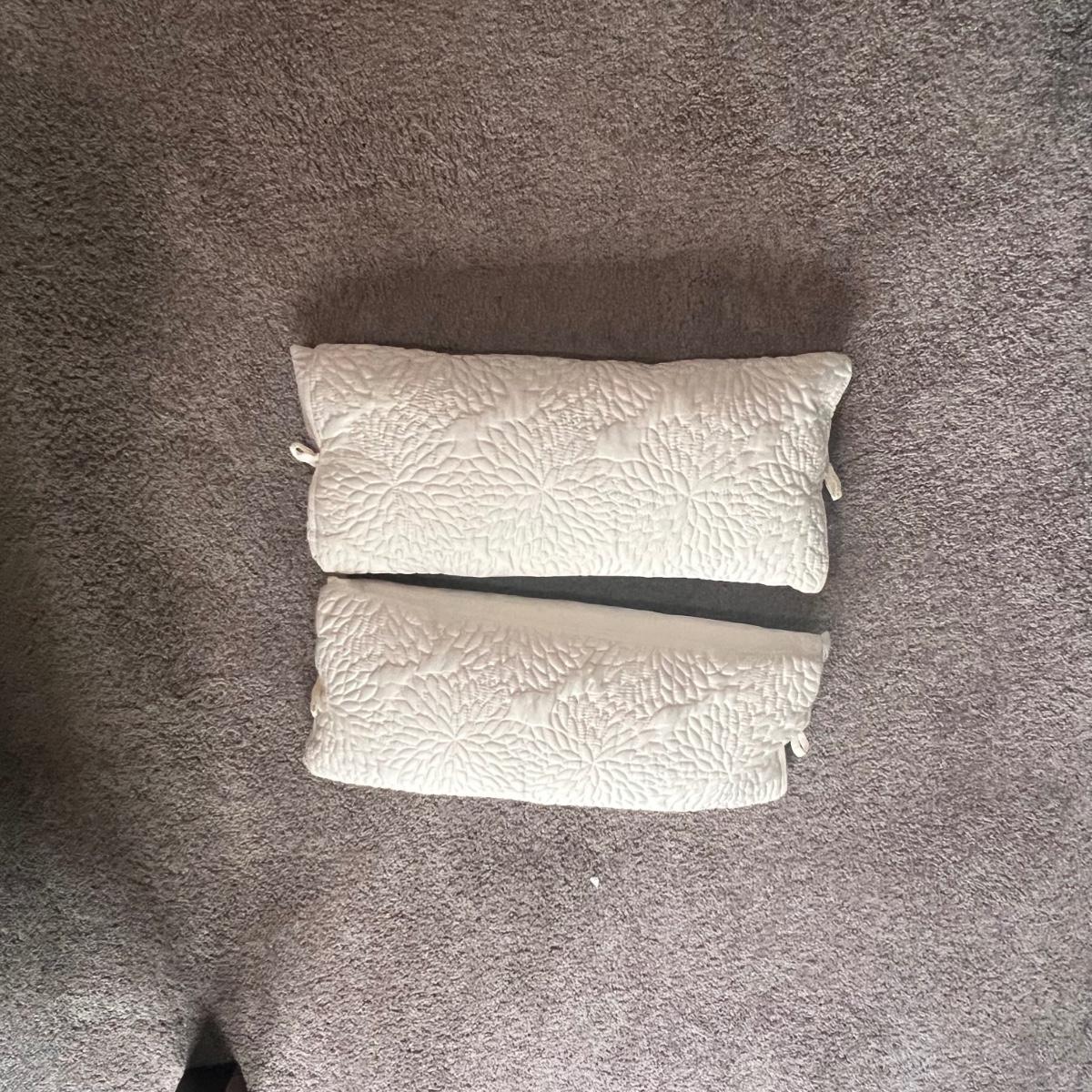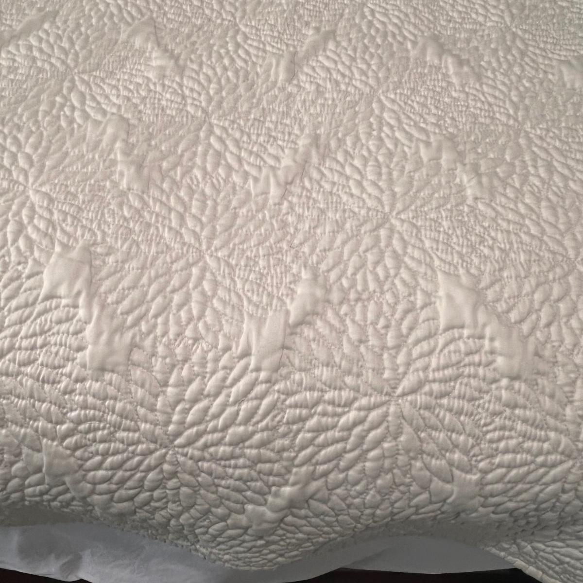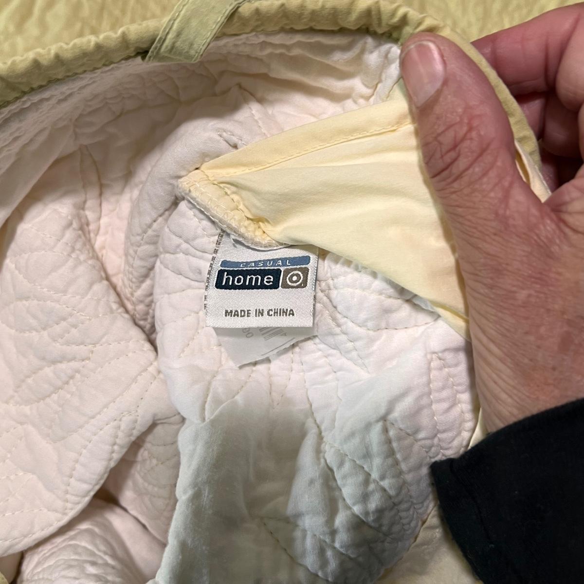 Four bedspreads includes an ivory DKNY (has two small accent pillows), a reversible chartreuse or cream Casual Home (two matching pillowcases), a dark cream jacquard design cotton/linen blend bedspread by Options and a multi colored quilt; this last quilt has some fraying shown in pics and is slightly smaller measuring 74” x 80”. Green bedspread measures 82” x 87”, Options bedspread measures 85” x 80” and the DKNY measures 82 x 80”. Photos taken on a king sized bed available in another lot in this sale. Note one of the ivory pillowcases has three small stains.