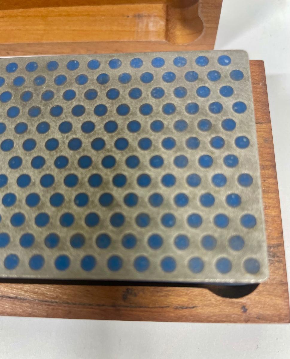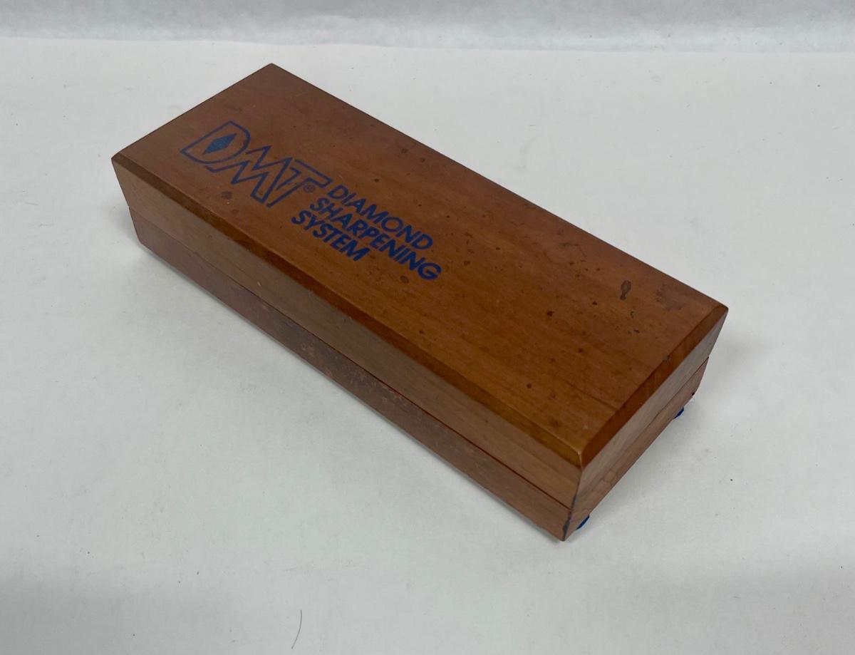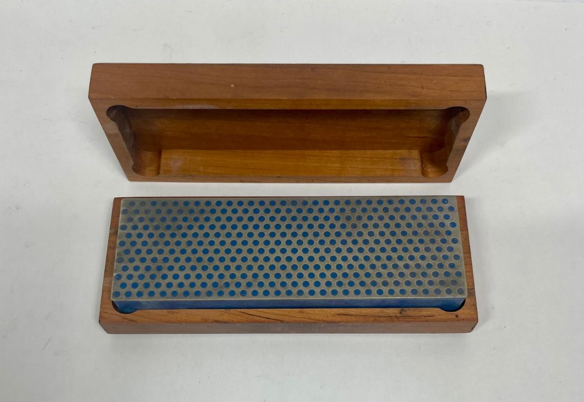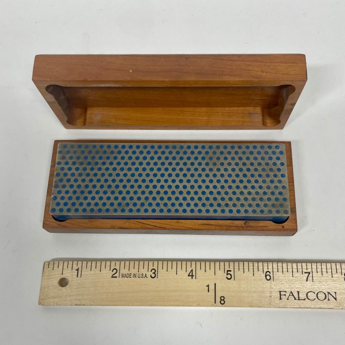 8" diamond whetstone with wood case. Excellent for sharpening tools with steel, ceramic or carbide surfaces. Typical uses are for sharpening woodworking tools, kitchen cutlery, and outdoor knives. Very good condition.