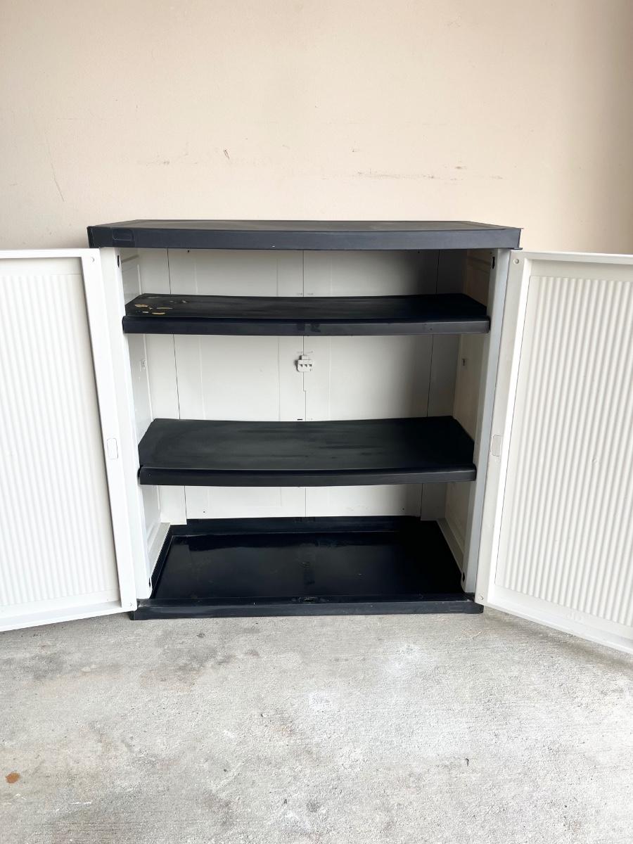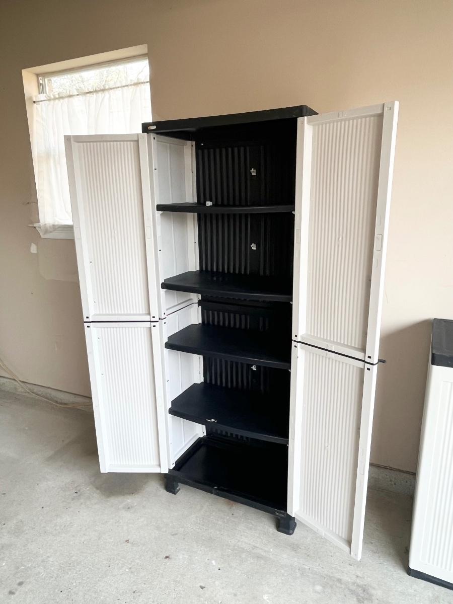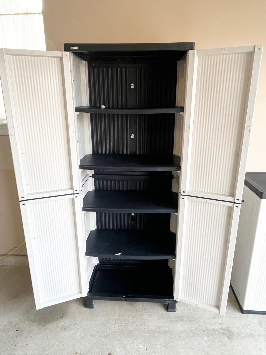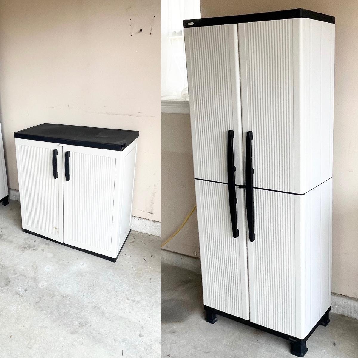 The shelves in the tall cabinet are removable / adjustable ~ Tall cabinet.measures 68” H x 26.5” W x 14.5” D ~ short cabinet measures 36” H 34.5” W x 17.5”