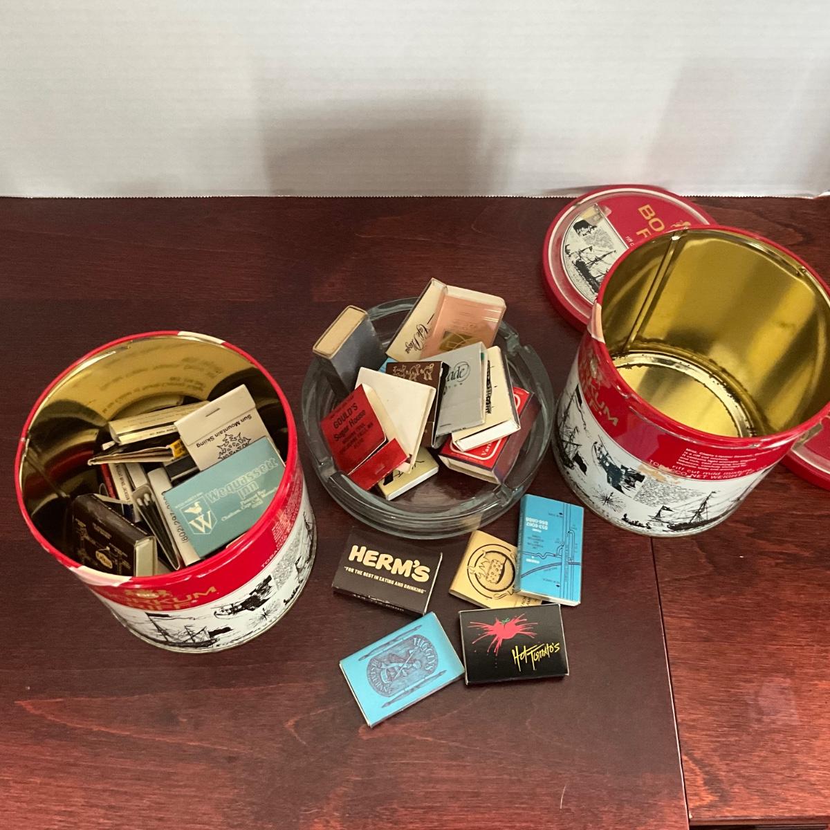 Two Tobacco Tins with book matches, Meershaum Pipe with case and brass and glass ashtrays