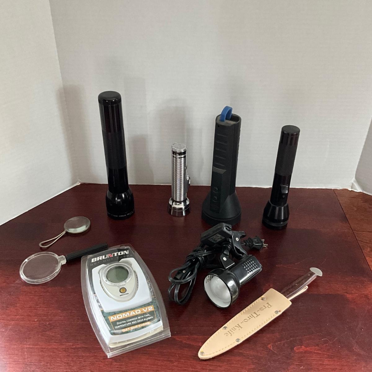 DO1346 Lot of Flash Lights , Throw Knife , Digital Compass