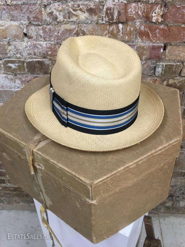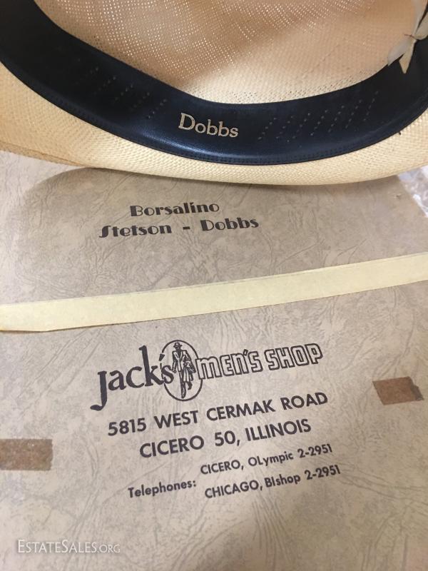 Vintage Straw Fedora by Dobbs, with box size 7. From Jack's men's Shop Chicago Ill.