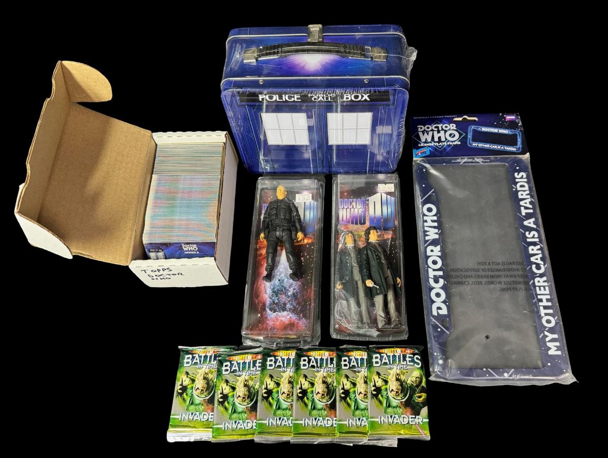 Includes Topps trading cards, police call box, lunch box, license plate frame, and three action figures. Total of six pieces. Some items are NOS. Some have age related wear. Pre-auction estimate: $50-$100.