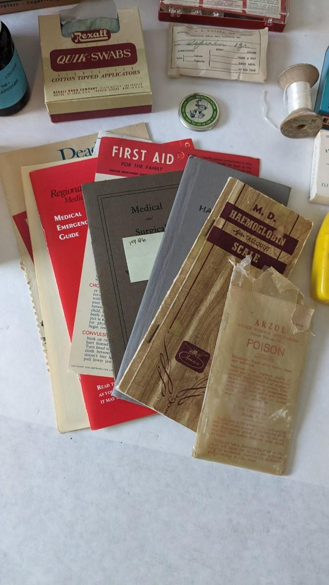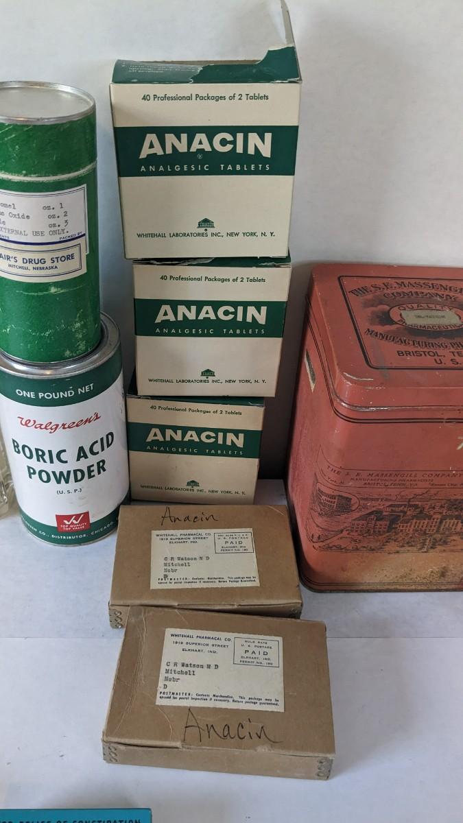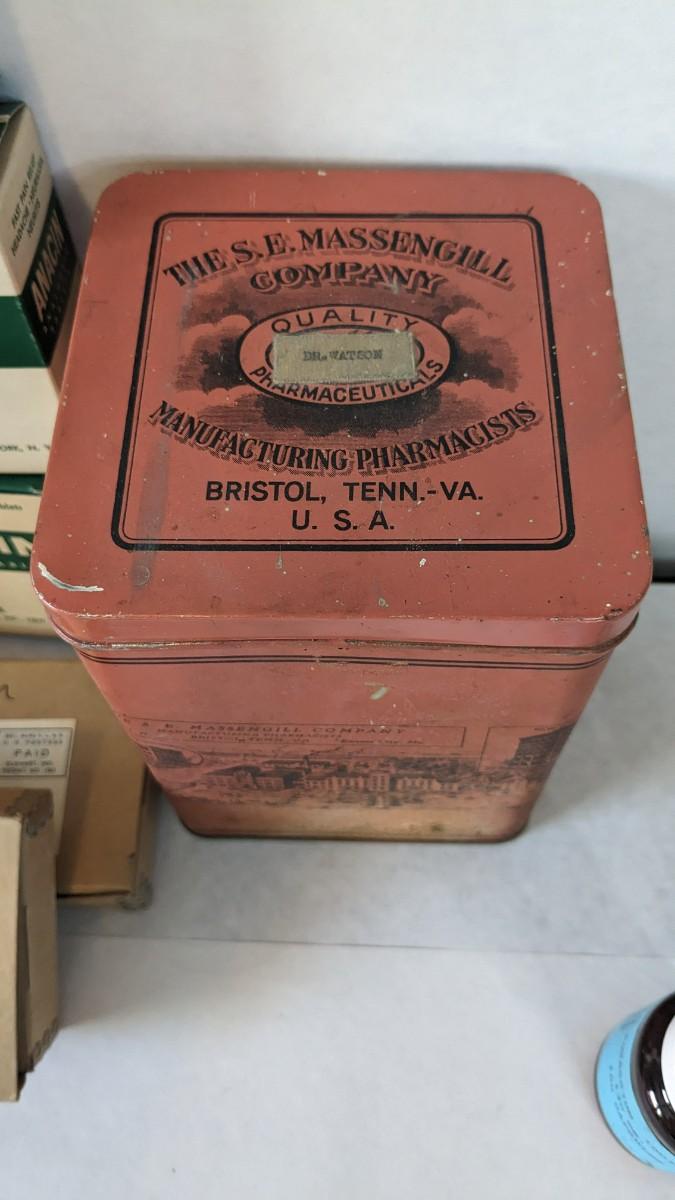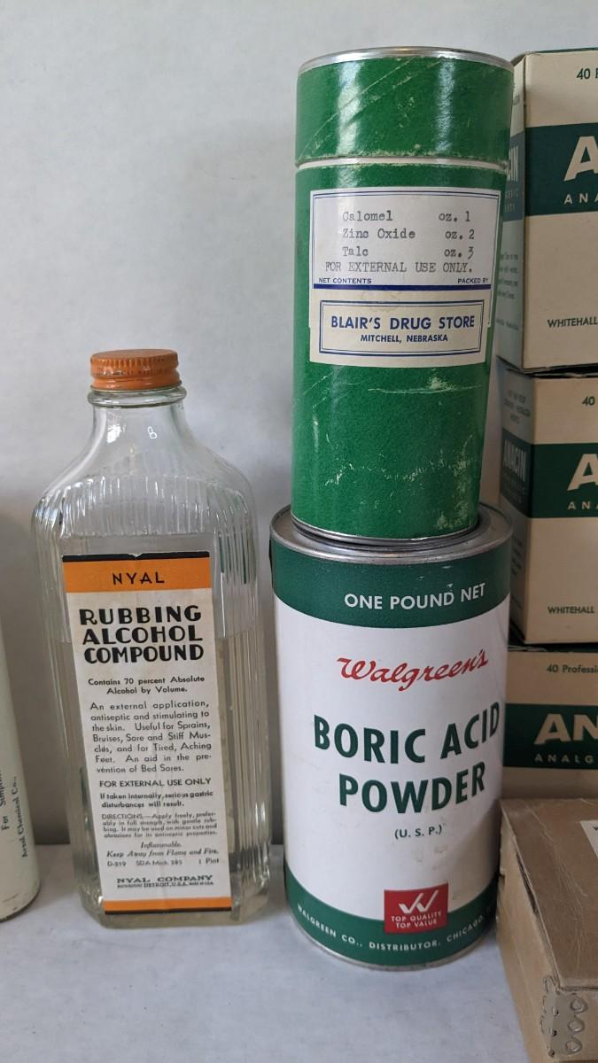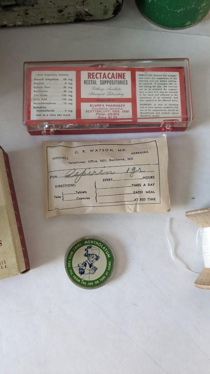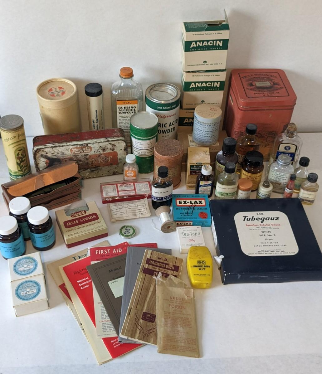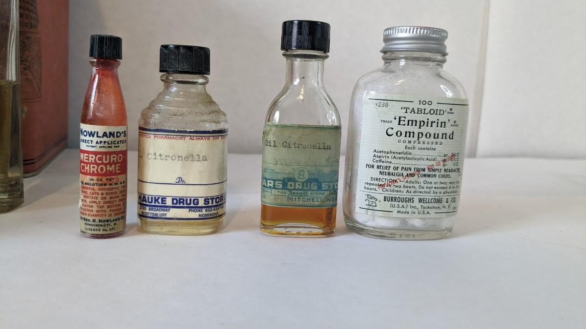 Straight from Doc Watson's own medicine cabinet is a lovely display of antique and vintage medicines, compounds, oils, powders, and other items needed for taking quick medical action. Items are in surprisingly good condition for age with a lot of bottles still containing contents and some just new in package. No shipping.