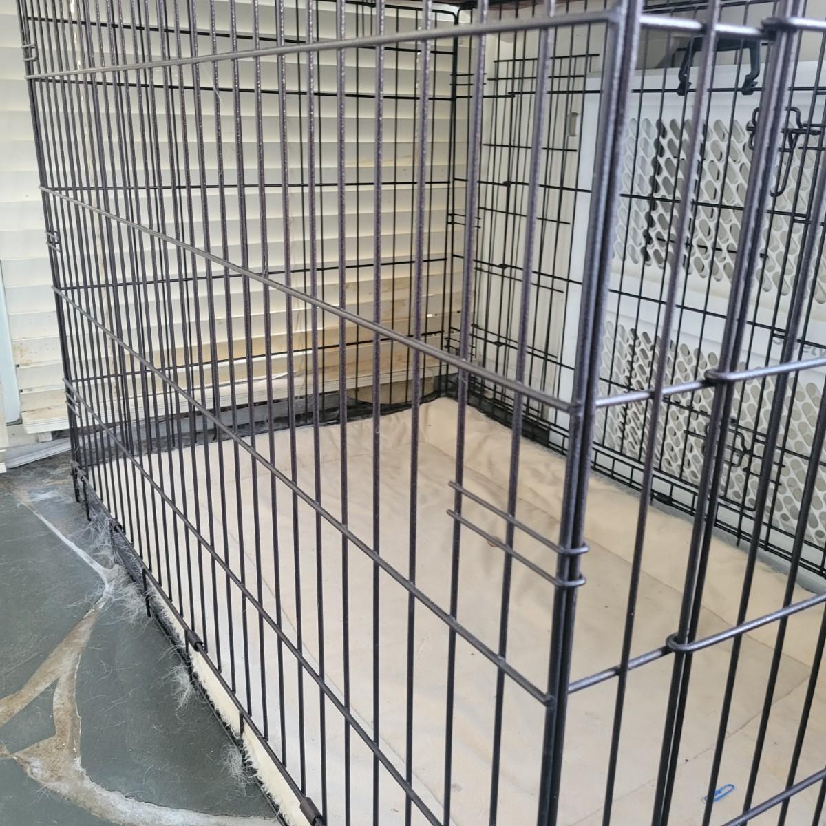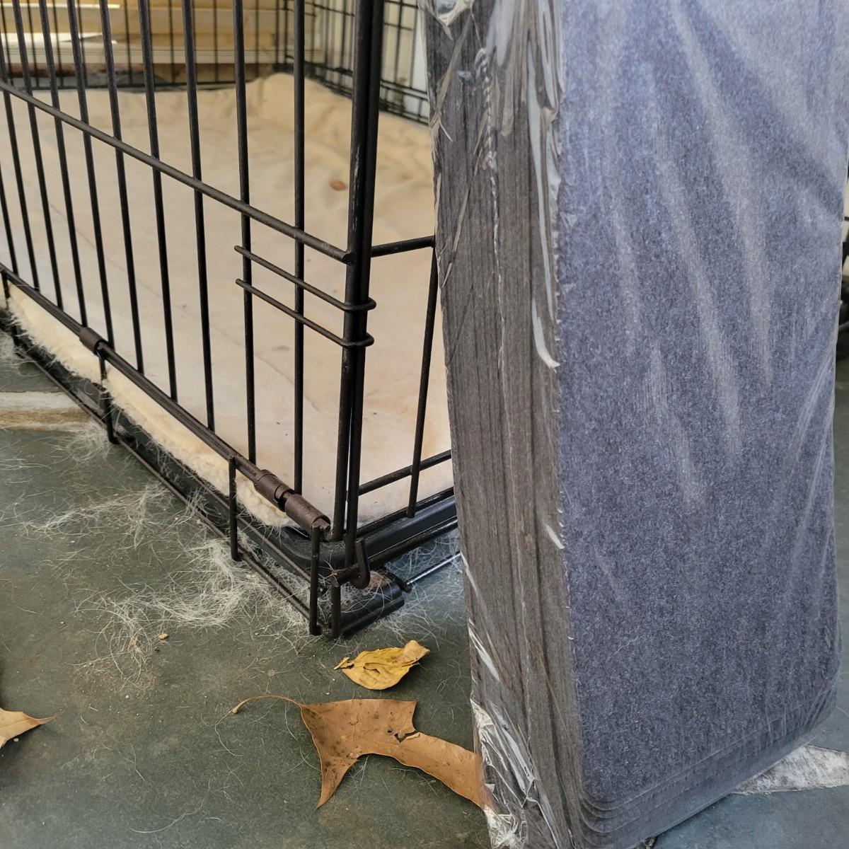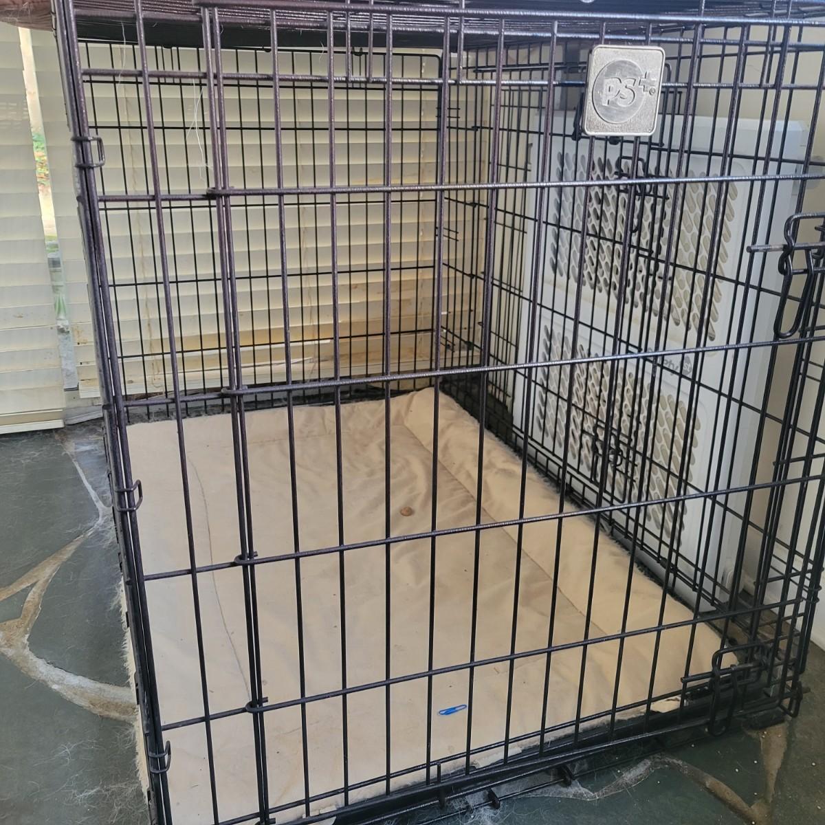 An assortment of dog related items that includes a large, collapsible dog crate that measures approximately 28" x 42" x 30.5"H. Also includes grooming tools, a leash, none slip stair treads, a pet gate and more. See attached pictures for complete inventory. Local pickup only