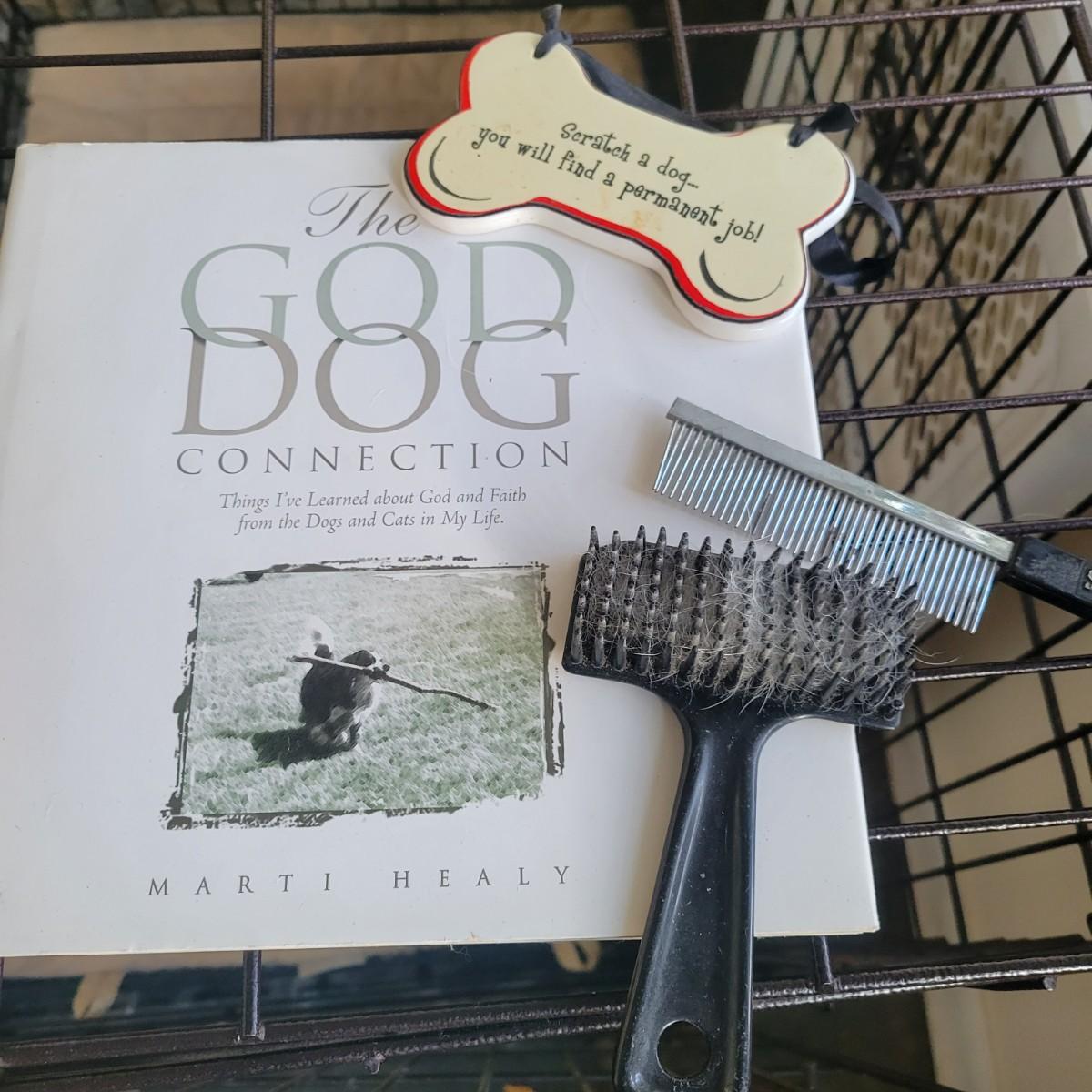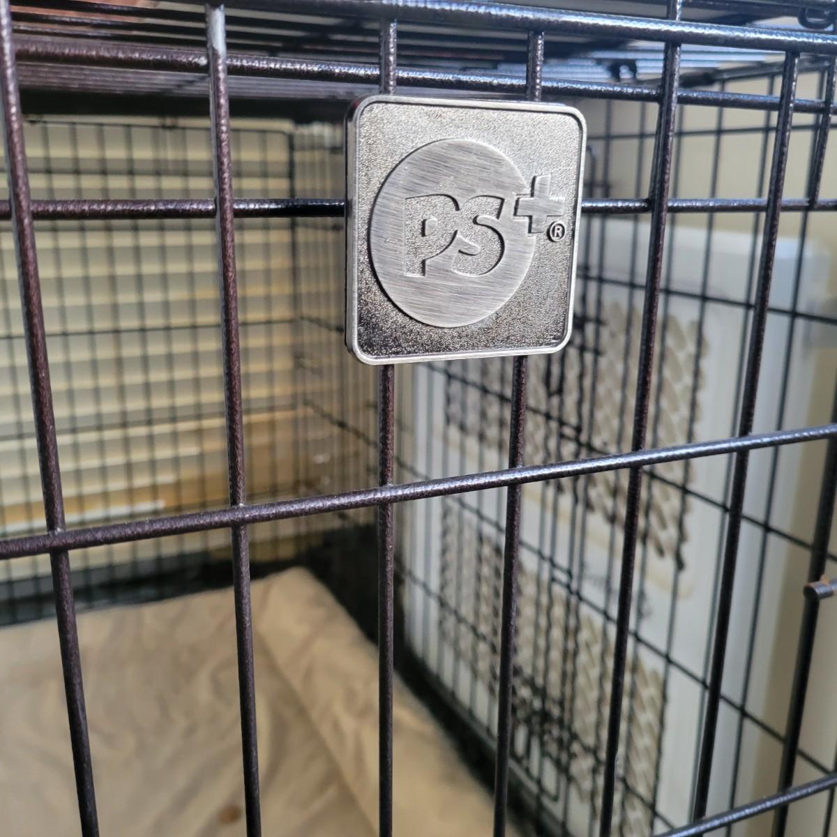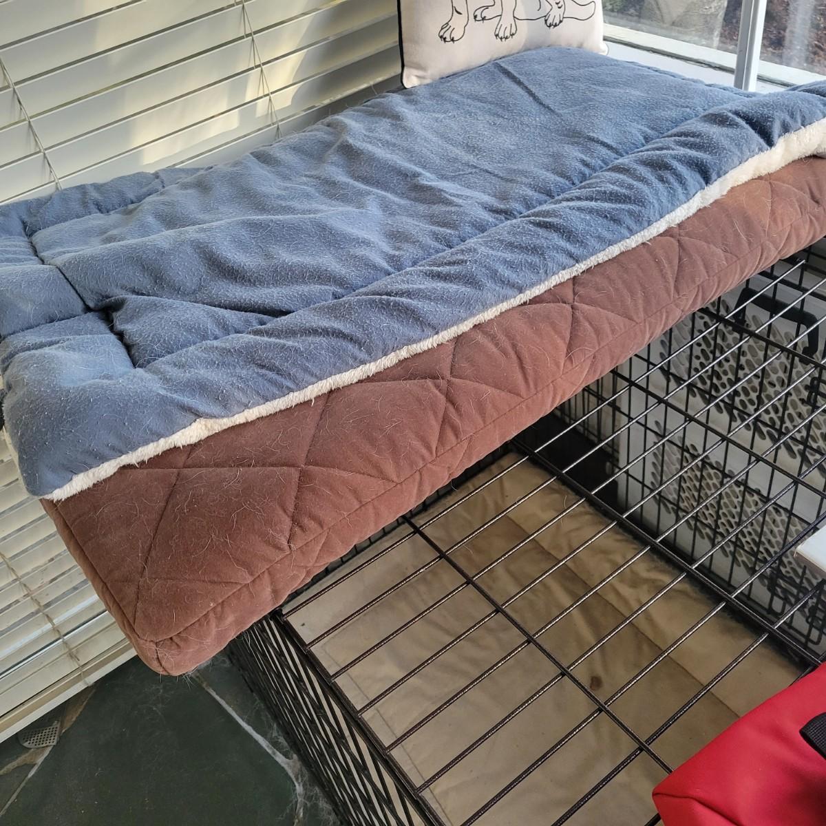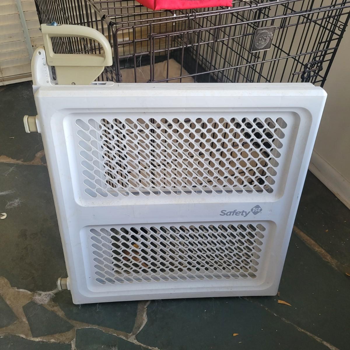 An assortment of dog related items that includes a large, collapsible dog crate that measures approximately 28" x 42" x 30.5"H. Also includes grooming tools, a leash, none slip stair treads, a pet gate and more. See attached pictures for complete inventory. Local pickup only