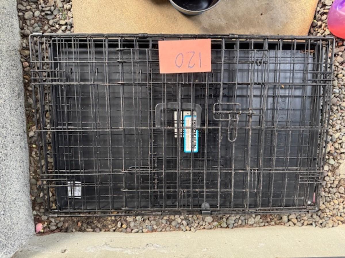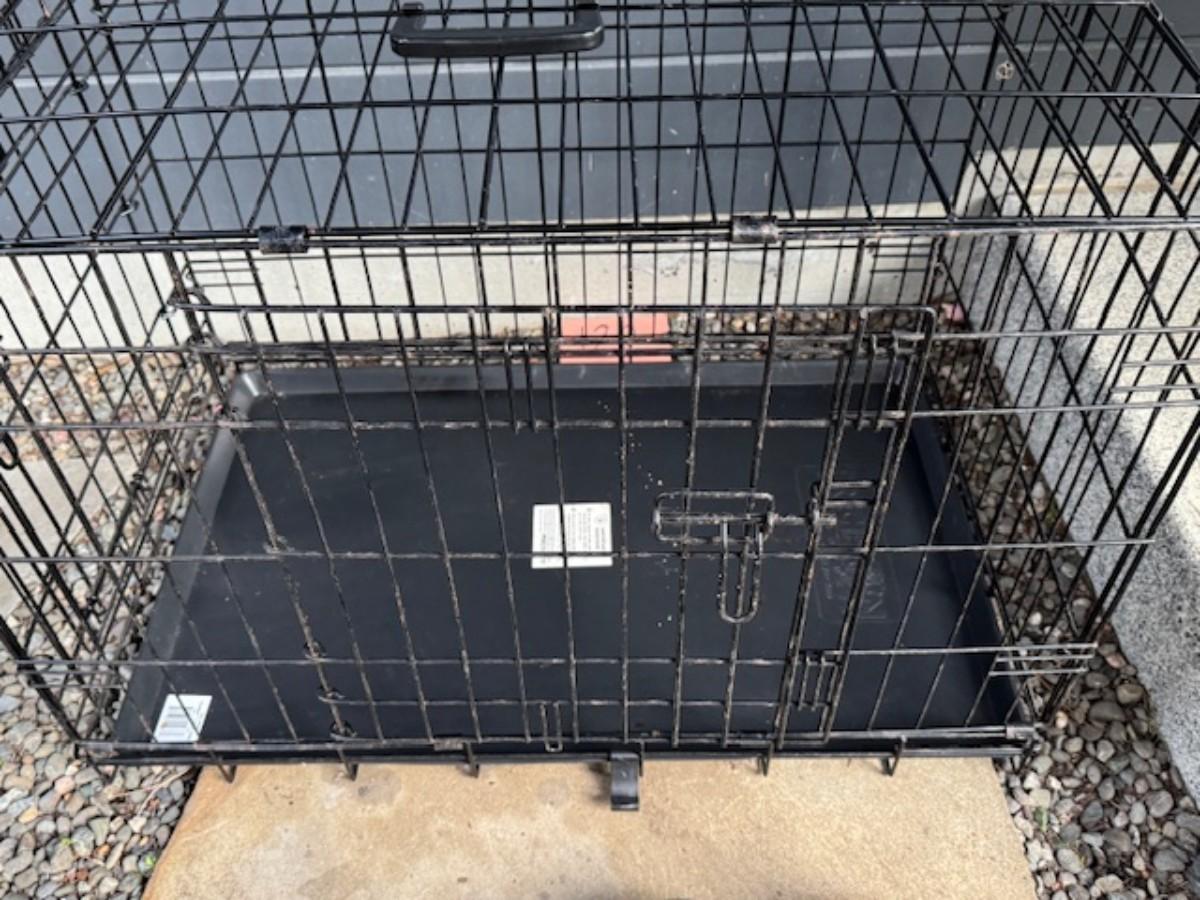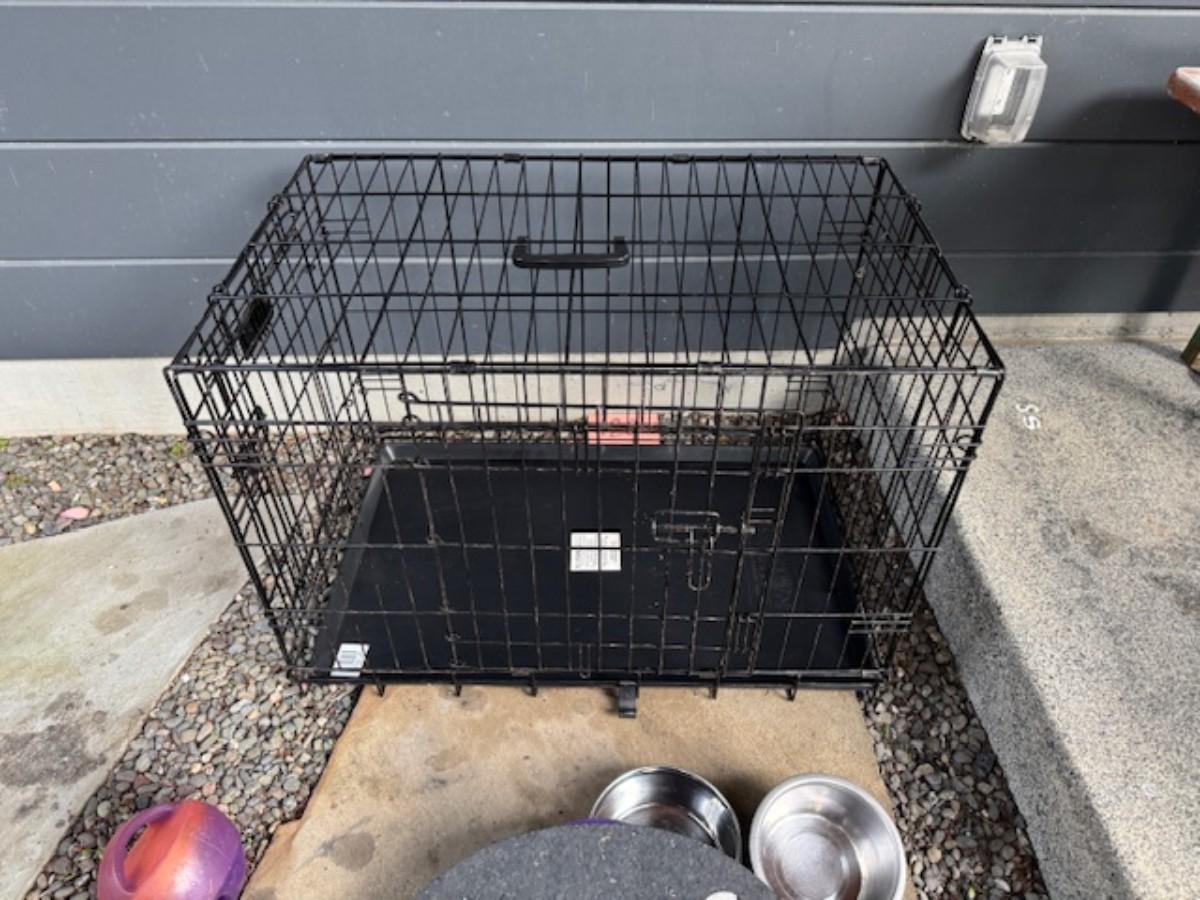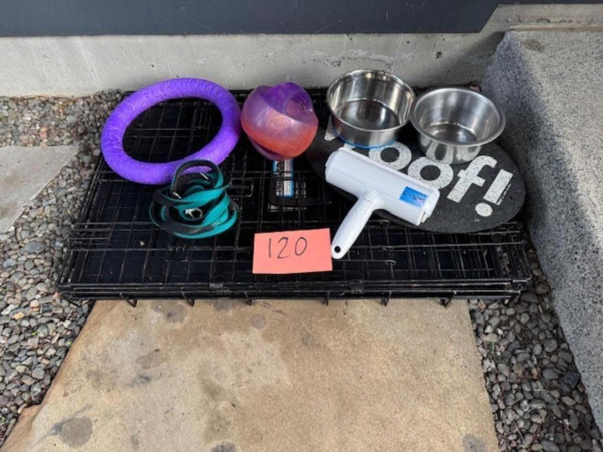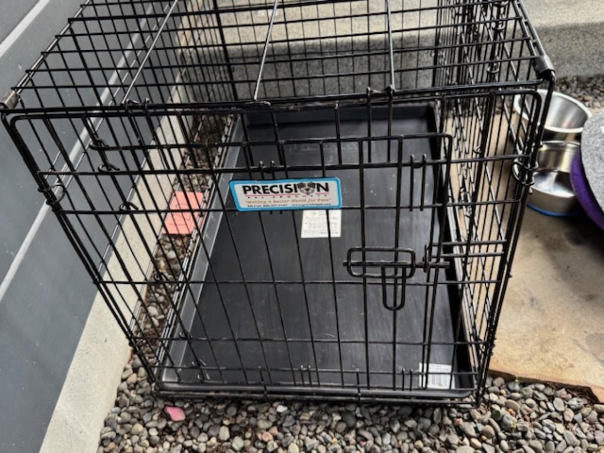 Precision Pet Products folding kennel - W 30" x D 19" x H 21" has a handle on top and removeable lower tray for cleaning. (Has a little bit of rust present.) 2 non matching bowls, "WOOF" food bowl mat, 1 leash with 2 hooks and holding grip, and a pet hair remover from pethairgone.com.