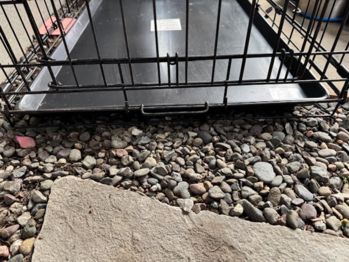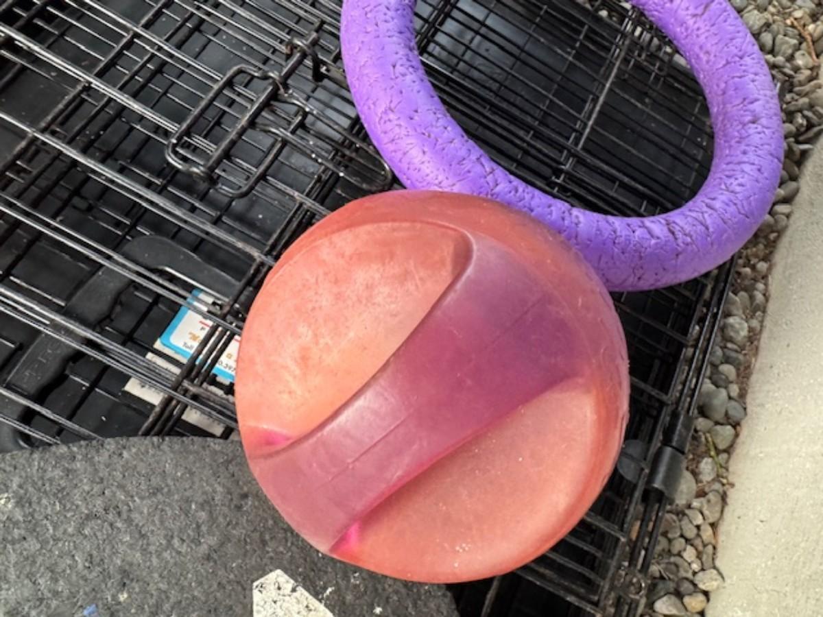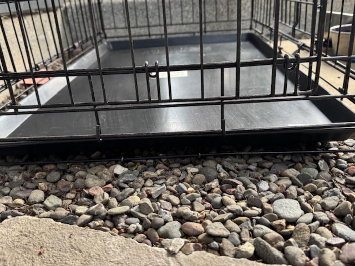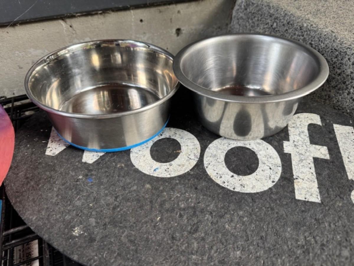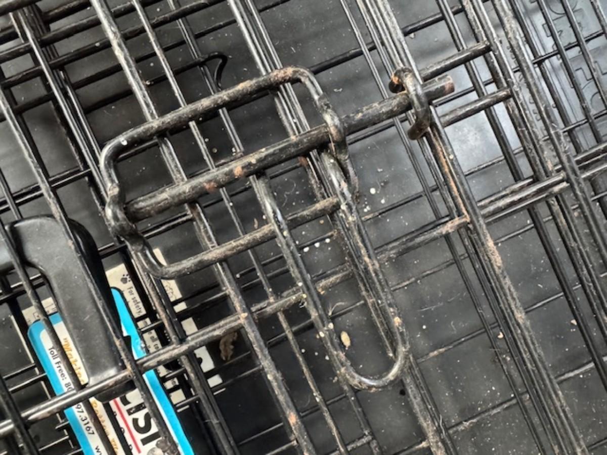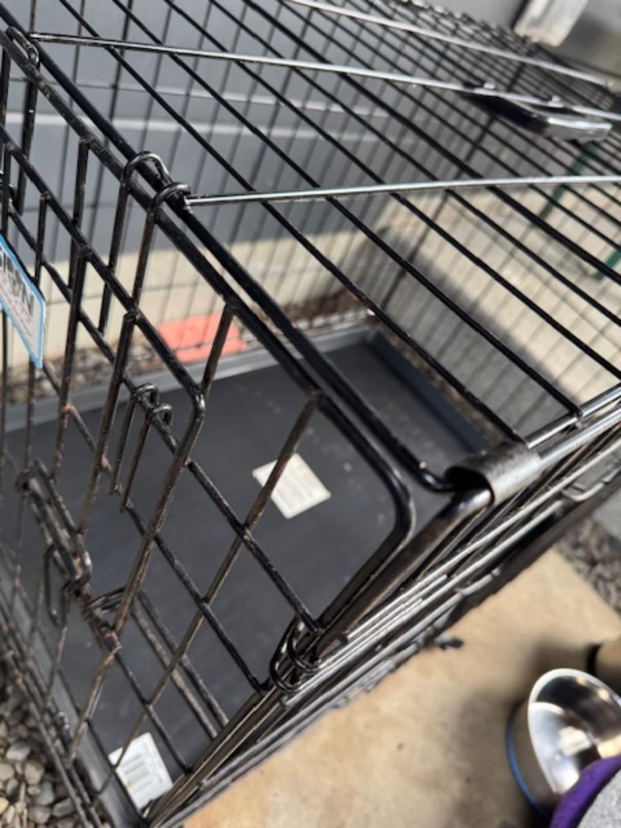 Precision Pet Products folding kennel - W 30" x D 19" x H 21" has a handle on top and removeable lower tray for cleaning. (Has a little bit of rust present.) 2 non matching bowls, "WOOF" food bowl mat, 1 leash with 2 hooks and holding grip, and a pet hair remover from pethairgone.com.
