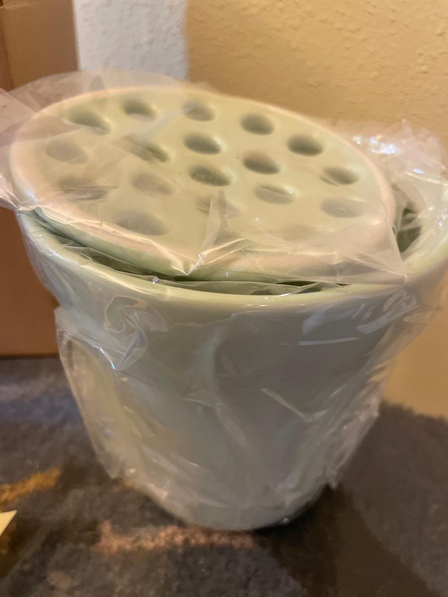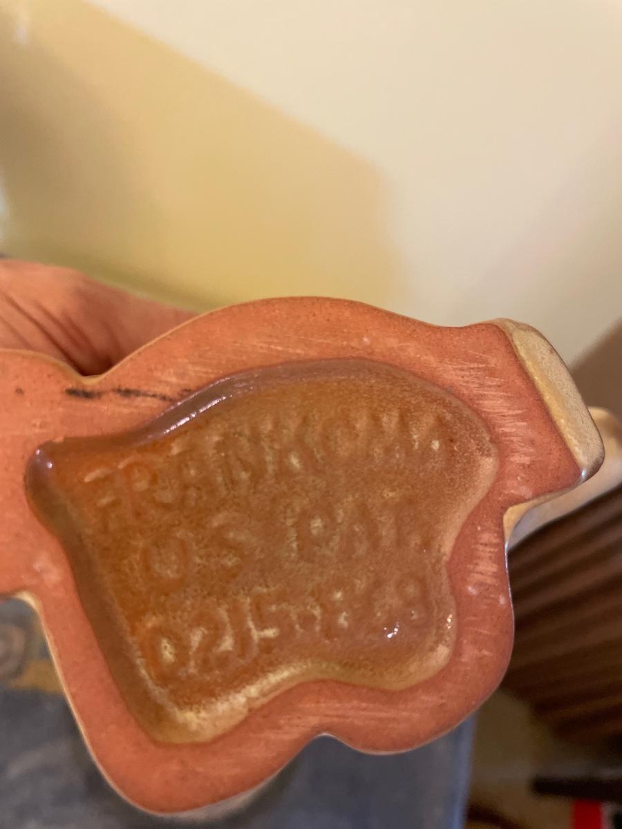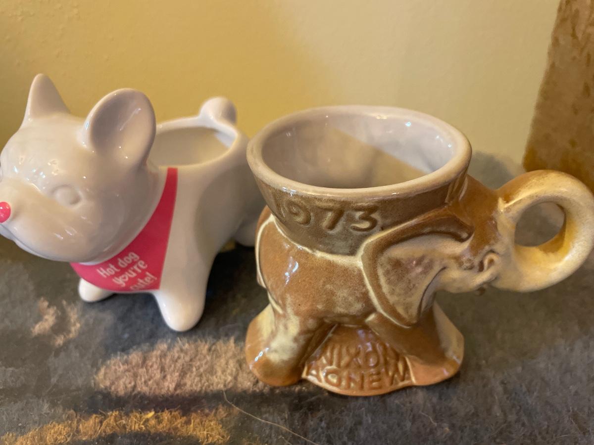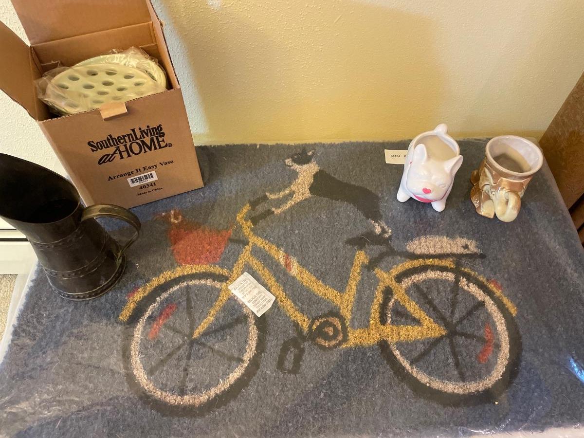 Garnet Hill door mat in plastic, dog pot with Frankoma elephant vase & 2 others