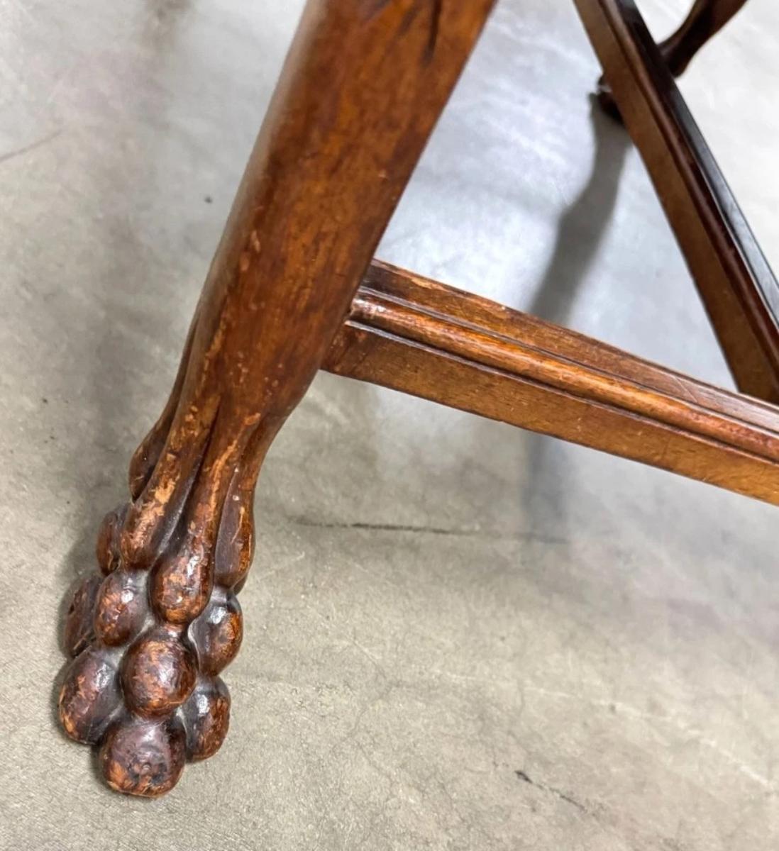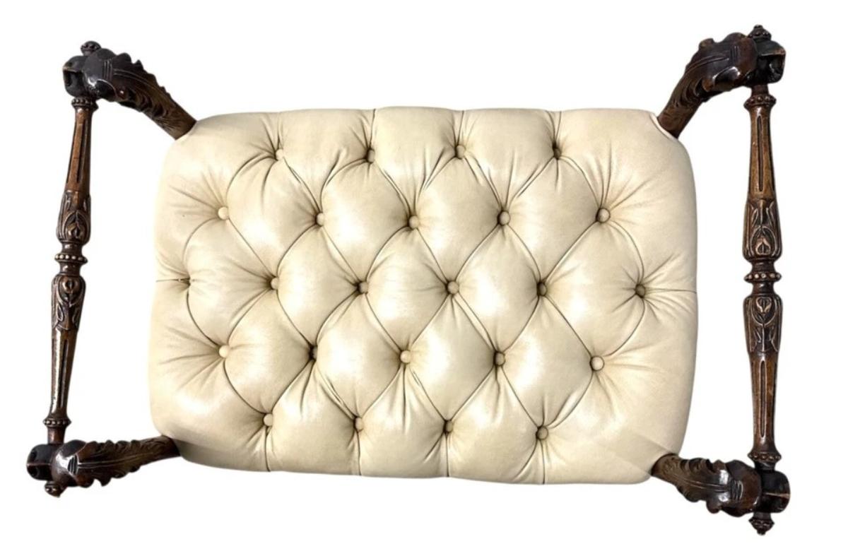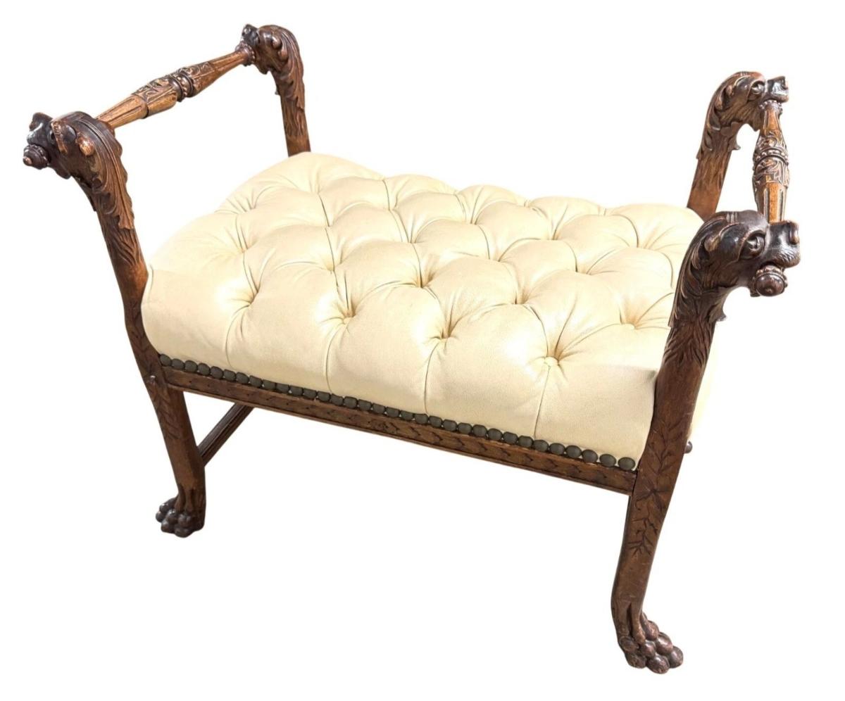 Antique English dog Face Carving Mahogany Wood Leather Bench 28" x 17" x 23"