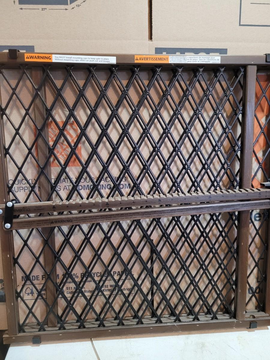 Expanding dog gate No mounting caps---my dogs ate them, they are animals. Gate is in good shape