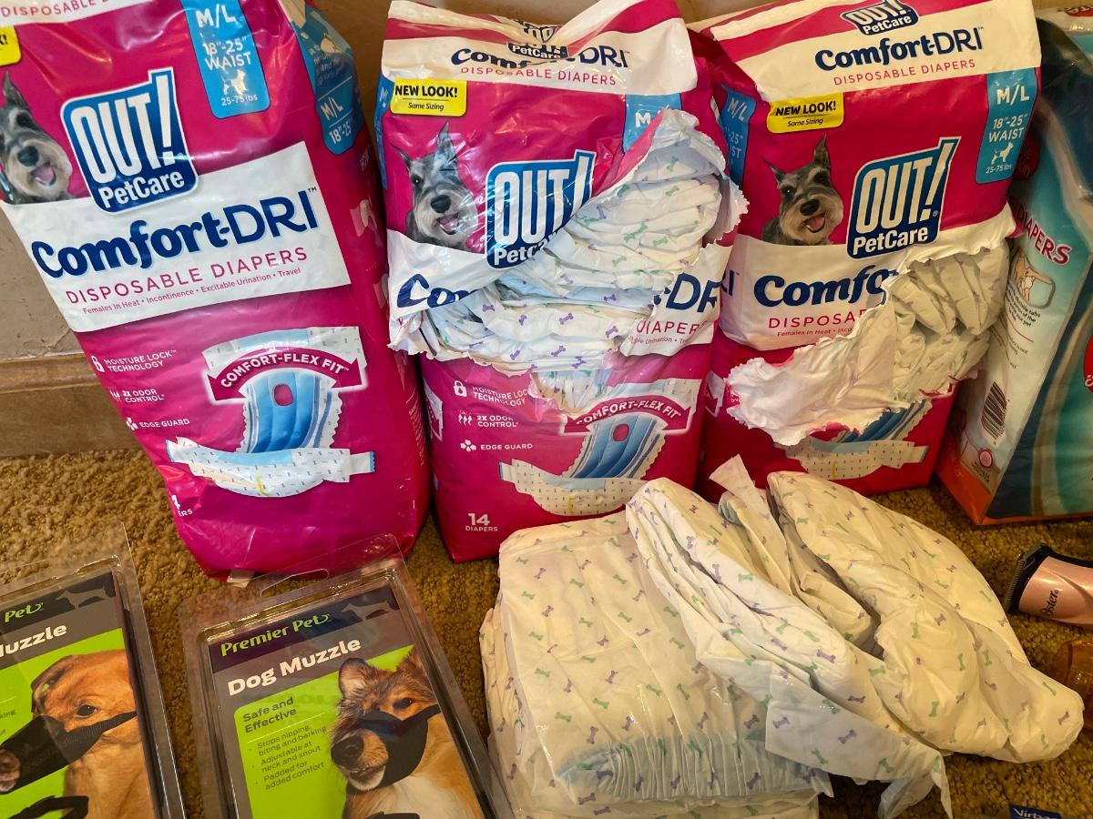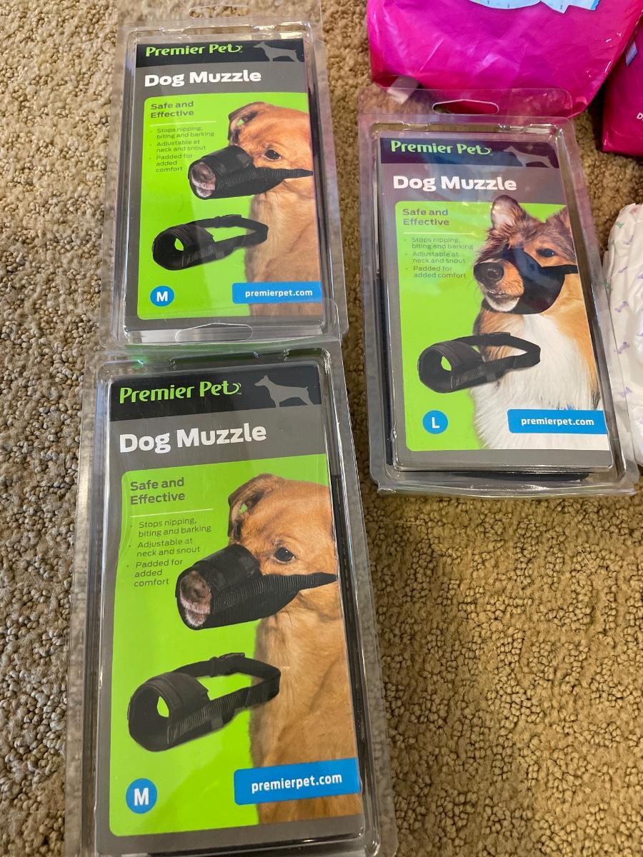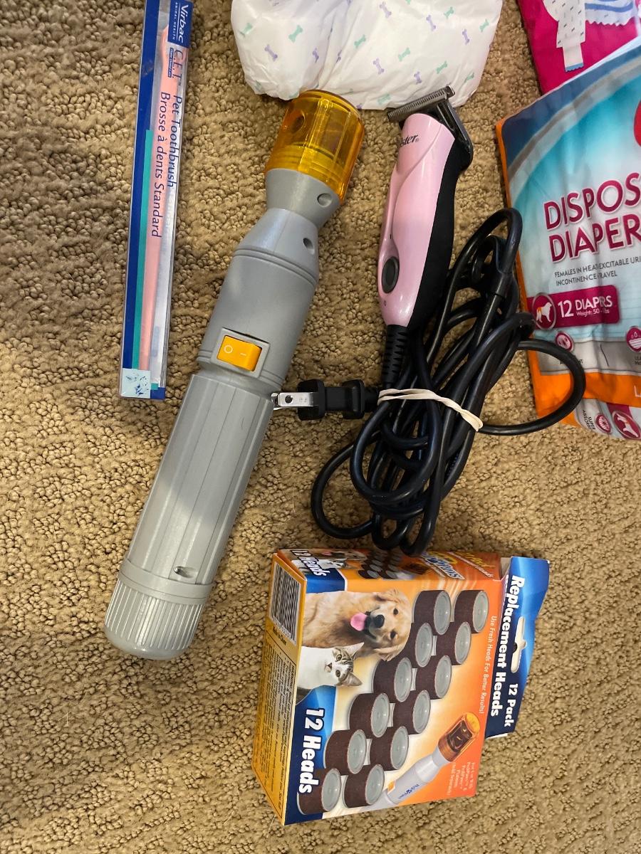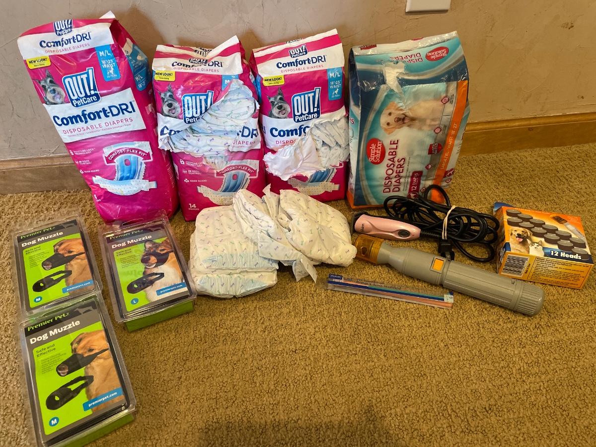 Size M/L diapers, muzzles, Pedi-Paws and refills, shaver and toothbrush