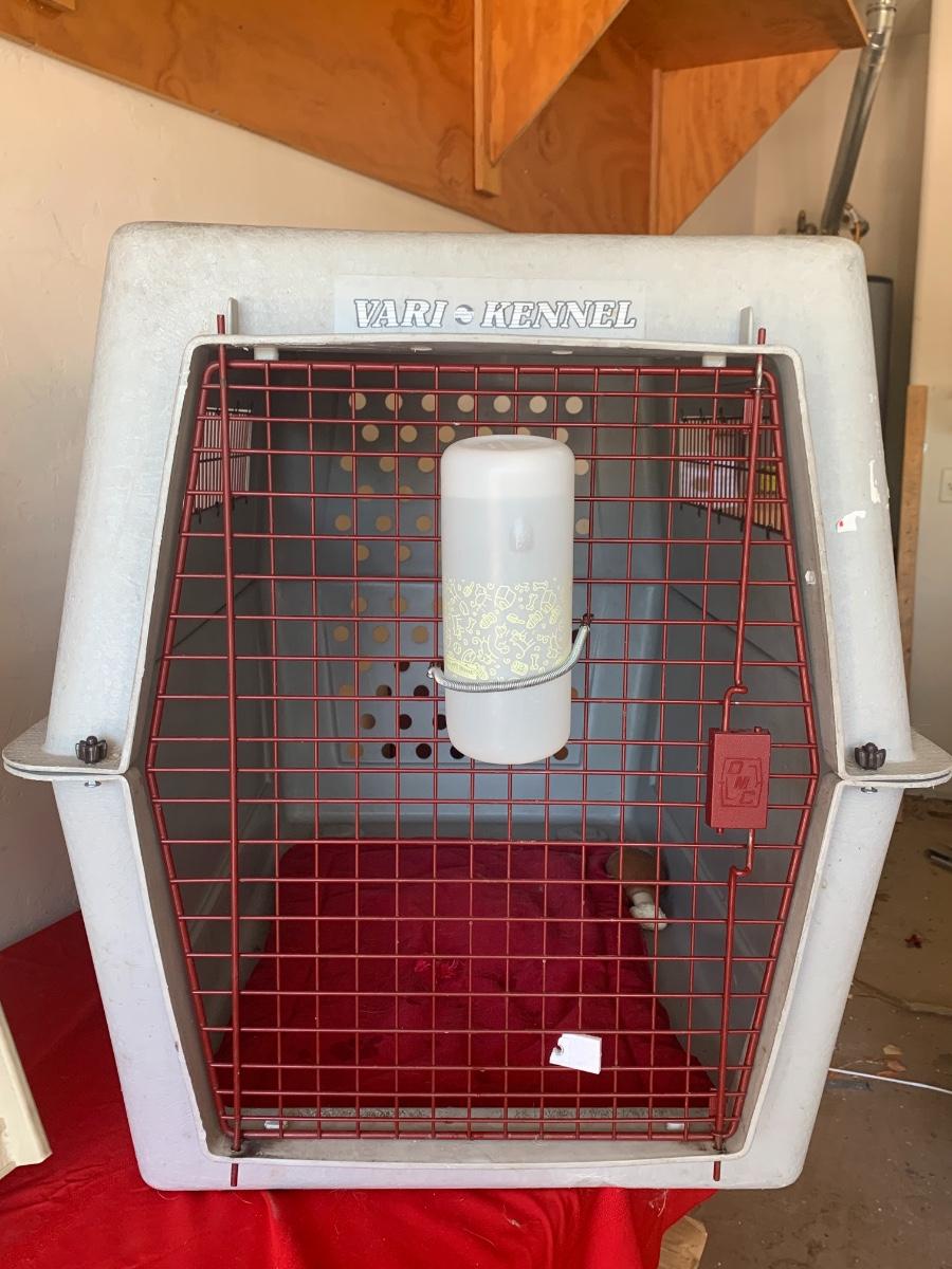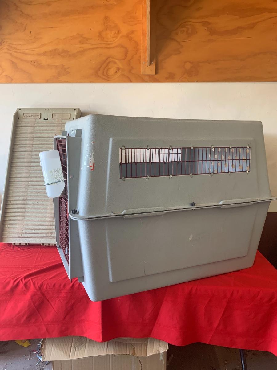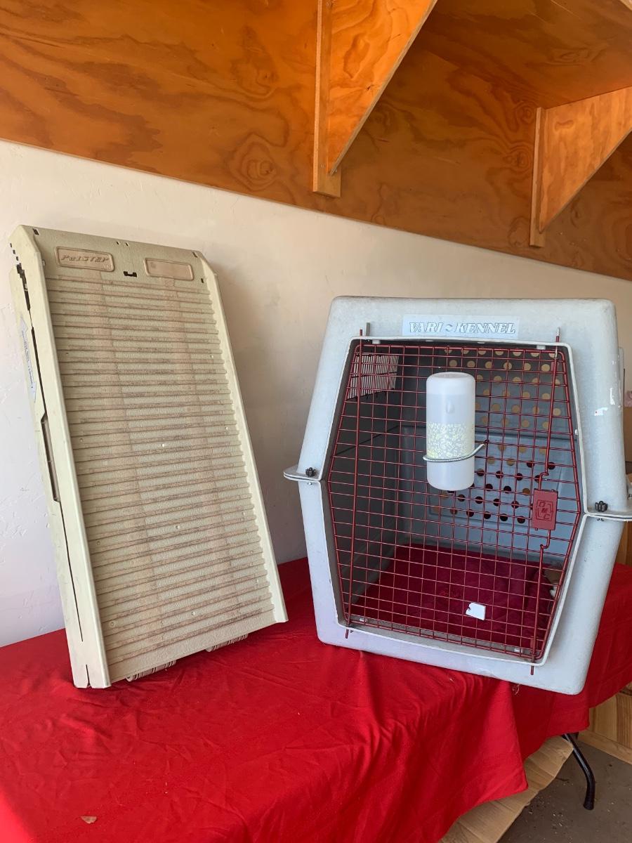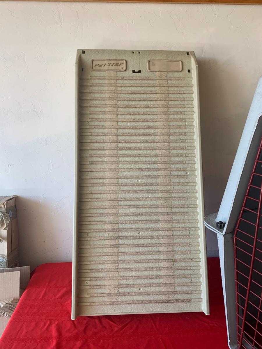 Pet Step plastic foldable dog ramp. Also a large VARI- KENNEL 27” w x 31” tall x 43” long. All in used condition.