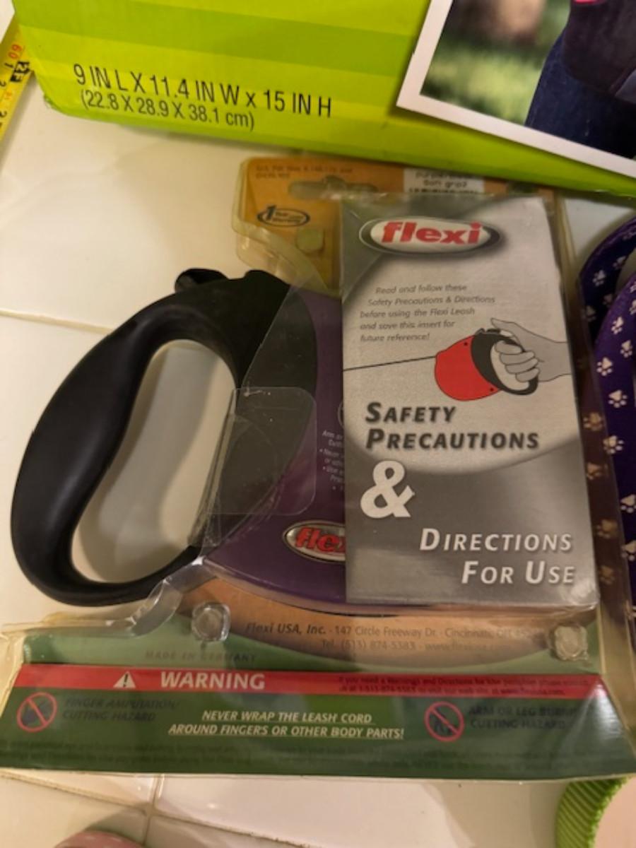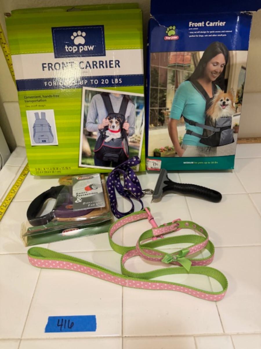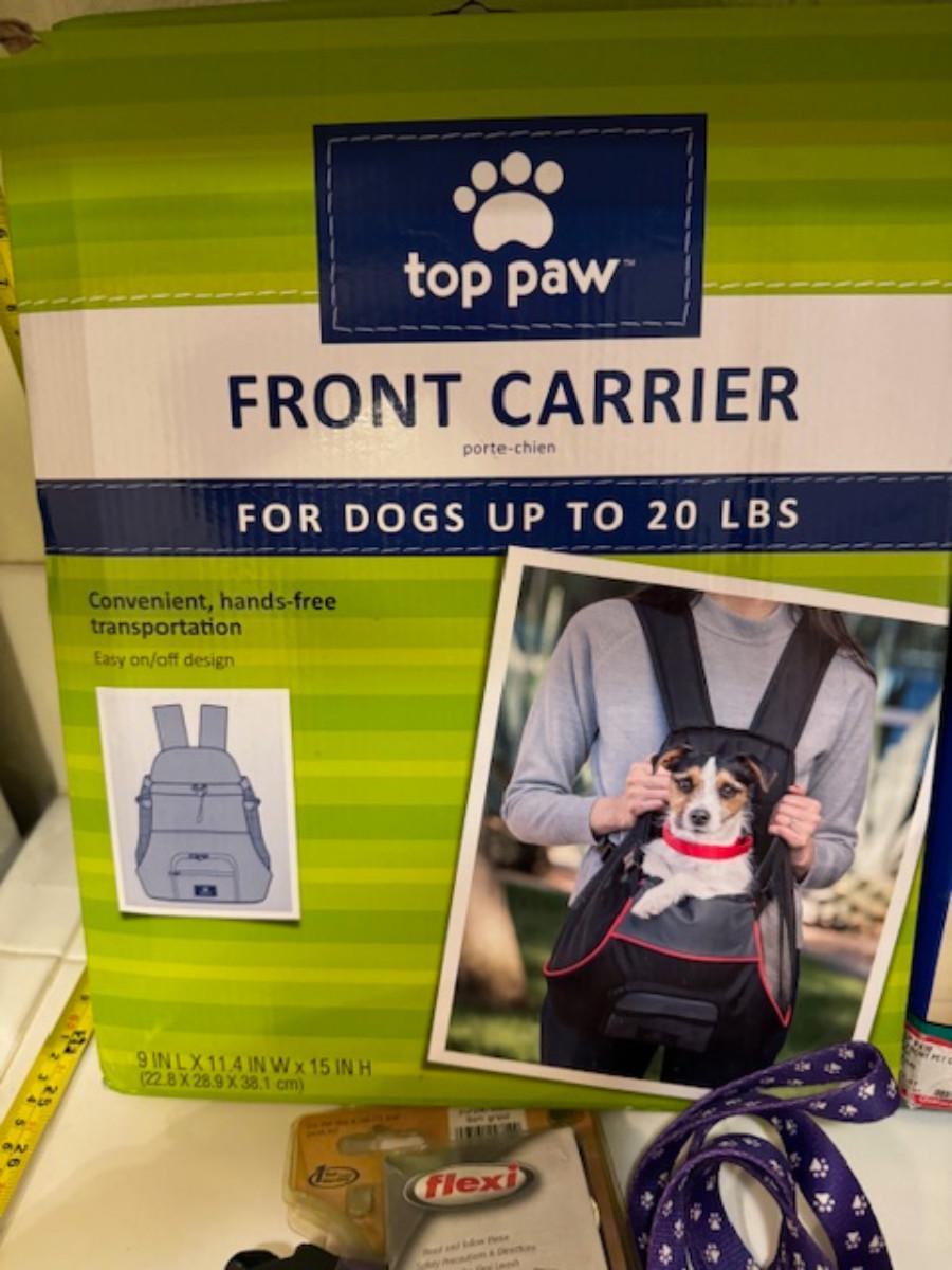 2x Top Paw front carrier up to 20lbs, Flexi retractable leash up to 44 lbs, matching collar and leash, dog grooming tool, dog leash.