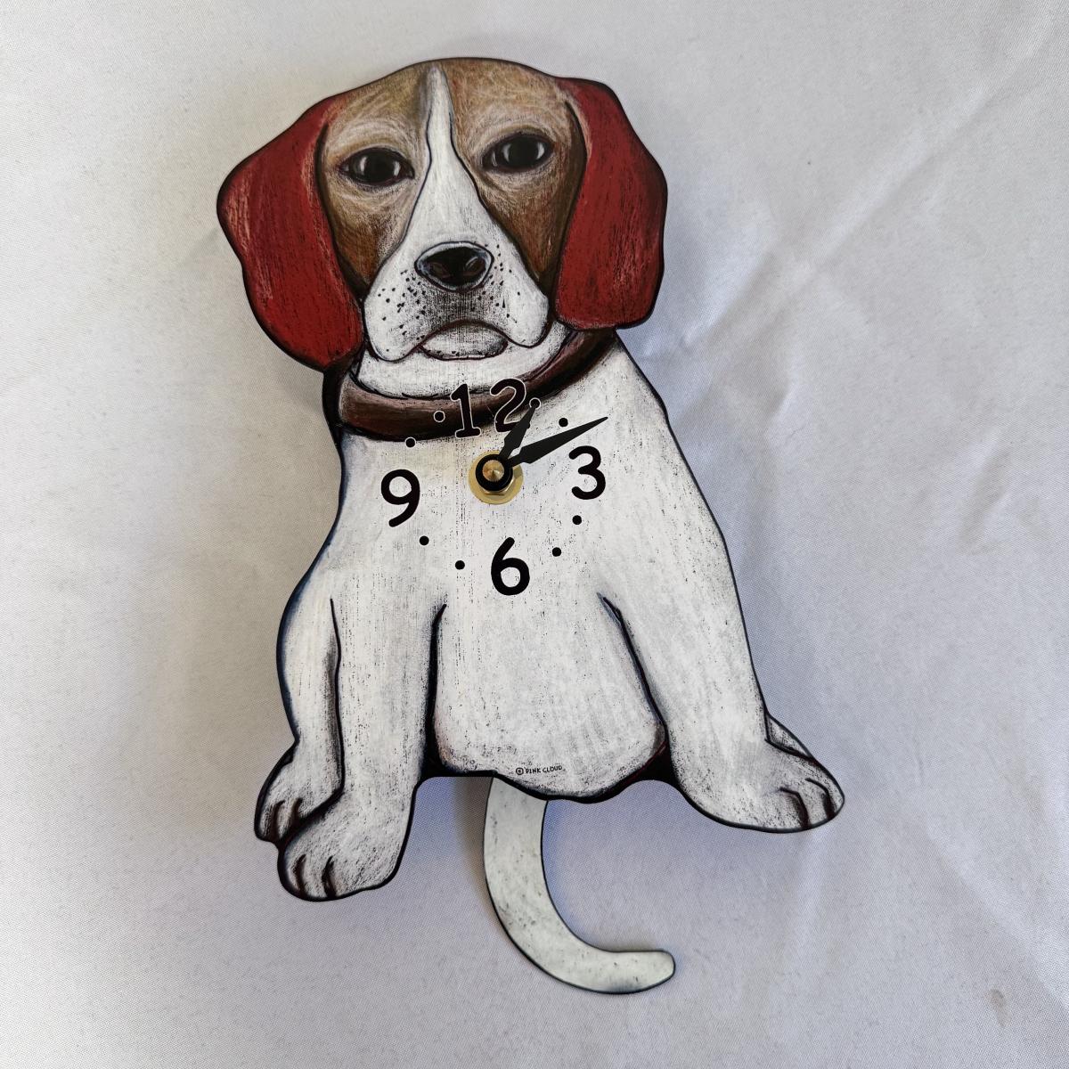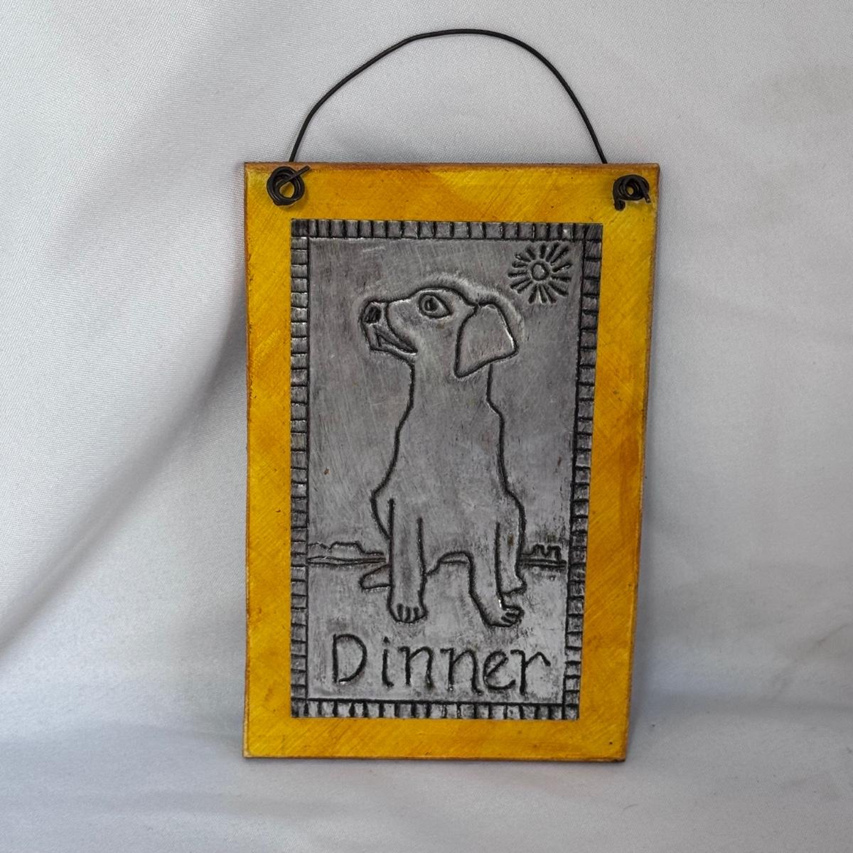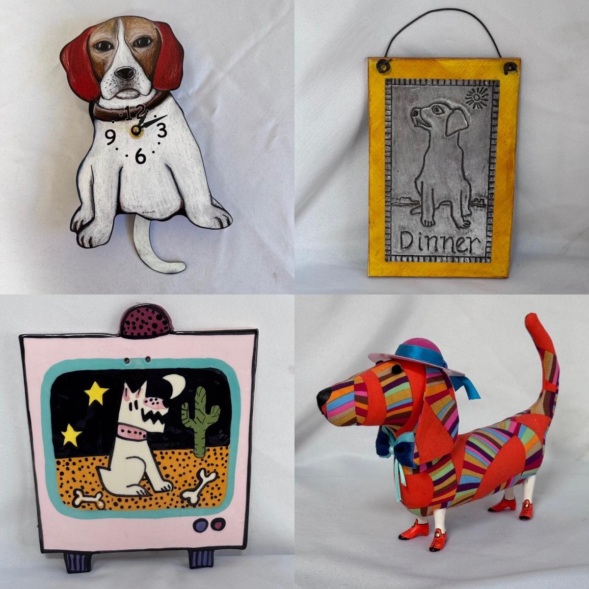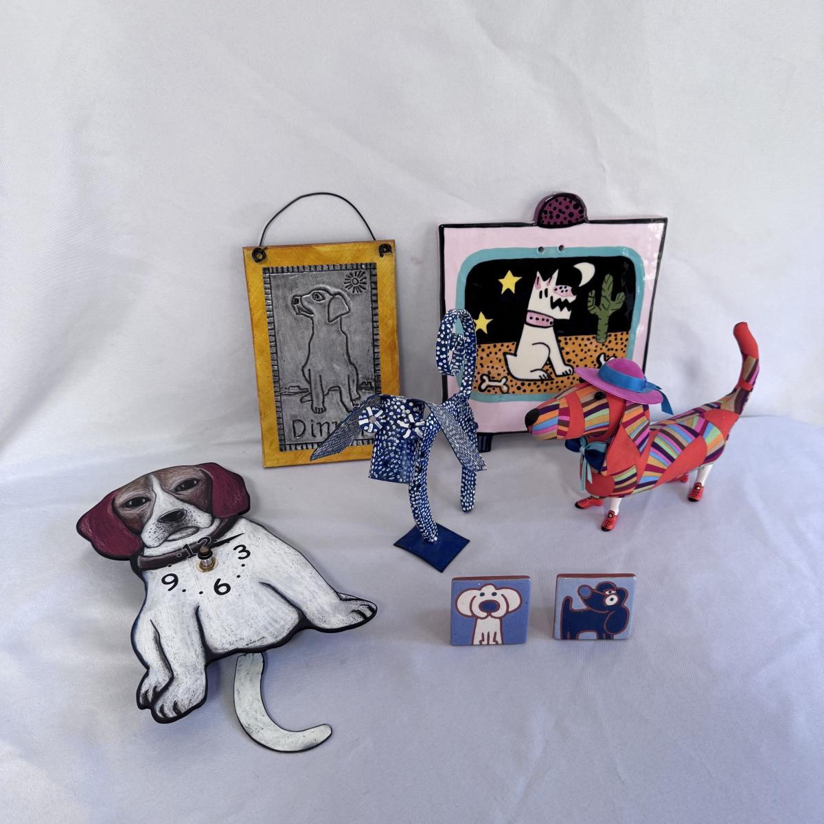 This lot was created for the dog lovers out there. You’ll find one adorable dog clock with a wagging tail, one ceramic dog folk art, one wooden hanging dog sign that reads “dinner,” and one stuffed dog figurine in vibrant colors. You’ll also find one blue metal dog sculpture and two small ceramic tiles with dogs painted on the front. The dog clock has been tested and works. It takes one AA battery to operate. The largest piece is the clock that measures 6.5” x 11” x 1”H. Shipping available.