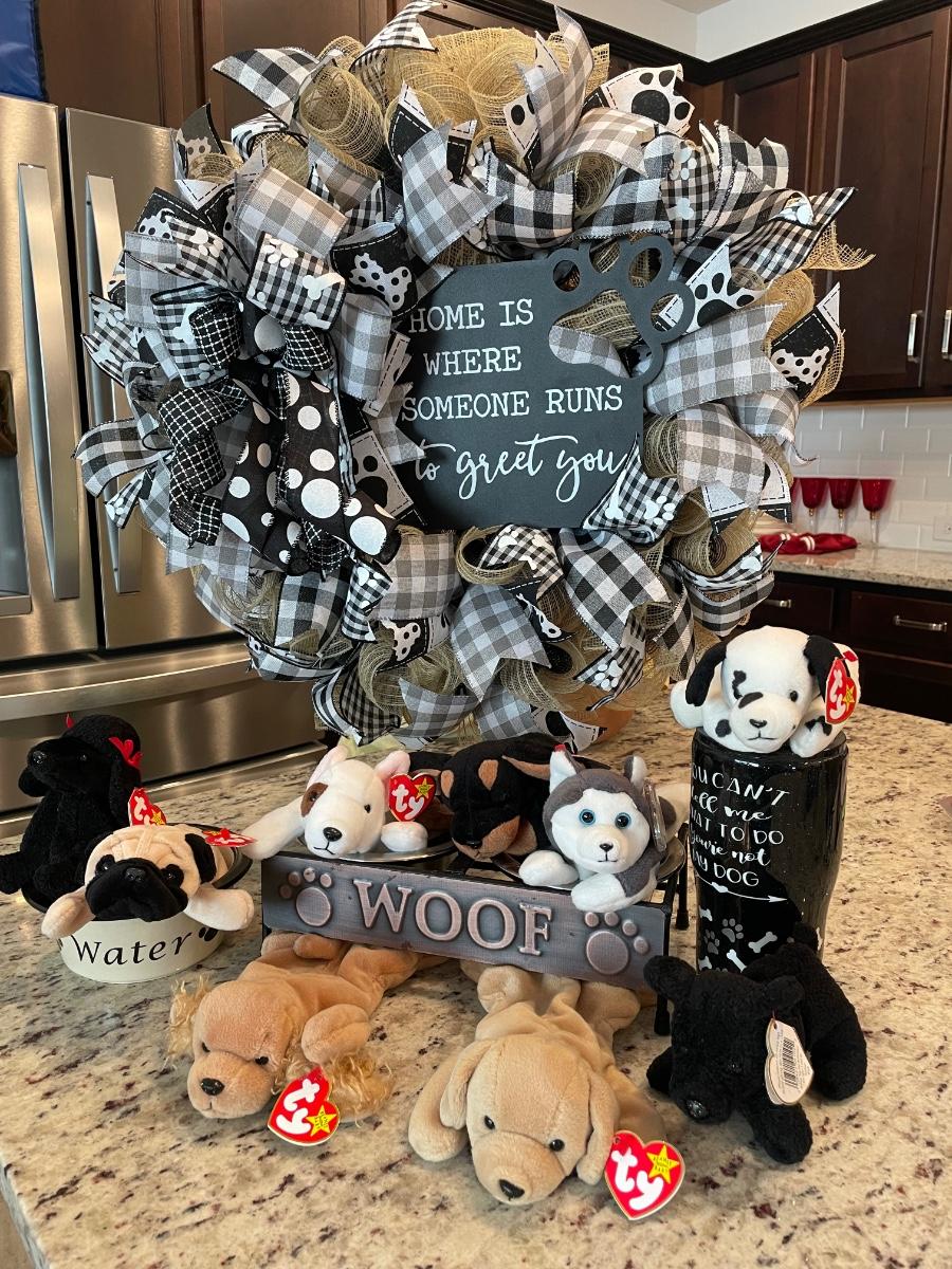 Dog lovers lot! Cute door wreath, cup, bowls, beanie babies
